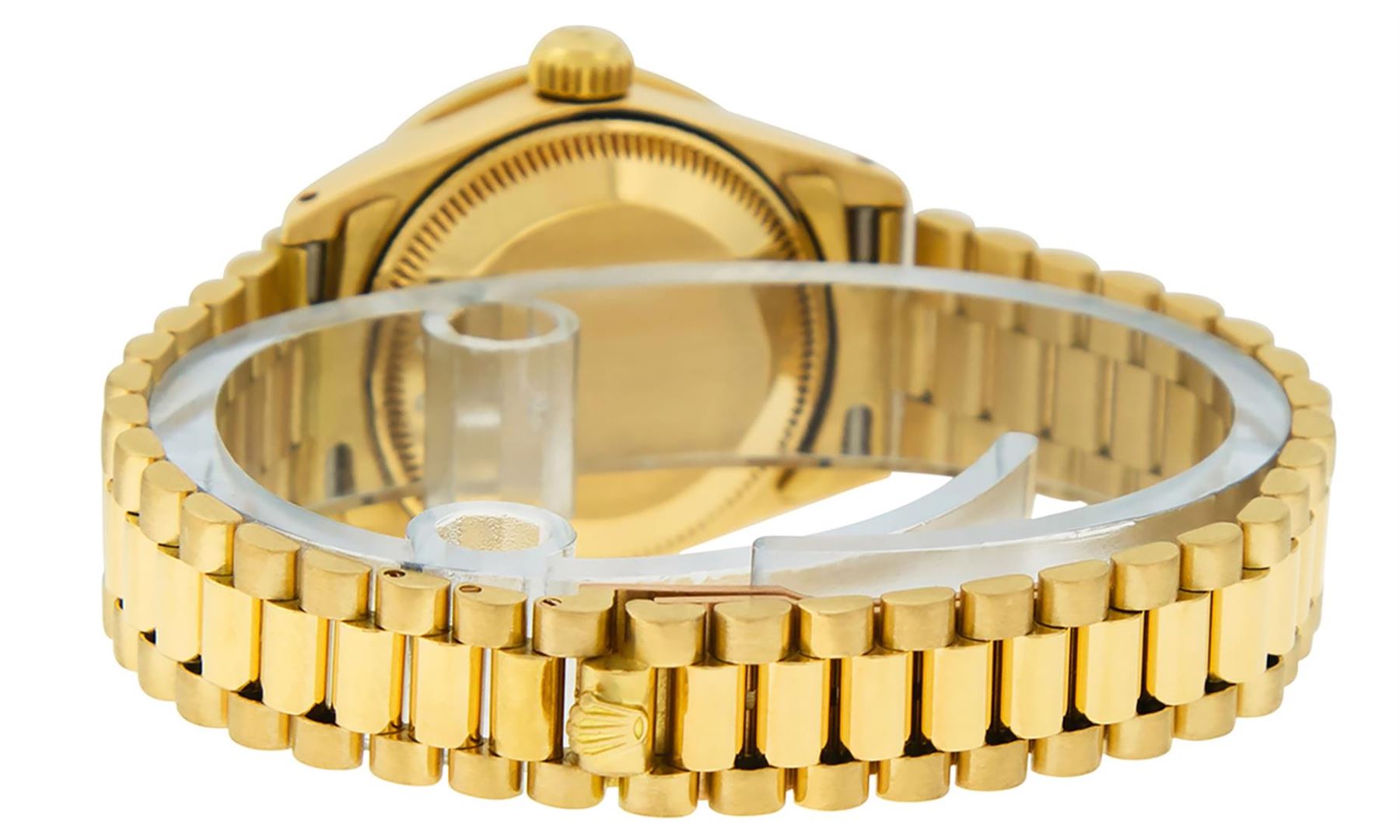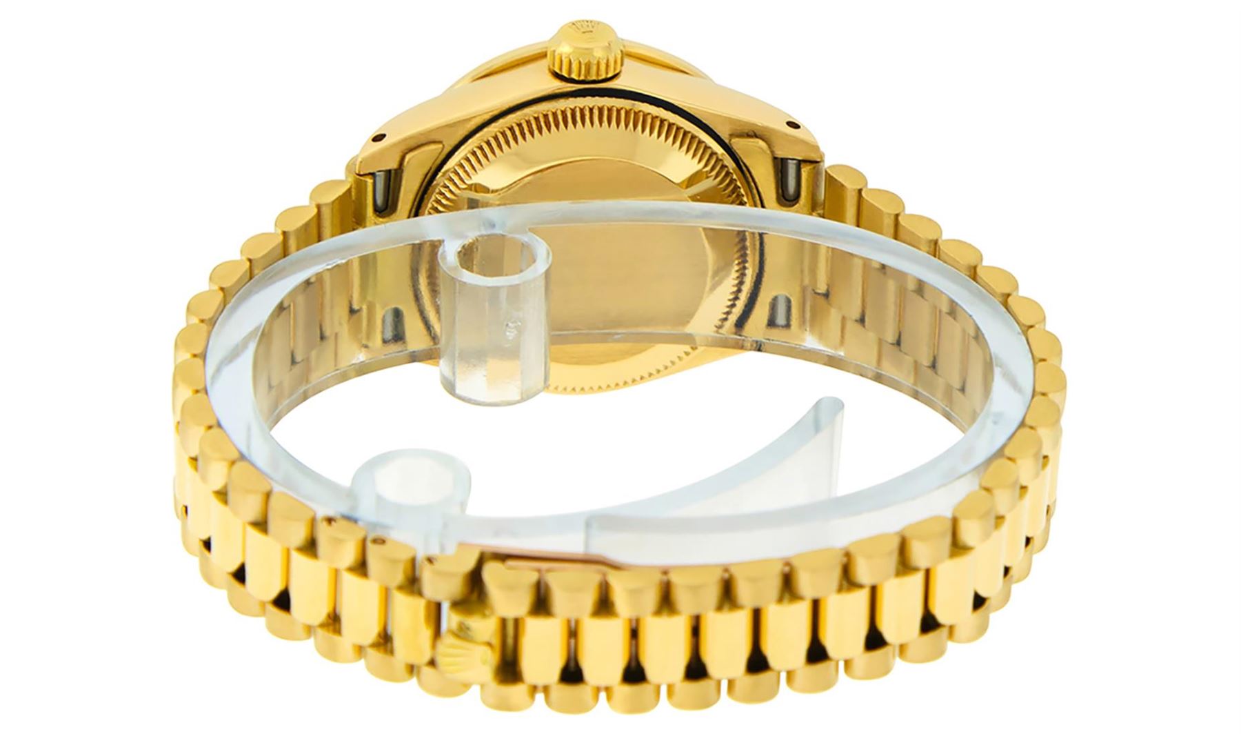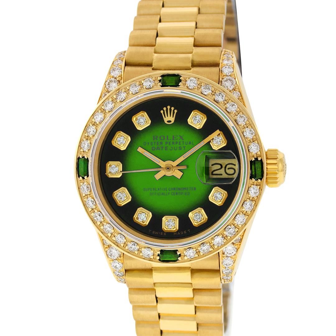 One Ladies Rolex President Polished, Serviced & Electronically Tested, 18K Yellow Gold Case With Diamond Lugs: 26mm G to H In Color, SI1, Yellow Gold Crown, Custom Diamond Lugs: 24 Diamonds On Lugs, Clarity: SI-VS, Color: G to H, Clarity SI-VS. Custom Bezel: 18K Yellow Gold Emerald Beadset Diamond Bezel, Diamond + Gem Count: 36 Diamonds + 4 Emeralds, Total Weight .70 Carat, Clarity: SI-VS, Color: G to H. Custom Crystal: New Scratch Resistant Synthetic Sapphire Cyclops Lens. Custom Hands: New Luminescent Hands. Movement: Automatic Winding Movement. Custom Dial: Refinished Green Vignette With Diamond Hour Markers, Color: G To H. Clarity: SI-VS. Date Window: 3 O'Clock Position, Model: Datejust, Condition: G-6 Extra Fine. Bracelet: 18K Yellow Gold President Band, Bright & Satin Polish. 6.0 Inch Length, Standard President Clasp (Hidden Clasp), With Rolex Logo. This Watch Has Been Serviced Time Tested And Is In Excellent Condition It Is Free Of All Scratches And Dents. This Watch Comes With A Rolex Box.