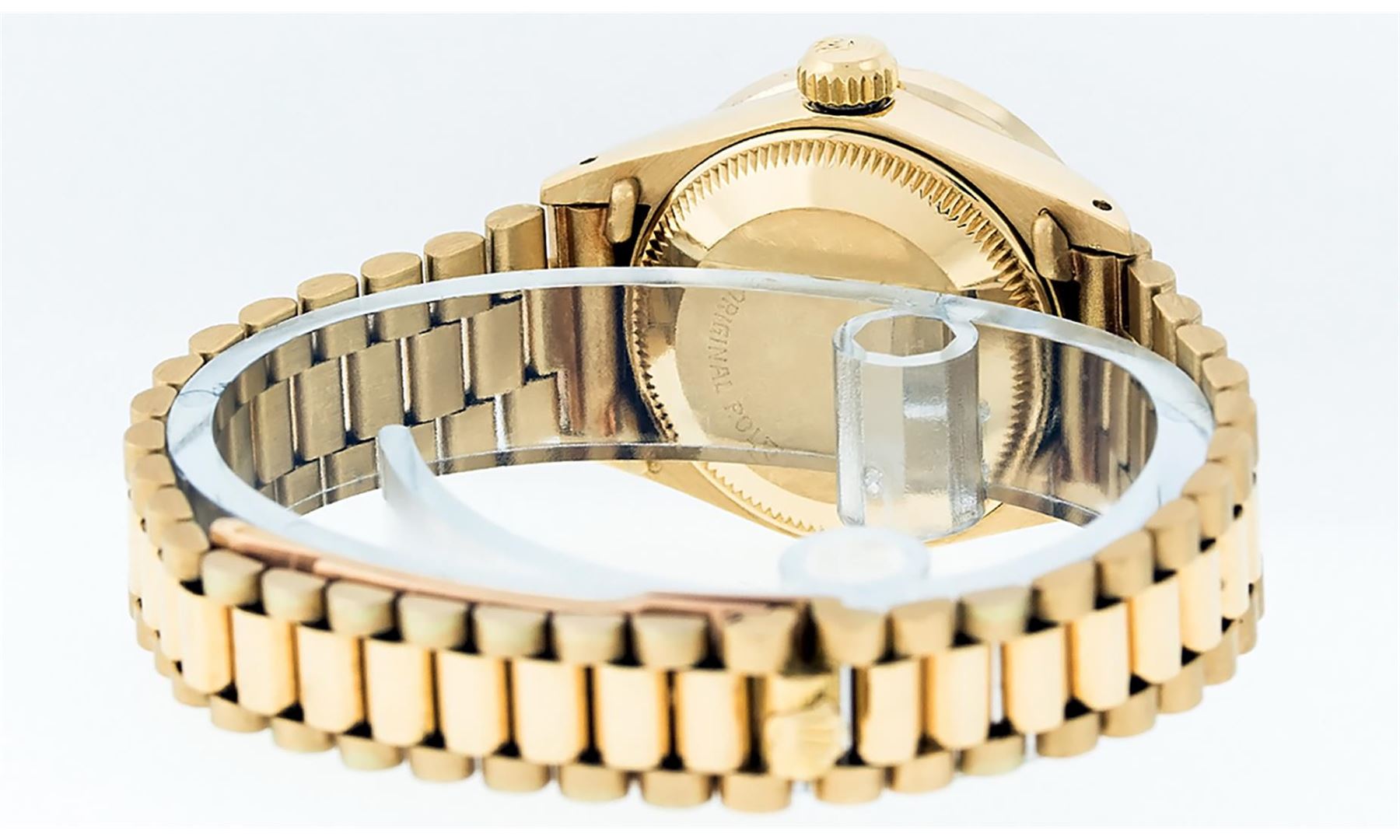 One Ladies 18K Yellow Gold Rolex President Polished, Serviced & Electronically Tested, Yellow Gold Case: 26mm, 18K Yellow Gold Crown, Custom Bezel: New 18K Yellow Gold Pyramid Diamond Bezel, Diamond Count: 24 Diamonds In Bezel. Total Weight .50 Carat, Clarity: SI-VS, Color: G to H. Custom Crystal: New Scratch Resistant Synthetic Sapphire Cyclops Lens. Custom Hands: New Luminescent Hands. Movement: Automatic Winding Movement Caliber 2030. Custom Dial: Refinished Mother Of Pearl Diamond Dial With Dash Track. Date Window: 3 O'Clock Position, Model: Datejust President, Condition: G-6 Extra Fine. Bracelet: 18K Yellow Gold President With Hidden Clasp, Bright & Satin Polish. 6.0 Inch Length, Standard President Clasp (Hidden Clasp), With Rolex Logo. Watch Has Been Serviced And Polished It Is Free Of All Scratches And Dents. This Watch Comes With A Watch Winder & Appraisal.