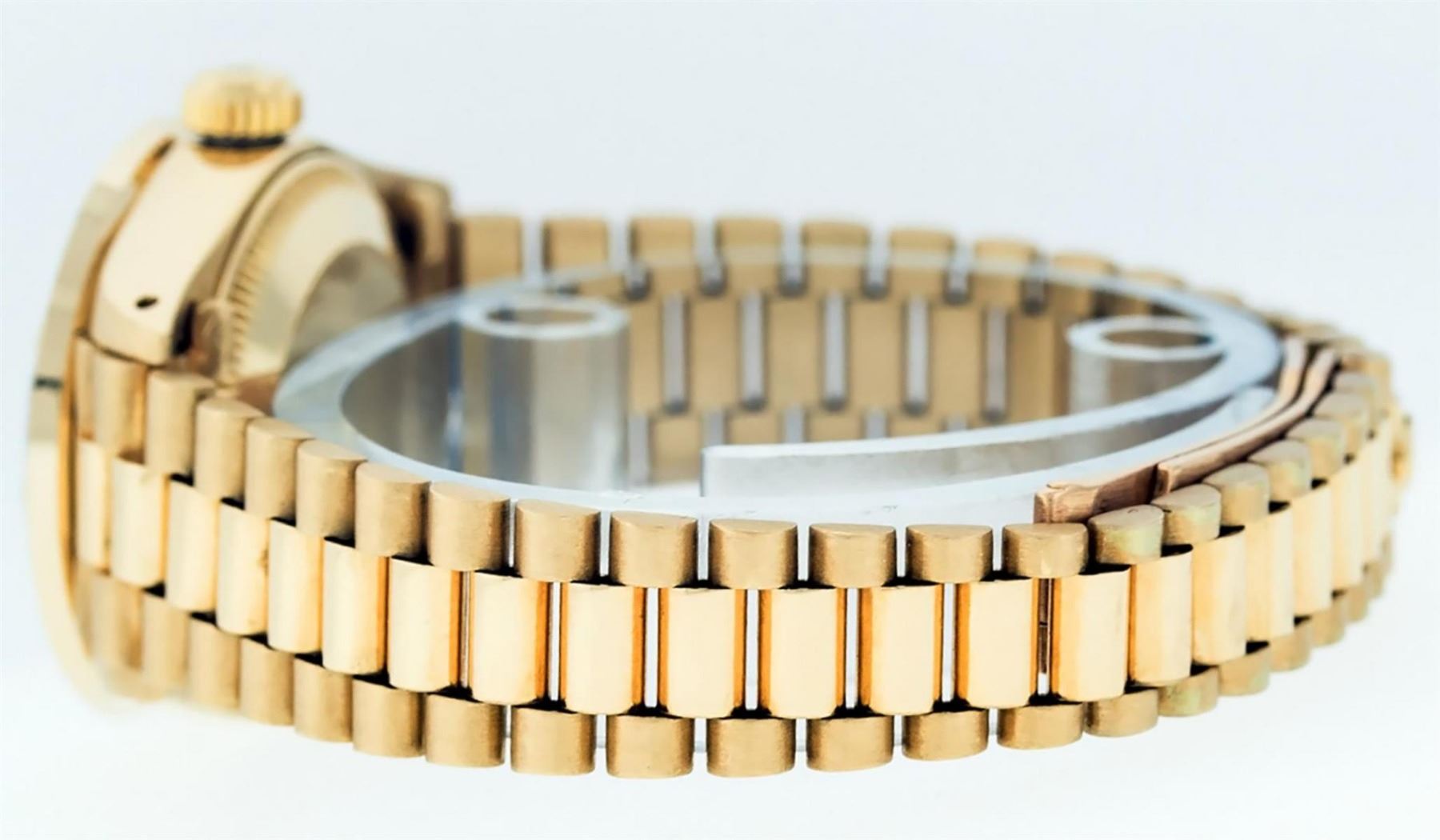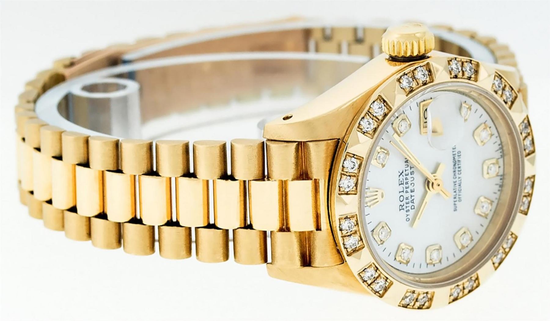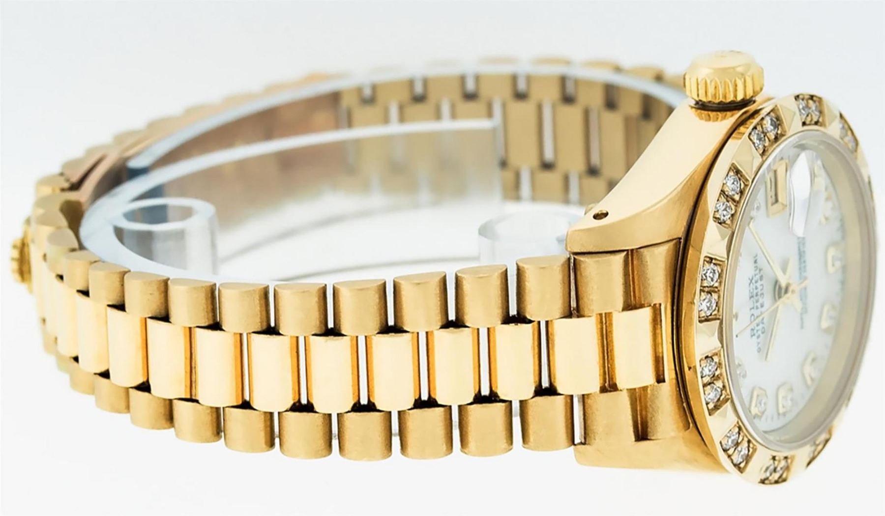 One Ladies 18K Yellow Gold Rolex President Polished, Serviced & Electronically Tested, Yellow Gold Case: 26mm, 18K Yellow Gold Crown, Custom Bezel: New 18K Yellow Gold Pyramid Diamond Bezel, Diamond Count: 24 Diamonds In Bezel. Total Weight .50 Carat, Clarity: SI-VS, Color: G to H. Custom Crystal: New Scratch Resistant Synthetic Sapphire Cyclops Lens. Custom Hands: New Luminescent Hands. Movement: Automatic Winding Movement Caliber 2030. Custom Dial: Refinished Mother Of Pearl Diamond Dial With Dash Track. Date Window: 3 O'Clock Position, Model: Datejust President, Condition: G-6 Extra Fine. Bracelet: 18K Yellow Gold President With Hidden Clasp, Bright & Satin Polish. 6.0 Inch Length, Standard President Clasp (Hidden Clasp), With Rolex Logo. Watch Has Been Serviced And Polished It Is Free Of All Scratches And Dents. This Watch Comes With A Watch Winder & Appraisal.