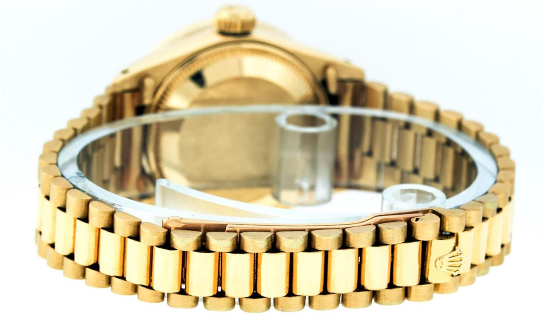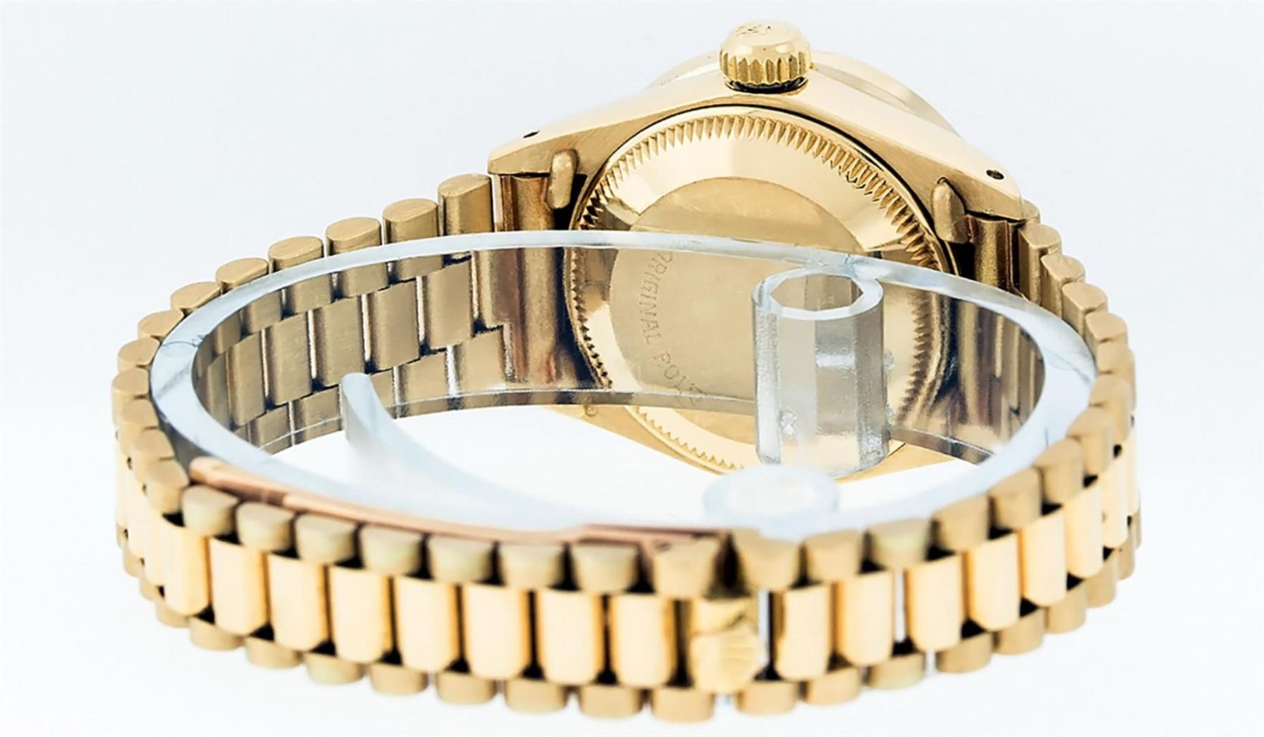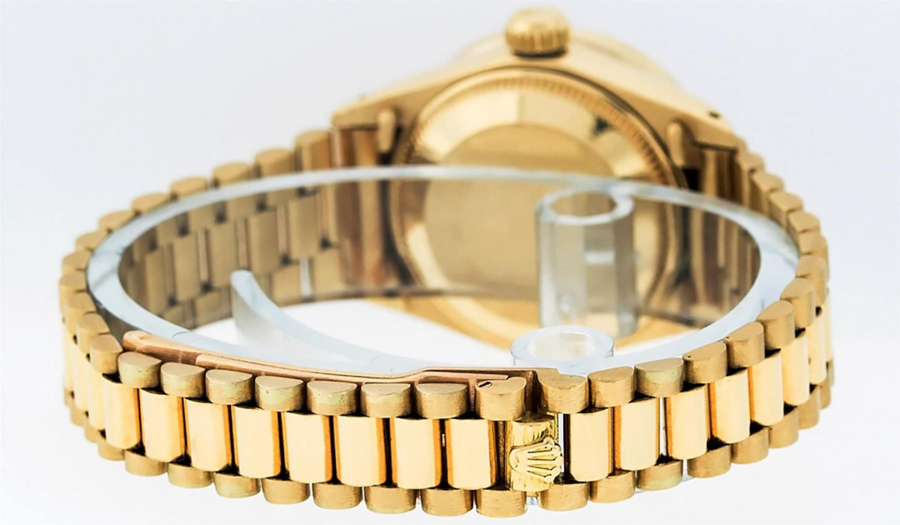 One Ladies 18K Yellow Gold Rolex President Polished, Serviced & Electronically Tested, Yellow Gold Case: 26mm, 18K Yellow Gold Crown, Custom Bezel: New 18K Yellow Gold Pyramid Diamond Bezel, Diamond Count: 24 Diamonds In Bezel. Total Weight .50 Carat, Clarity: SI-VS, Color: G to H. Custom Crystal: New Scratch Resistant Synthetic Sapphire Cyclops Lens. Custom Hands: New Luminescent Hands. Movement: Automatic Winding Movement Caliber 2030. Custom Dial: Refinished Mother Of Pearl Diamond Dial With Dash Track. Date Window: 3 O'Clock Position, Model: Datejust President, Condition: G-6 Extra Fine. Bracelet: 18K Yellow Gold President With Hidden Clasp, Bright & Satin Polish. 6.0 Inch Length, Standard President Clasp (Hidden Clasp), With Rolex Logo. Watch Has Been Serviced And Polished It Is Free Of All Scratches And Dents. This Watch Comes With A Watch Winder & Appraisal.