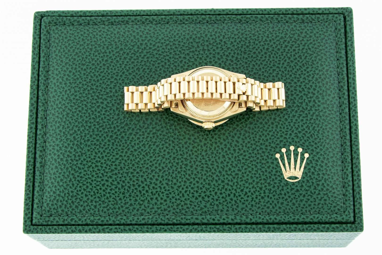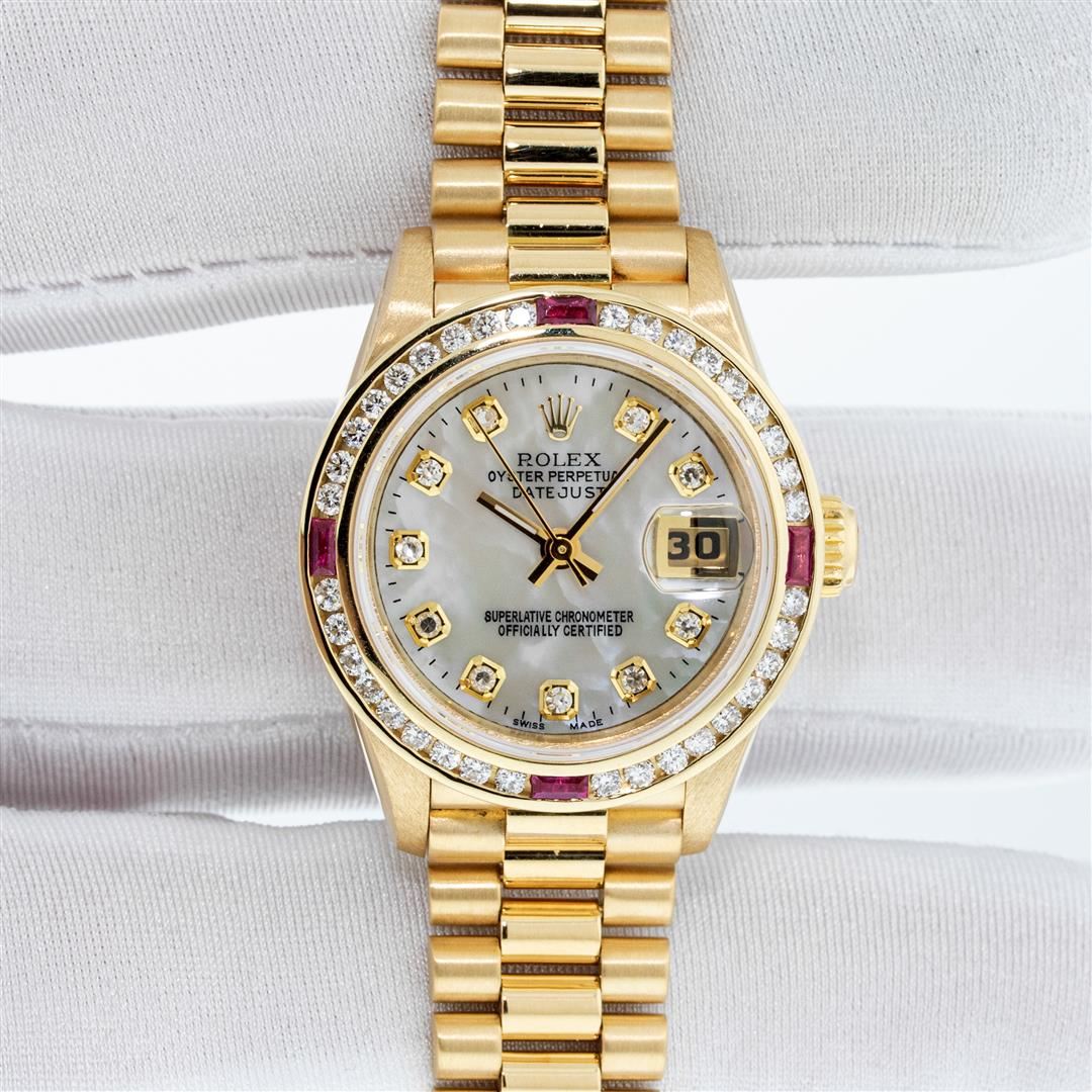 One Ladies 18K Yellow Gold Rolex President Polished, Serviced & Electronically Tested, Rolex Yellow Gold Case: 26mm, Rolex 18K Yellow Gold Crown, Custom Bezel: New 18K Yellow Gold Ruby Channel Set Diamond Bezel, Diamond + Stone Count: 36 Diamonds + 4 Rubies. Total Weight 1.00 Carat, Clarity: SI-VS, Color: G to H. Custom Crystal: New Sapphire With Magnified Date Window, New Luminescent Hands. Rolex Movement: Automatic Winding Movement. Dial: Mother Of Pearl With Custom Added Diamonds, Stone Count: 10 Diamonds In Dial, Color: G To H, Clarity: SI-VS. Date Window: 3 O'Clock Position, Model: Datejust President, Condition: G-6 Extra Fine. Rolex Bracelet: 18K Yellow Gold President With Hidden Clasp, Bright & Satin Polish. 6.0 Inch Length, Standard President Clasp (Hidden Clasp), With Rolex Logo. This Pre Owned Watch Has Been Serviced And Polished It Is Free Of All Scratches And Dents. This Watch Comes With A Rolex Box.
