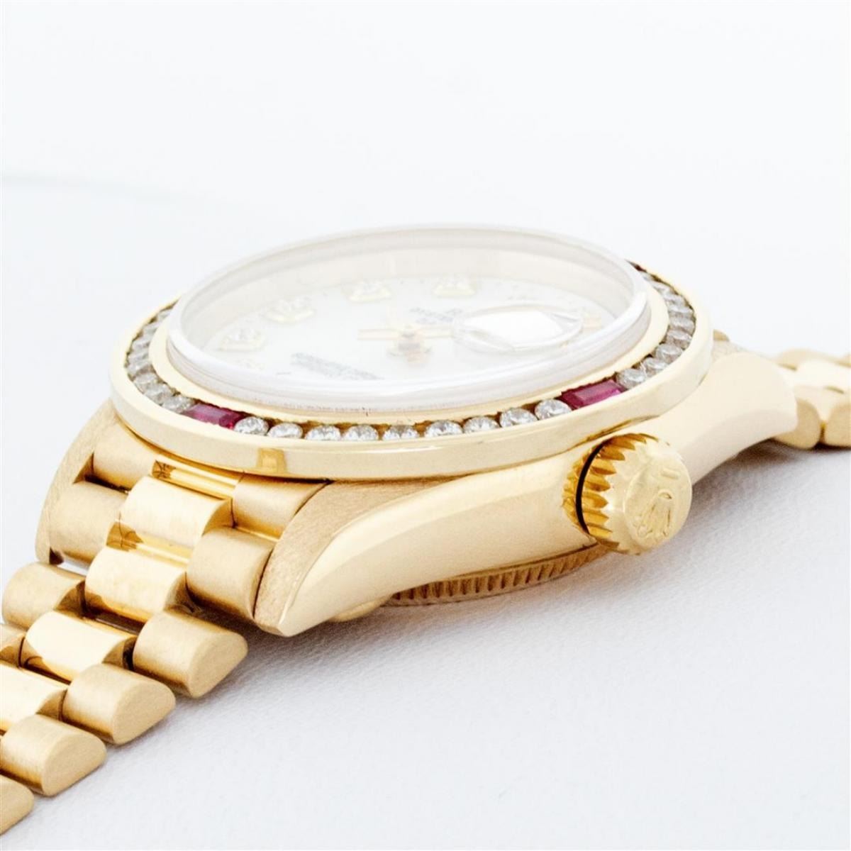 One Ladies 18K Yellow Gold Rolex President Polished, Serviced & Electronically Tested, Yellow Gold Case: 26mm, 18K Yellow Gold Crown, Custom Bezel: New 18K Yellow Gold Ruby Channel Set Diamond Bezel, Diamond + Stone Count: 36 Diamonds + 4 Rubies. Total Weight 1.00 Carat, Clarity: SI-VS, Color: G to H. Custom Crystal: New Scratch Resistant Synthetic Sapphire Cyclops Lens. Custom Hands: New Luminescent Hands. Movement: Automatic Winding Movement Caliber 2030. Dial: Refinished Mother Of Pearl With Dash Track, Stone Count: 10 Diamonds In Dial, Color: G To H, Clarity: SI-VS. Date Window: 3 O'Clock Position, Model: Datejust President, Condition: G-6 Extra Fine. Bracelet: 18K Yellow Gold President With Hidden Clasp, Bright & Satin Polish. 6.0 Inch Length, Standard President Clasp (Hidden Clasp), With Rolex Logo. Watch Has Been Serviced And Polished It Is Free Of All Scratches And Dents. This Watch Comes With A Rolex Box.