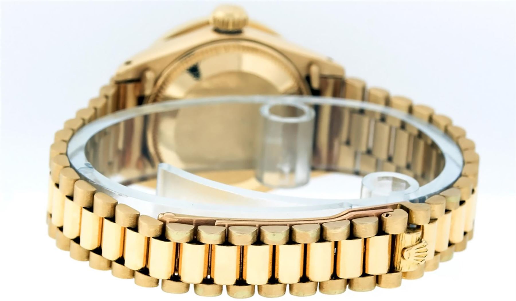 One Ladies Pre Owned 18K Yellow Gold Rolex President Polished, Serviced & Electronically Tested, Yellow Gold Case: 26mm, 18K Yellow Gold Crown, Custom Bezel: New 18K Yellow Gold Ruby Channel Set Diamond Bezel, Diamond + Stone Count: 36 Diamonds + 4 Rubies. Custom Crystal: New Sapphire With Date Window. Custom Hands: New Luminescent Hands. Rolex Movement: Automatic Winding Movement. Custom Dial: Mother Of Pearl With Dash Track, Stone Count: 10 Diamonds In Dial, Color: G To H, Clarity: SI-VS. Date Window: 3 O'Clock Position, Model: Datejust President, Condition: G-6 Extra Fine. Rolex Bracelet: 18K Yellow Gold President With Hidden Clasp, Bright & Satin Polish. 6.0 Inch Length, Standard President Clasp (Hidden Clasp), With Rolex Logo. Watch Has Been Serviced And Polished It Is Free Of All Scratches And Dents.