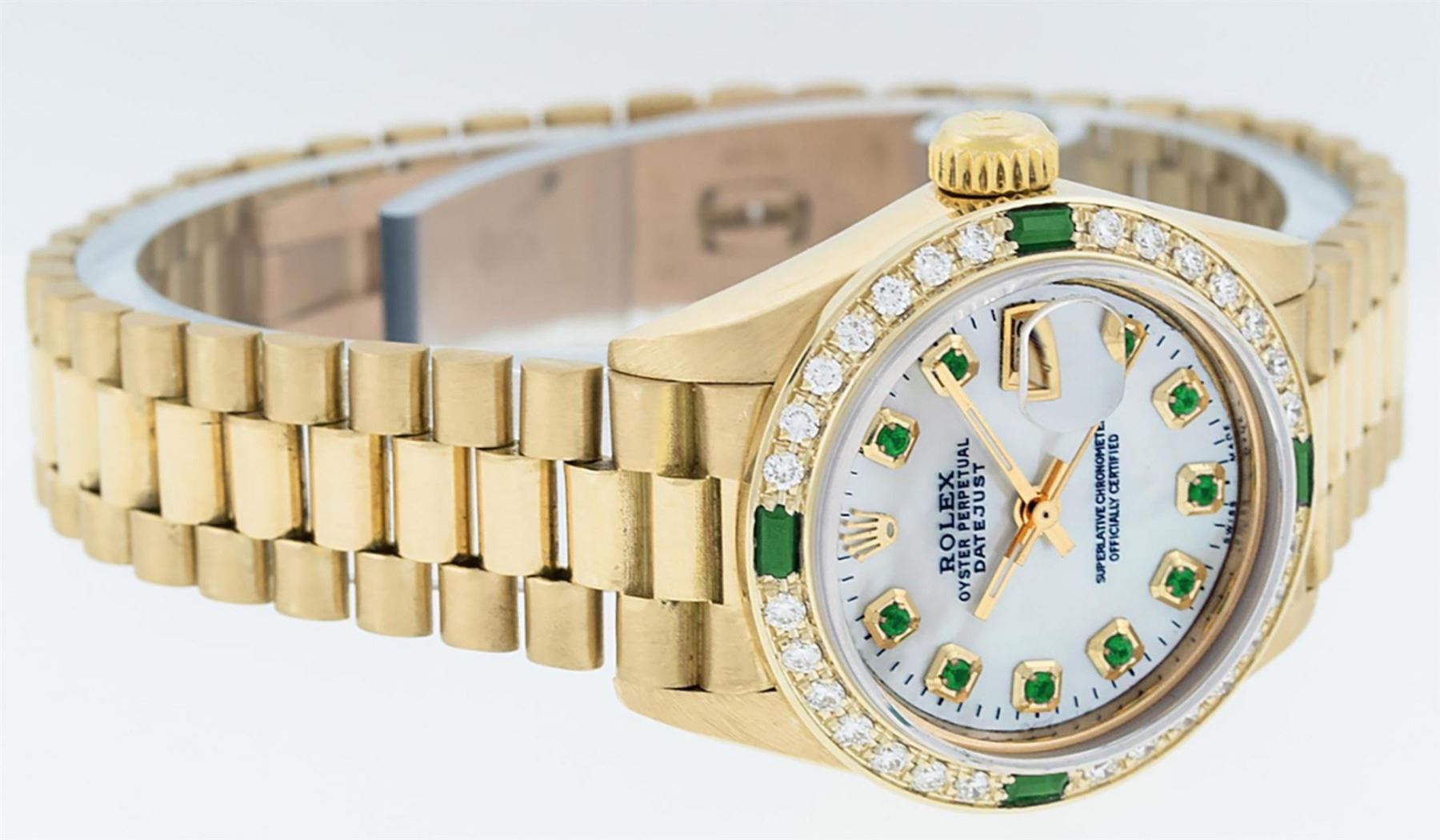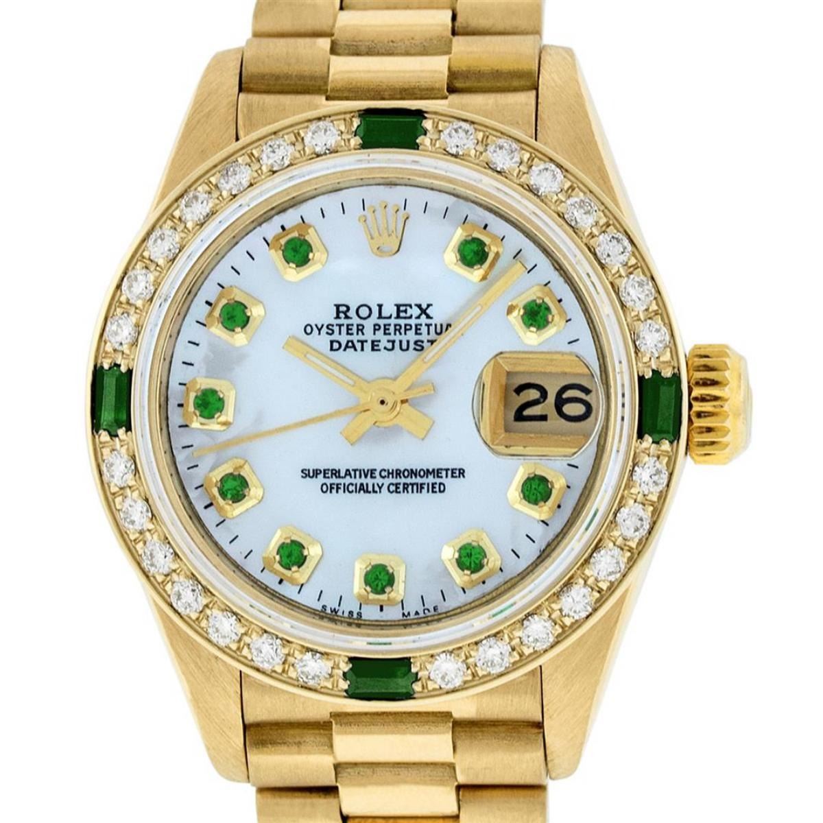 One Ladies Quickset 18K Yellow Gold Rolex President Polished, Serviced & Electronically Tested, Yellow Gold Case: 26mm, 18K Yellow Gold Crown, Custom Bezel: New 18K Yellow Gold Emerald Beadset Diamond Bezel, Diamond + Stone Count: 28 Diamonds + 4 Emeralds. Total Weight .70 Carat, Clarity: SI-VS, Color: G to H. Custom Crystal: New Scratch Resistant Synthetic Sapphire Cyclops Lens. Custom Hands: New Luminescent Hands. Movement: Automatic Winding Movement Caliber 2135. Custom Dial: Mother Of Pearl With Emerald Hour Markers With Dash Tracks, Stone Count: 10 Emeralds On Dial. Date Window: 3 O'Clock Position, Model: President, Condition: G-6 Extra Fine. Bracelet: 18K Yellow Gold President With Hidden Clasp, Bright & Satin Polish. 6.0 Inch Length, Standard President Clasp (Hidden Clasp), With Rolex Logo. Watch Has Been Serviced And Polished It Is Free Of All Scratches And Dents. This Watch Comes With A Rolex Box And Appraisal.