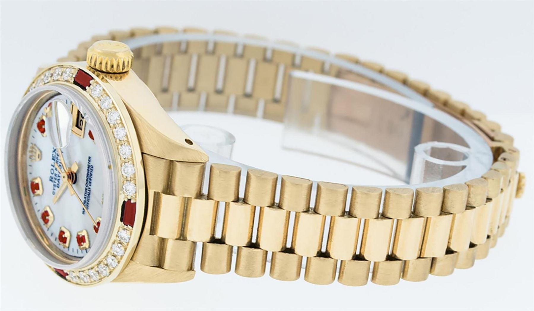 One Ladies 18K Yellow Gold Rolex President Polished, Serviced & Electronically Tested, Yellow Gold Case: 26mm, 18K Yellow Gold Crown, Custom Bezel: New 18K Yellow Gold Ruby Beadset Diamond Bezel, Diamond + Stone Count: 28 Diamonds + 4 Rubies. Total Weight .70 Carat, Clarity: SI-VS, Color: G to H. Custom Crystal: New Synthetic Sapphire Cyclops Lens. Custom Hands: New Luminescent Hands. Movement: Automatic Winding Movement Caliber 2030. Custom Dial: Refinished Mother Of Pearl With Ruby Hour Markers, Stone Count: 10 Rubies In Dial. Date Window: 3 O'Clock Position, Model: President, Condition: G-6 Extra Fine. Bracelet: 18K Yellow Gold President With Hidden Clasp, Bright & Satin Polish. 6.0 Inch Length, Standard President Clasp (Hidden Clasp), With Rolex Logo. Watch Has Been Serviced And Polished It Is Free Of All Scratches And Dents. This Watch Comes With A Rolex Box & 3rd Party Appraisal.