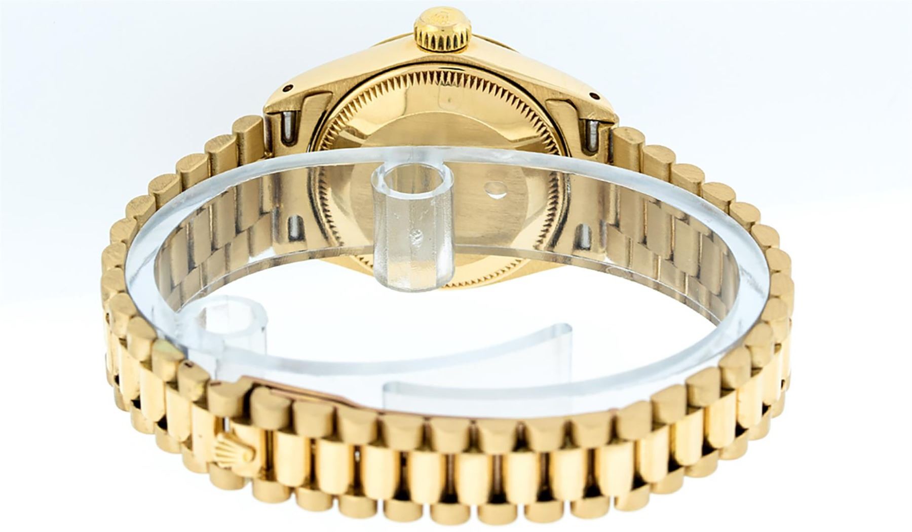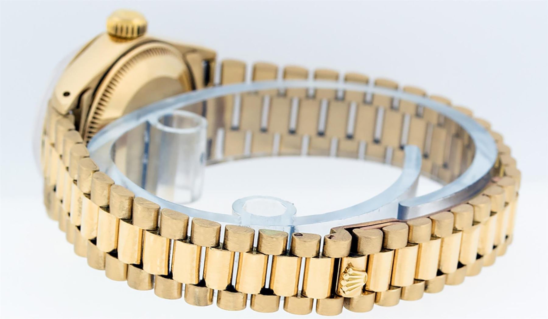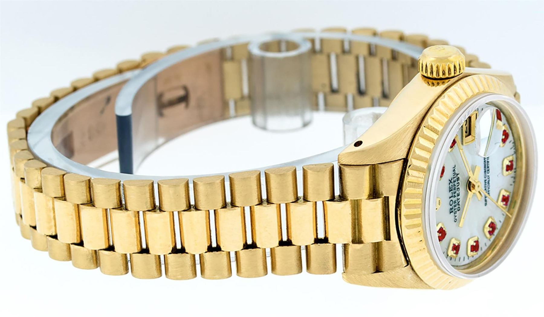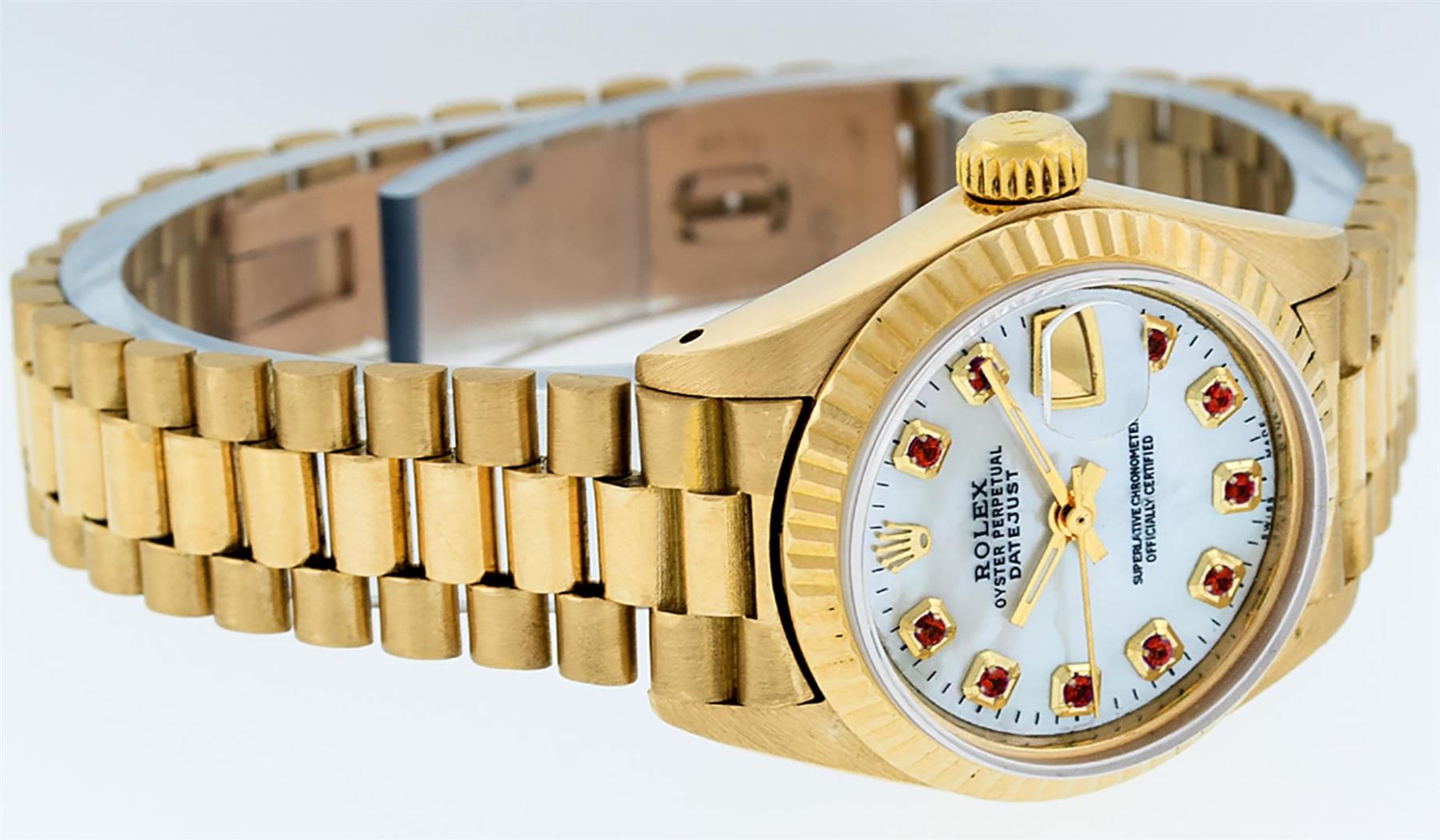 One Ladies Pre Owned Rolex 18K Yellow Gold President Polished, Serviced & Electronically Tested, 18K Yellow Gold Case: 26mm, 18K Yellow Gold Crown, Bezel: 18K Yellow Gold Fluted Bezel. Custom Crystal: New Acrylic Cyclops Lens. Custom Hands: New Luminescent Hands. Movement: Automatic Winding Movement. Custom Dial: Refinished To Mother Of Pearl With Custom Synthetic Ruby Hour Markets, Stone Count: 10 Rubies On Dial. Date Window: 3 O'Clock Position, Model: Datejust. Condition: G-6 Extra Fine The Watch Is In Very Good Condition Free Of All Scratches And Dents. Bracelet: 18K Yellow Gold President Band, Bright & Satin Polish. 6.0 Inch Length, Standard President Clasp (Hidden Clasp), With Rolex Logo.