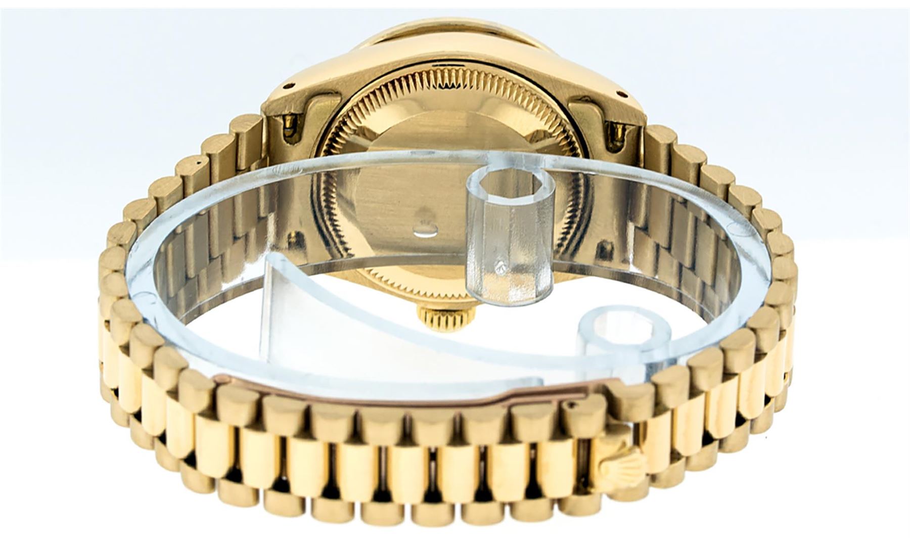 One Ladies Rolex 18K Yellow Gold President Polished, Serviced & Electronically Tested, 18K Yellow Gold Case: 26mm, 18K Yellow Gold Crown, Custom Bezel: New 18K Yellow Gold Bead Set Diamond Bezel, Diamond Count: 32 Diamonds Total Weight .70 Carat, Clarity: SI-VS, Color: G to H. Custom Crystal: New Scratch Resistant Synthetic Sapphire Cyclops Lens. Custom Hands: New Luminescent Hands. Movement: Automatic Winding Movement Caliber 2030. Custom Dial: Refinished Mother Of Pearl With String Diamond Dial, Color: G to H, Diamond Count: 43 Diamonds In Dial, Clarity: SI-VS. Date Window: 3 O'Clock Position, Model: Datejust. Condition: G-6 Extra Fine The Watch Is In Very Good Condition Free Of All Scratches And Dents. . Bracelet: 18K Yellow Gold President Band, Bright & Satin Polish. 6.0 Inch Length, Standard President Clasp (Hidden Clasp), With Rolex Logo. This Watch Comes With A Rolex Box & Appraisal. This Watch Has Been Serviced Time Tested And Is In Excellent Condition It Is Free Of All Scratches And Dents.