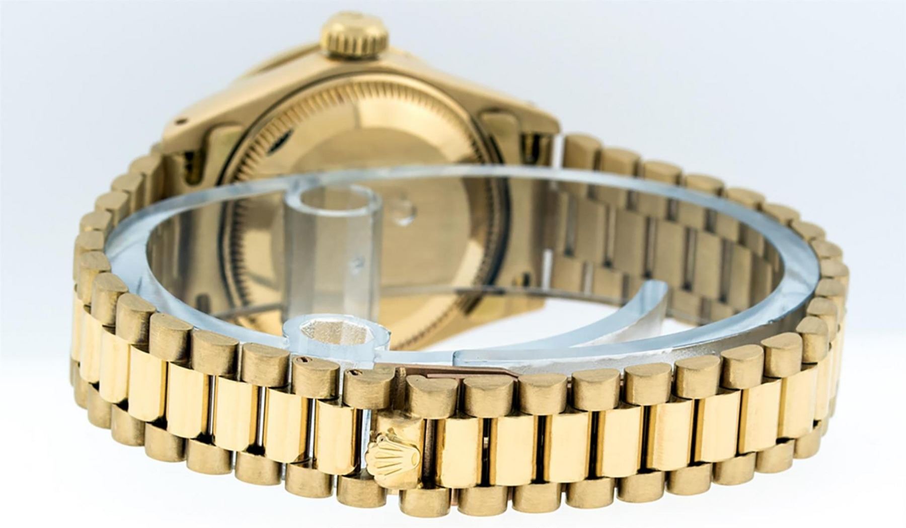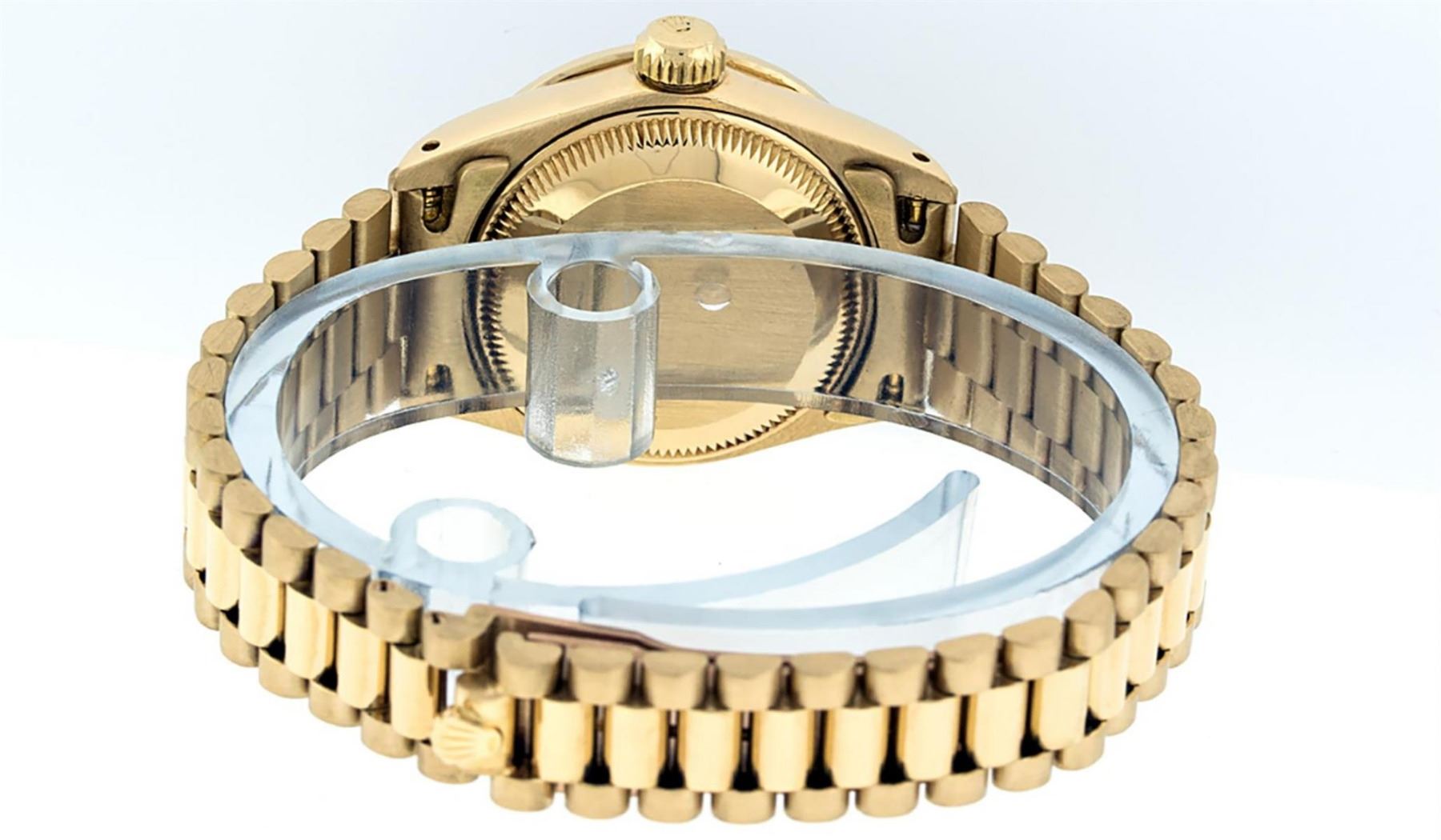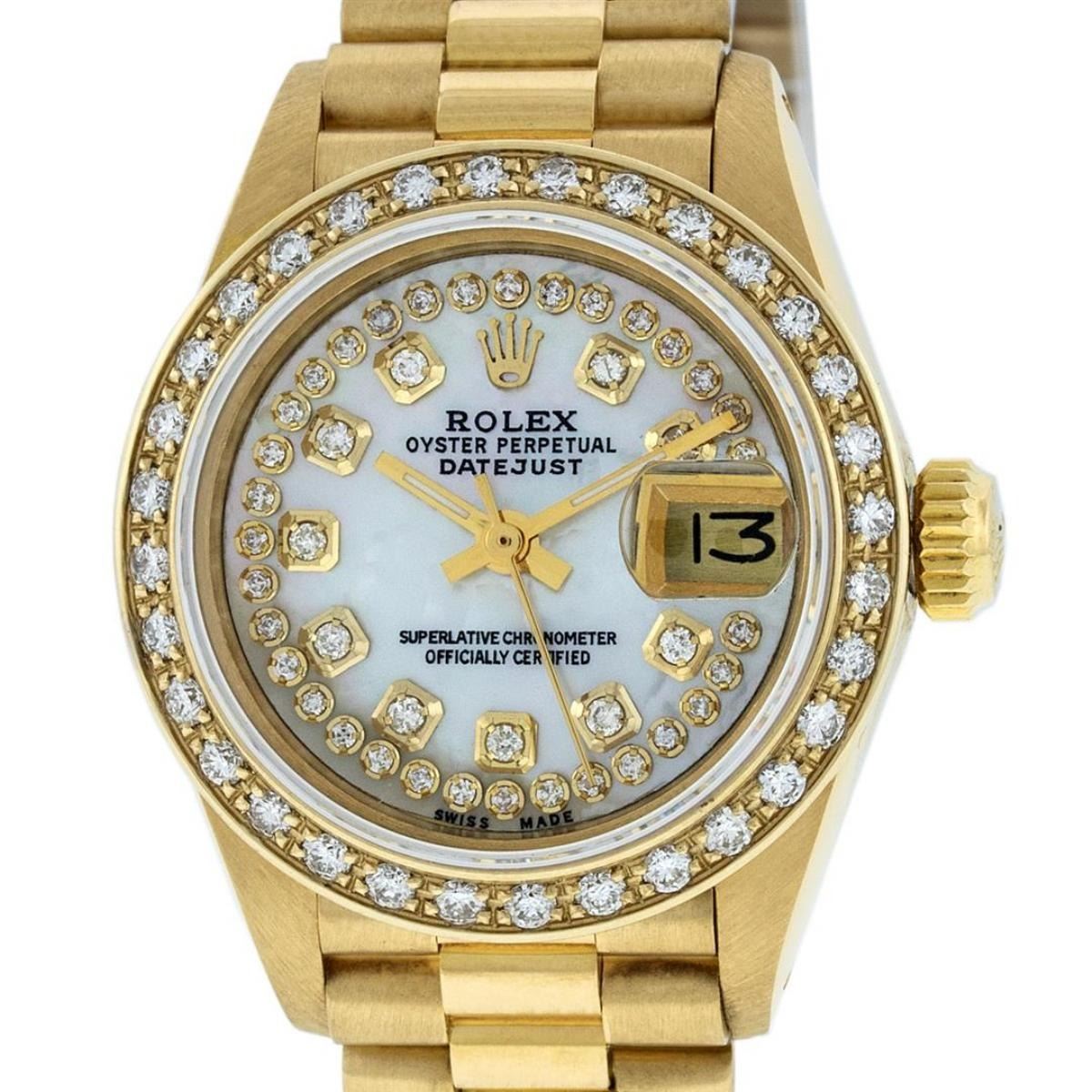 One Ladies Rolex 18K Yellow Gold President Polished, Serviced & Electronically Tested, 18K Yellow Gold Case: 26mm, 18K Yellow Gold Crown, Custom Bezel: New 18K Yellow Gold Bead Set Diamond Bezel, Diamond Count: 32 Diamonds Total Weight .70 Carat, Clarity: SI-VS, Color: G to H. Custom Crystal: New Scratch Resistant Synthetic Sapphire Cyclops Lens. Custom Hands: New Luminescent Hands. Movement: Automatic Winding Movement Caliber 2030. Custom Dial: Refinished Mother Of Pearl With String Diamond Dial, Color: G to H, Diamond Count: 43 Diamonds In Dial, Clarity: SI-VS. Date Window: 3 O'Clock Position, Model: Datejust. Condition: G-6 Extra Fine The Watch Is In Very Good Condition Free Of All Scratches And Dents. . Bracelet: 18K Yellow Gold President Band, Bright & Satin Polish. 6.0 Inch Length, Standard President Clasp (Hidden Clasp), With Rolex Logo. This Watch Comes With A Rolex Box & Appraisal. This Watch Has Been Serviced Time Tested And Is In Excellent Condition It Is Free Of All Scratches And Dents.