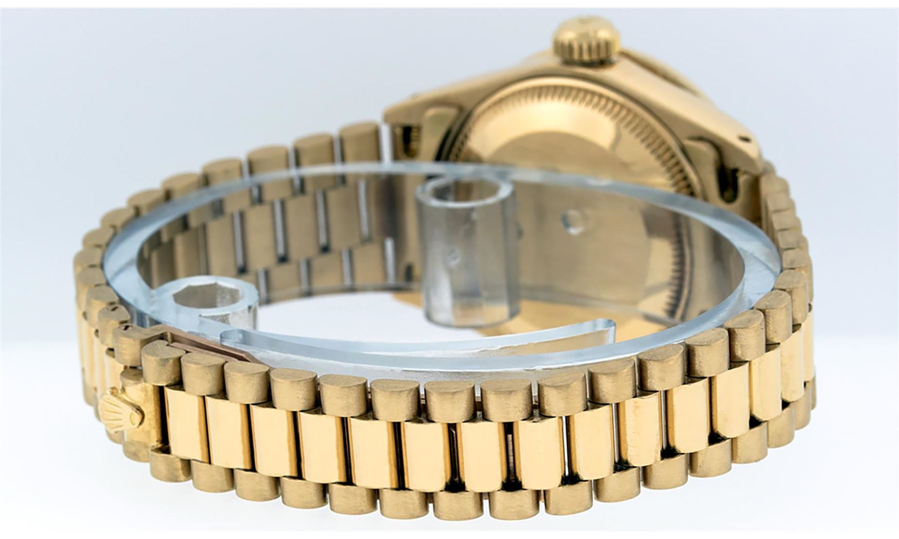 One Ladies Rolex 18K Yellow Gold President Polished, Serviced & Electronically Tested, 18K Yellow Gold Case: 26mm, 18K Yellow Gold Crown, Custom Bezel: New 18K Yellow Gold Bead Set Diamond Bezel, Diamond Count: 32 Diamonds Total Weight .70 Carat, Clarity: SI-VS, Color: G to H. Custom Crystal: New Scratch Resistant Synthetic Sapphire Cyclops Lens. Custom Hands: New Luminescent Hands. Movement: Automatic Winding Movement. Custom Dial: Refinished Mother Of Pearl With String Diamond Dial, Color: G to H, Diamond Count: 43 Diamonds In Dial, Clarity: SI-VS. Date Window: 3 O'Clock Position, Model: Datejust President. Condition: G-6 Extra Fine The Watch Is In Very Good Condition Free Of All Scratches And Dents. . Bracelet: 18K Yellow Gold President Band, Bright & Satin Polish. 6.0 Inch Length, Standard President Clasp (Hidden Clasp), With Rolex Logo. This Watch Comes With A Rolex Box & Appraisal. This Watch Has Been Serviced Time Tested And Is In Excellent Condition It Is Free Of All Scratches And Dents.