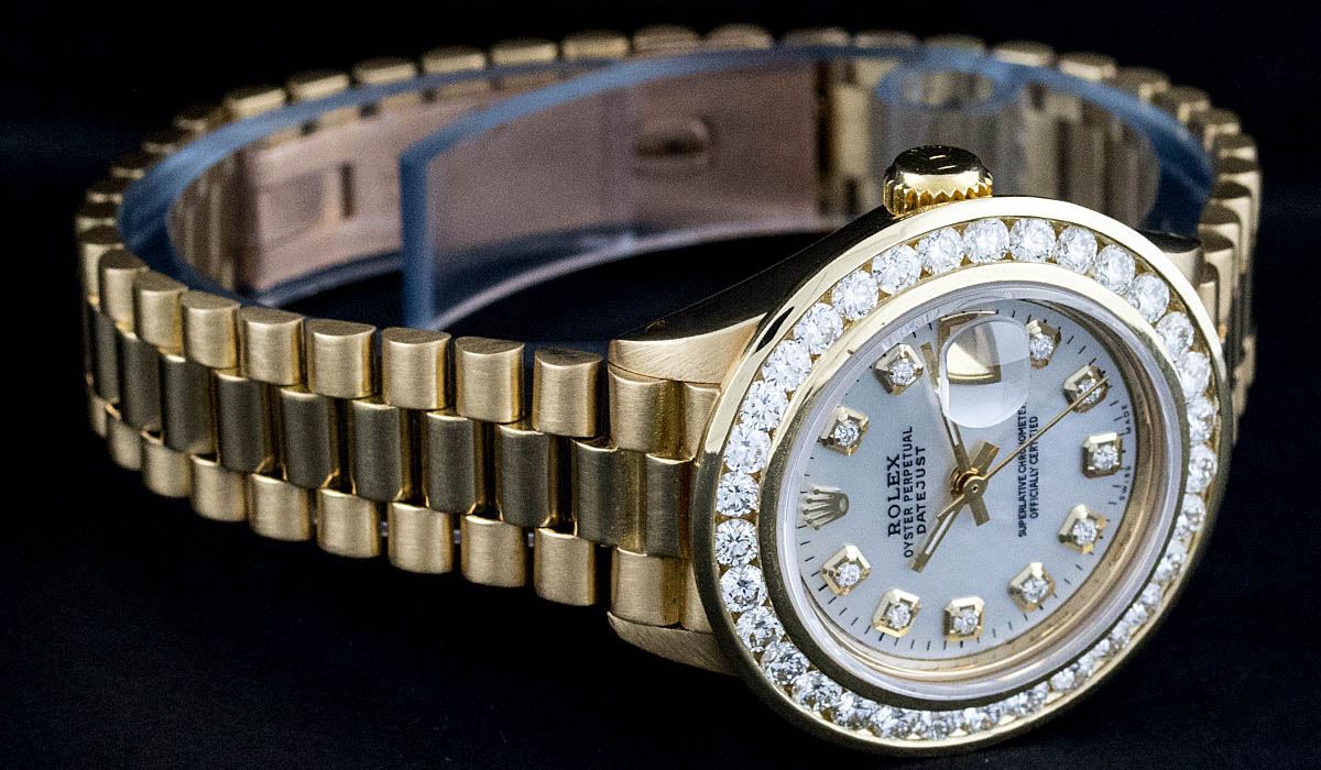 One Ladies 18K Yellow Gold Rolex President Polished, Serviced & Electronically Tested, 18K Yellow Gold Case: 26mm, 18K Yellow Gold Crown, Custom Bezel: 18K Yellow Gold 2ctw Channel Set Diamond Bezel, Diamond Count: 32 Diamonds Total Weight 2.00 Carat, Clarity: SI-VS, Color: G to H. Custom Crystal: Synthetic Sapphire Cyrstal, Cyclops Lens. Movement: Automatic Winding Movement Caliber 2030. Custom Dial: Mother Of Pearl Diamond Dial With Line Track, Diamond Count: 10 Diamonds In Dial, Clarity: SI-VS, Color: G to H. Date Window: 3 O'Clock Position, Model: Datejust President, Condition: G-6 Extra Fine. Bracelet: 18K Yellow Gold President With Hidden Clasp, Bright & Satin Polish. 6.0 Inch Length, Standard President Clasp (Hidden Clasp), With Rolex Logo. Watch Has Been Serviced And Polished It Is Free Of All Scratches And Dents.
