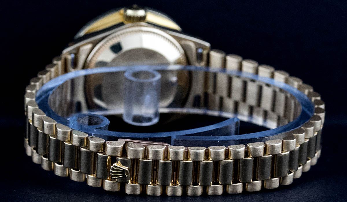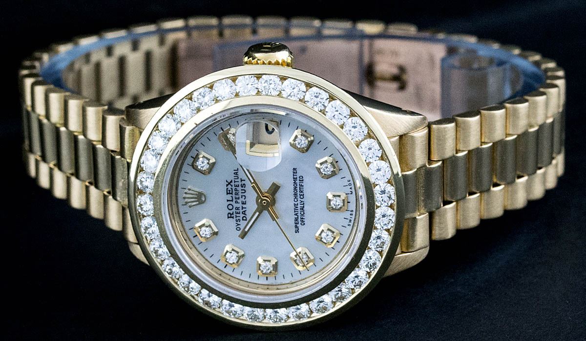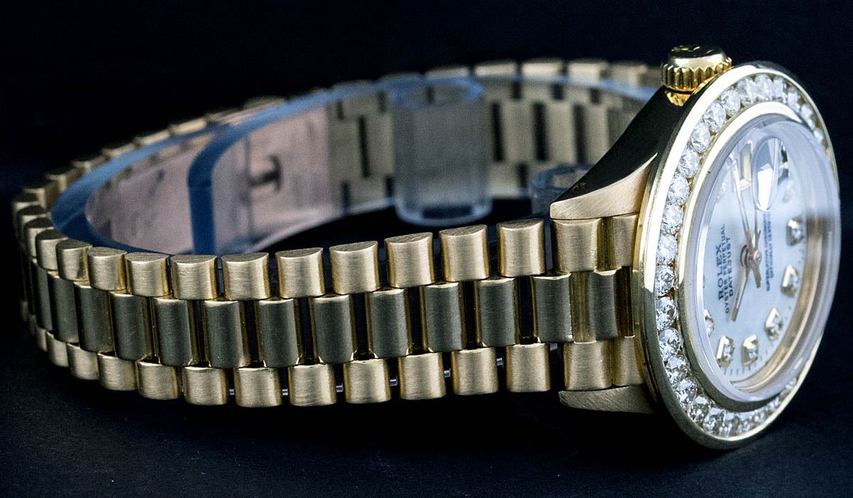 One Ladies 18K Yellow Gold Rolex President Polished, Serviced & Electronically Tested, 18K Yellow Gold Case: 26mm, 18K Yellow Gold Crown, Custom Bezel: 18K Yellow Gold 2ctw Channel Set Diamond Bezel, Diamond Count: 32 Diamonds Total Weight 2.00 Carat, Clarity: SI-VS, Color: G to H. Custom Crystal: Synthetic Sapphire Cyrstal, Cyclops Lens. Movement: Automatic Winding Movement Caliber 2030. Custom Dial: Mother Of Pearl Diamond Dial With Line Track, Diamond Count: 10 Diamonds In Dial, Clarity: SI-VS, Color: G to H. Date Window: 3 O'Clock Position, Model: Datejust President, Condition: G-6 Extra Fine. Bracelet: 18K Yellow Gold President With Hidden Clasp, Bright & Satin Polish. 6.0 Inch Length, Standard President Clasp (Hidden Clasp), With Rolex Logo. Watch Has Been Serviced And Polished It Is Free Of All Scratches And Dents.