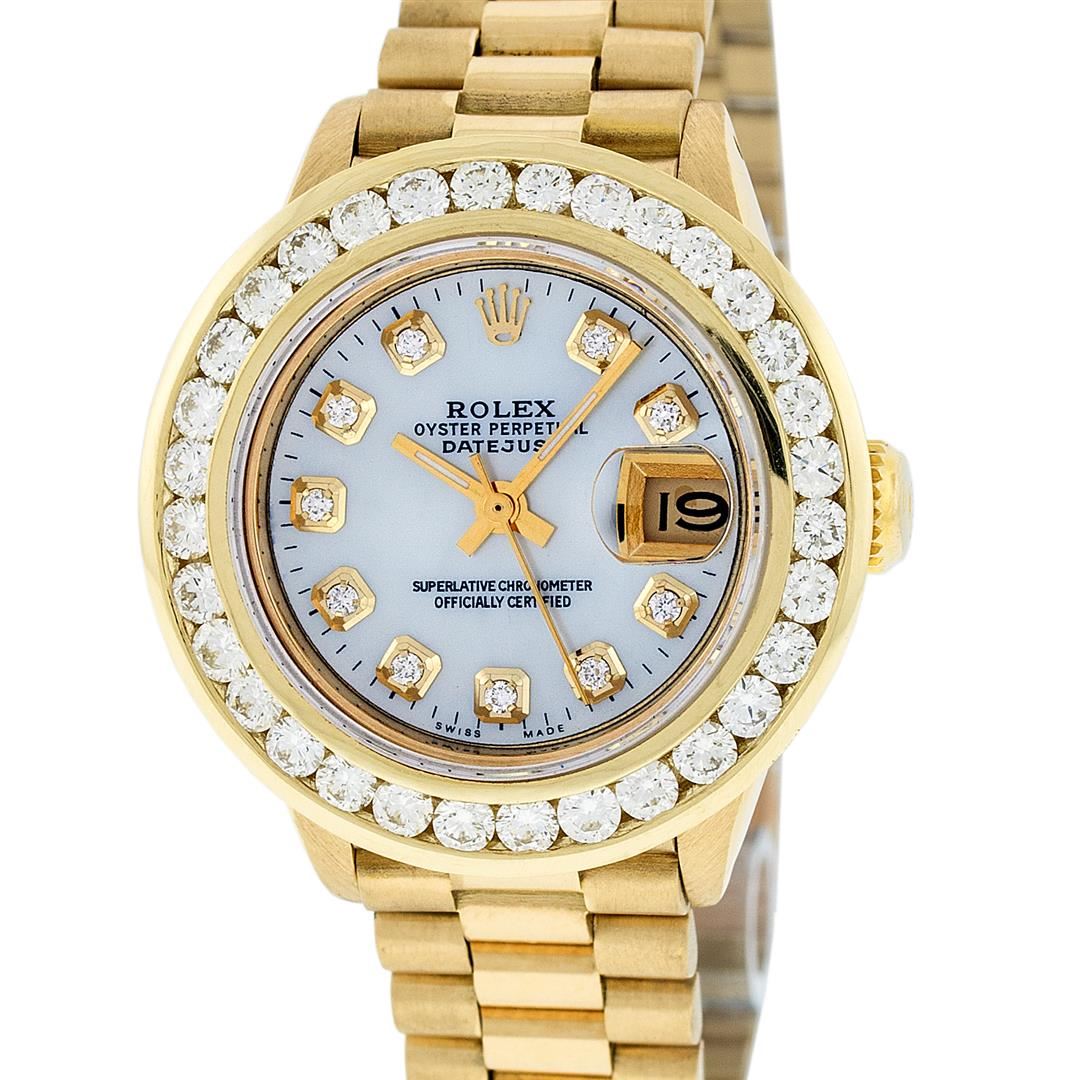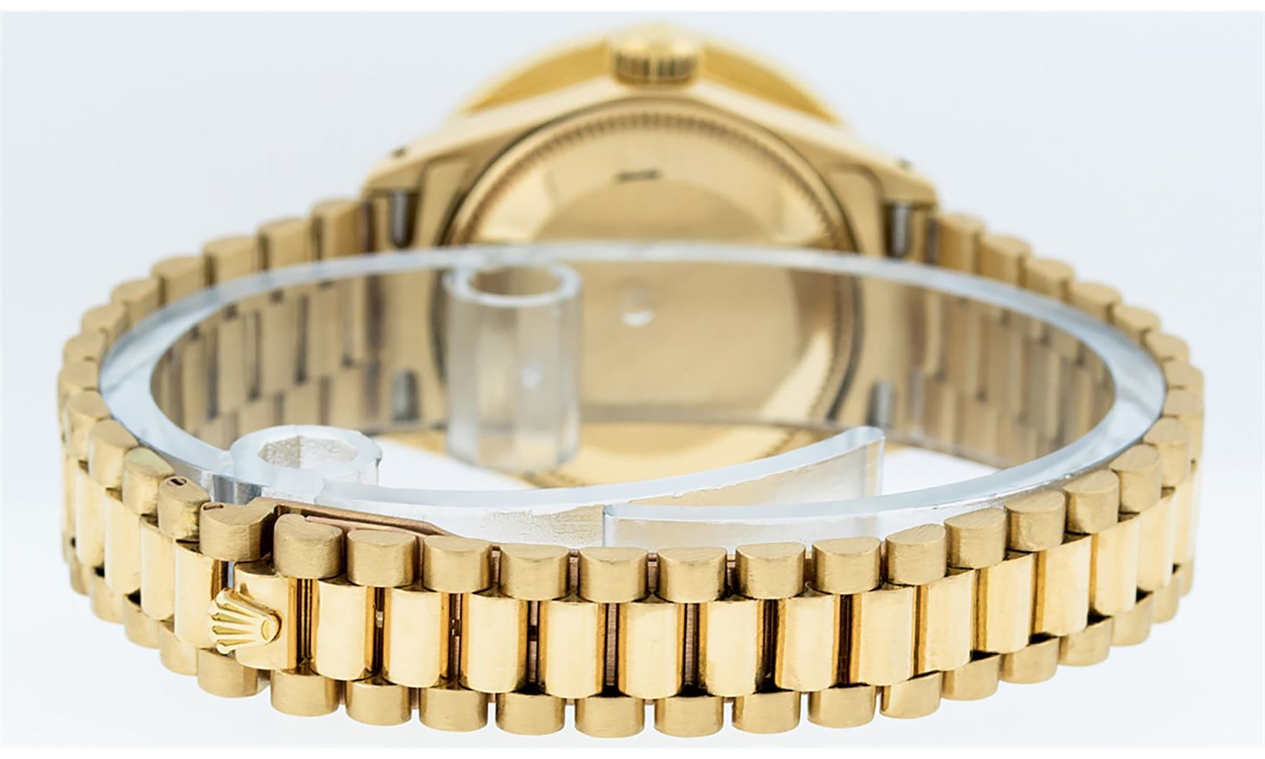 One Ladies 18K Yellow Gold Rolex President Polished, Serviced & Electronically Tested, Yellow Gold Case: 26mm, 18K Yellow Gold Crown, Custom Bezel: 18K Yellow Gold 2CTW Channel Set Diamond Bezel, Diamond Count: 32 Diamonds On Bezel. Total Weight 2.00 Carat, Clarity: SI-VS, Color: G to H. Custom Crystal: Synthetic Sapphire Cyclops Lens. Custom Hands: New Luminescent Hands. Movement: Automatic Winding Movement Caliber 2030. Custom Dial: Refinished Mother Of Pearl With Dash Track. Date Window: 3 O'Clock Position, Model: Datejust President, Condition: G-6 Extra Fine. Bracelet: 18K Yellow Gold President With Hidden Clasp, Bright & Satin Polish. 6.0 Inch Length, Standard President Clasp (Hidden Clasp), With Rolex Logo. Watch Has Been Serviced And Polished It Is Free Of All Scratches And Dents. This Watch Comes With A Watch Winder, Rolex Box And Appraisal. This Watch Has Been Serviced Time Tested And Is In Excellent Condition It Is Free Of All Scratches And Dents.