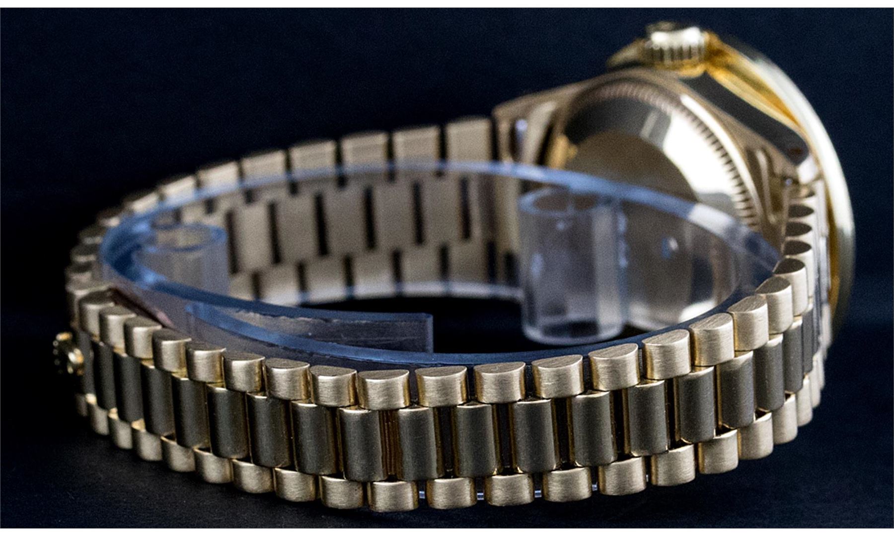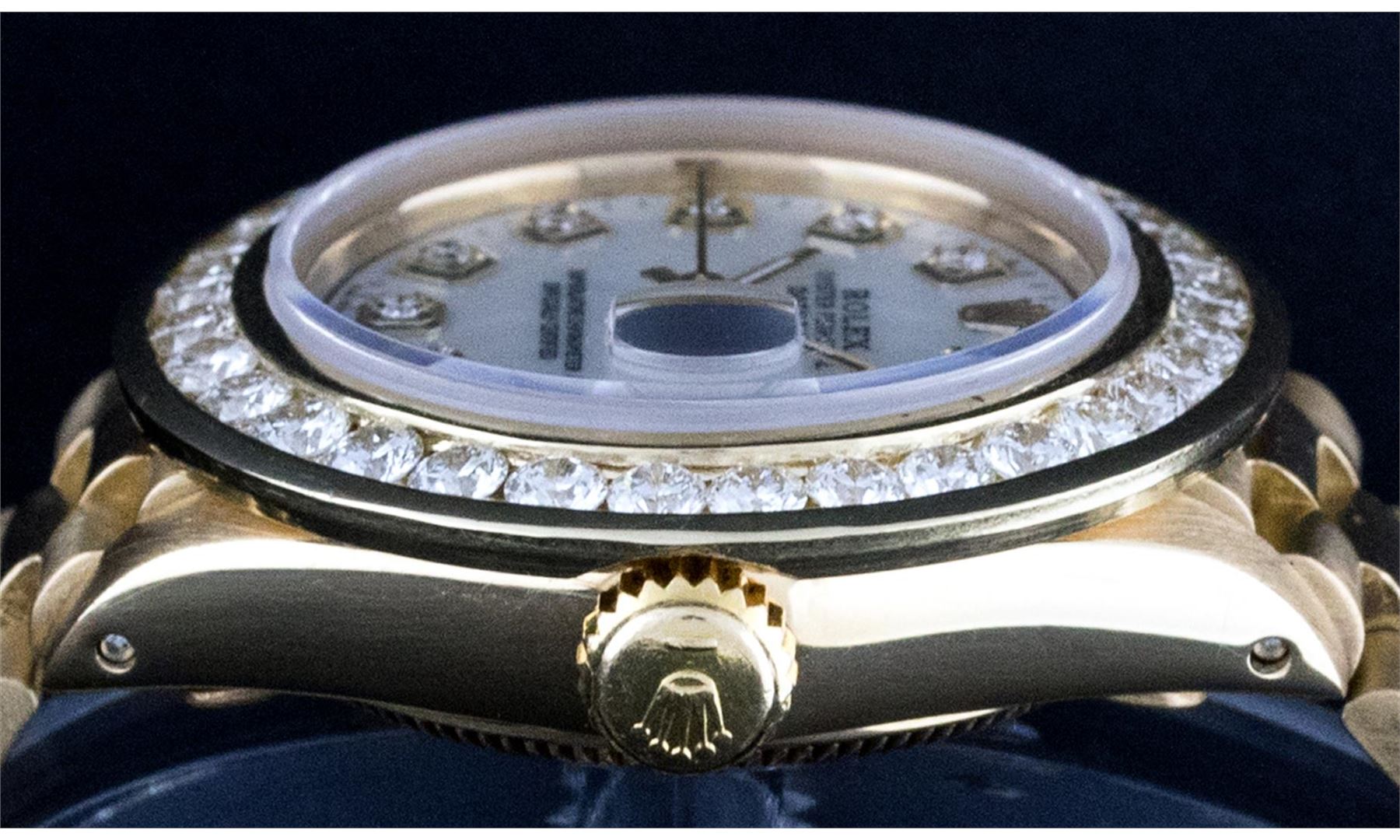 One Ladies 18K Yellow Gold Rolex Presidential Polished, Serviced & Electronically Tested, 18K Yellow Gold Case: 26mm, 18K Yellow Gold Crown, Custom Bezel: New 18K Yellow Gold 2CTW Channel Set Diamond Bezel, Diamond Count: 32 Diamonds On Bezel. Total Diamond Weight 2.00 Carat, Clarity: SI-VS, Color: G to H. Custom Crystal: New Sapphire With Date Window. Custom Hands: New Luminescent Hands. Rolex Movement: Automatic Winding Movement. Custom Dial: Mother Of Pearl With Dash Track. Date Window: 3 O'Clock Position, Model: Datejust President, Condition: G-6 Extra Fine. Rolex Bracelet: 18K Yellow Gold Presidential With Hidden Clasp, Bright & Satin Polish. 6.0 Inch Length, Standard President Clasp (Hidden Clasp), With Rolex Logo. Watch Has Been Serviced And Polished It Is Free Of All Scratches And Dents. This Pre Owned Watch Has Been Serviced Time Tested And Is In Excellent Condition It Is Free Of All Scratches And Dents.