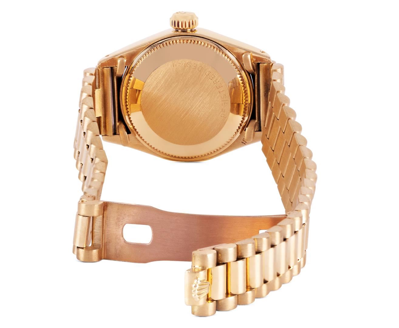 One Ladies Pre Owned Quickset Rolex 18K Yellow Gold President Polished, Serviced & Electronically Tested, Rolex 18K Yellow Gold Case: 26mm, Rolex 18K Yellow Gold Crown, Rolex Bezel: 18K Rolex Yellow Gold Fluted Bezel, Crystal: Sapphire With Cyclops Lens. Hands: Luminescent Hands. Rolex Movement: Rolex Automatic Movement Self Winding 2135. Rolex Dial: Factory Rolex Champagne Index Dial. Model: Quickset President. Condition: G-6 Extra Fine, Rolex Bracelet: 18K Yellow Gold President Band, Bright & Satin Polish. 6.0 Inch Length, Standard President Hidden Clasp, With Rolex Logo. This Watch Has Been Serviced Time Tested And Is In Excellent Condition It Is Free Of All Scratches And Dents. This Watch Comes With A Rolex Box.