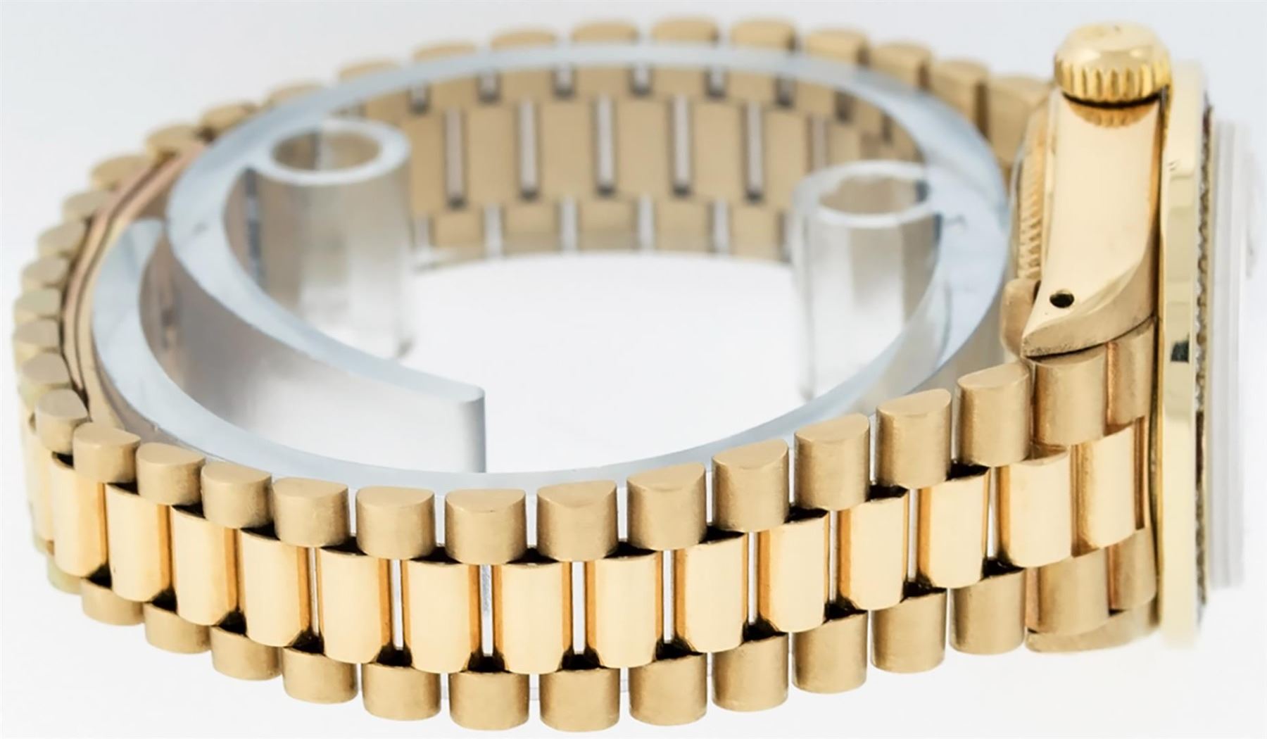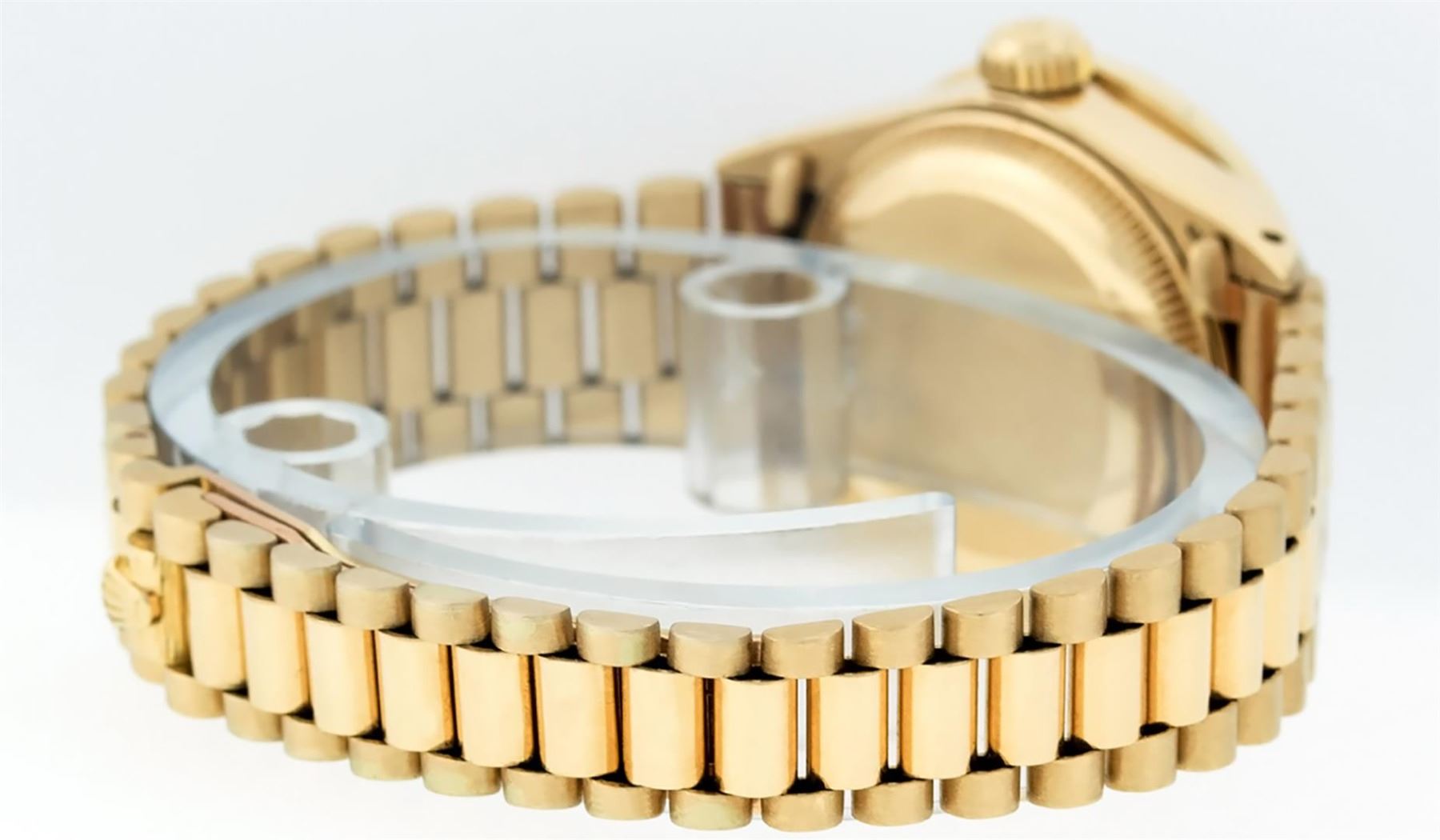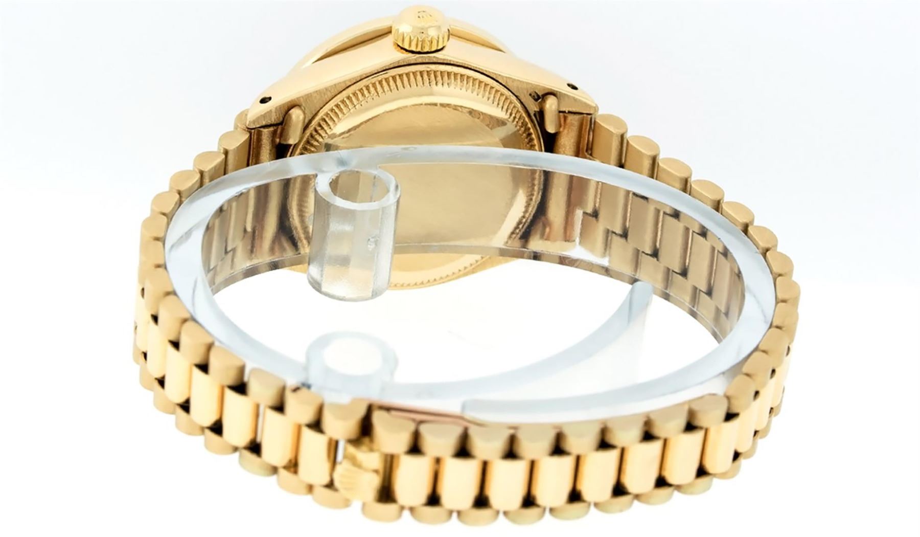 One Ladies Pre Owned 18K Yellow Gold Rolex President Polished, Serviced & Electronically Tested, Rolex Yellow Gold Case: 26mm, Rolex 18K Yellow Gold Crown, Custom Bezel: New 18K Yellow Gold Bezel With Custom Added Genuine Ruby and Diamonds, Diamond + Stone Count: 36 Diamonds + 4 Rubies. Total Weight 1.00 Carat, Clarity: SI-VS, Color: G to H. Custom Crystal: New Sapphire With Magnified Date Window. Custom Hands: New Luminescent Hands. Rolex Movement: Automatic Winding Movement. Rolex Dial: Champagne Index With Dash Track & Lumi Dots. Date Window: 3 O'Clock Position, Model: President, Condition: G-6 Extra Fine. Rolex Bracelet: 18K Yellow Gold President With Hidden Clasp, Bright & Satin Polish. 6.0 Inch Length, Standard President Clasp (Hidden Clasp), With Rolex Logo. Watch Has Been Serviced And Polished It Is Free Of All Scratches And Dents.