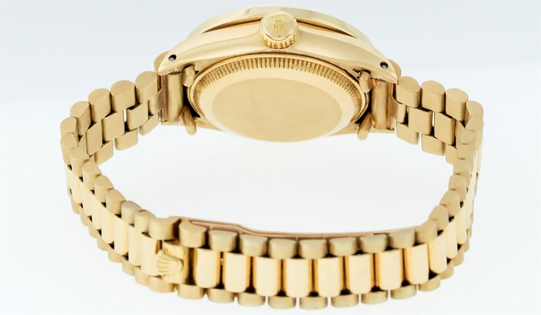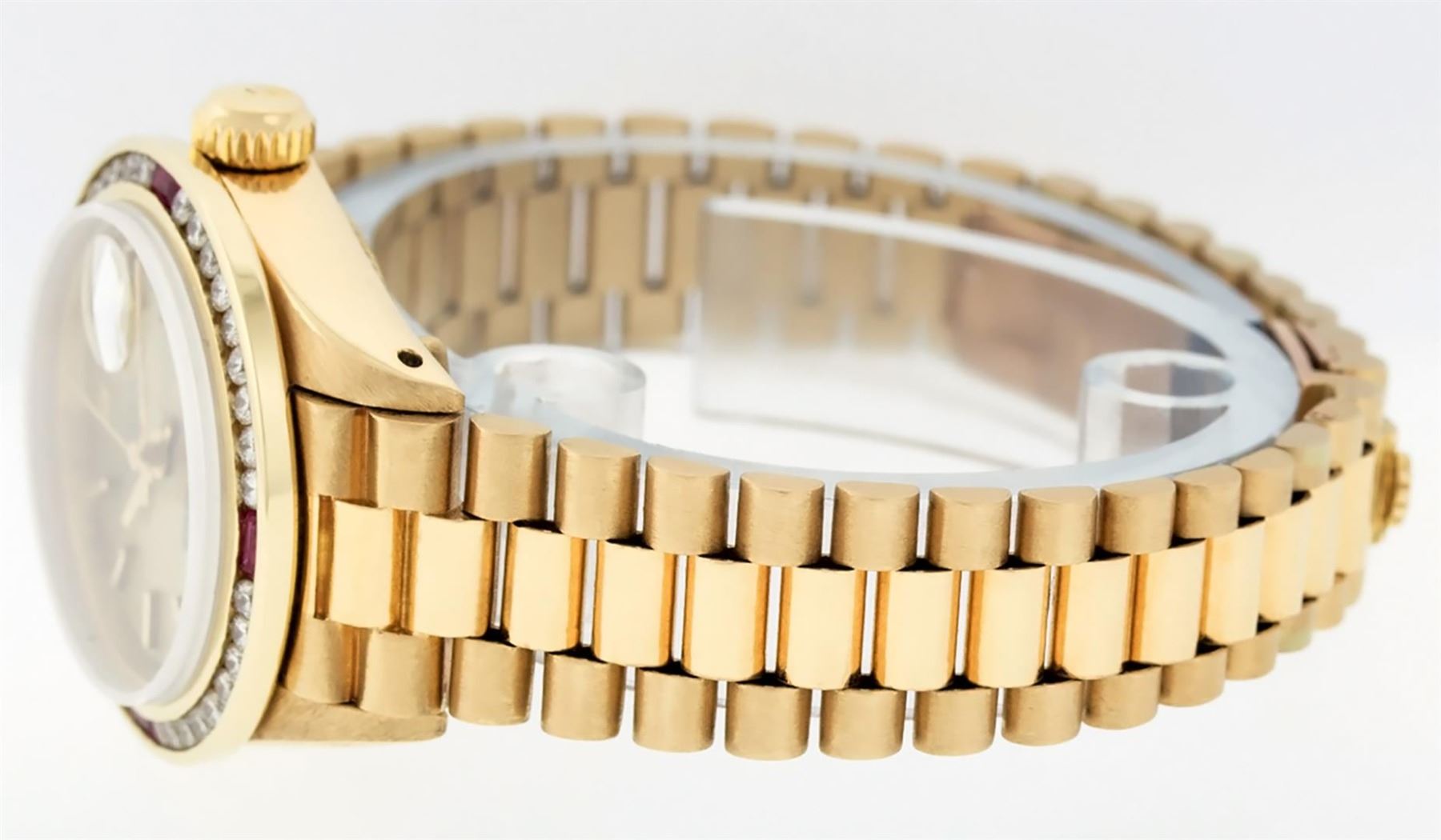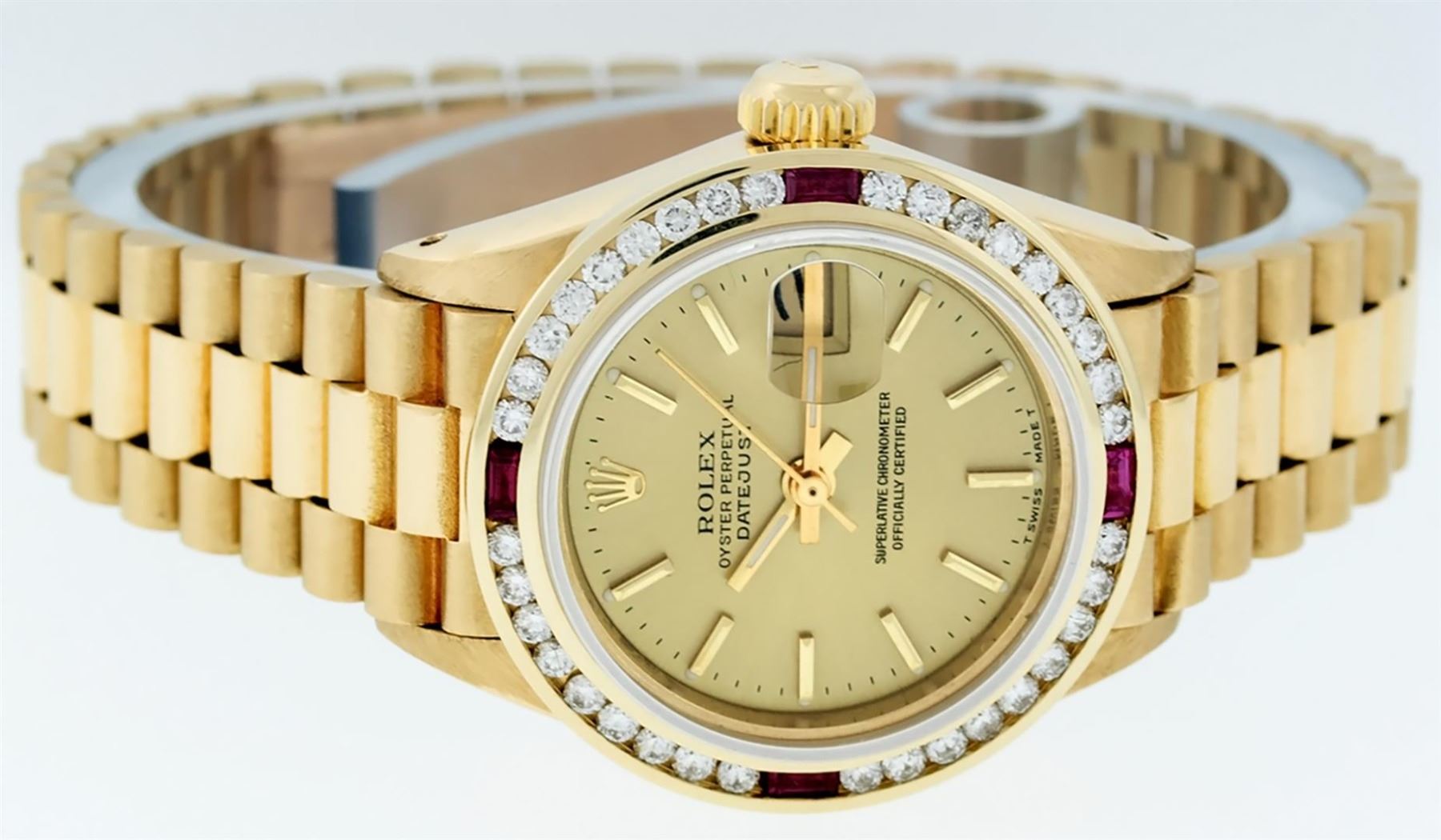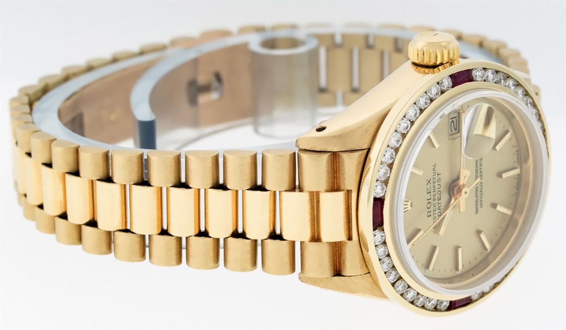 One Ladies Pre Owned 18K Yellow Gold Rolex President Polished, Serviced & Electronically Tested, Rolex Yellow Gold Case: 26mm, Rolex 18K Yellow Gold Crown, Custom Bezel: New 18K Yellow Gold Bezel With Custom Added Genuine Ruby and Diamonds, Diamond + Stone Count: 36 Diamonds + 4 Rubies. Total Weight 1.00 Carat, Clarity: SI-VS, Color: G to H. Custom Crystal: New Sapphire With Magnified Date Window. Custom Hands: New Luminescent Hands. Rolex Movement: Automatic Winding Movement. Rolex Dial: Champagne Index With Dash Track & Lumi Dots. Date Window: 3 O'Clock Position, Model: President, Condition: G-6 Extra Fine. Rolex Bracelet: 18K Yellow Gold President With Hidden Clasp, Bright & Satin Polish. 6.0 Inch Length, Standard President Clasp (Hidden Clasp), With Rolex Logo. Watch Has Been Serviced And Polished It Is Free Of All Scratches And Dents.