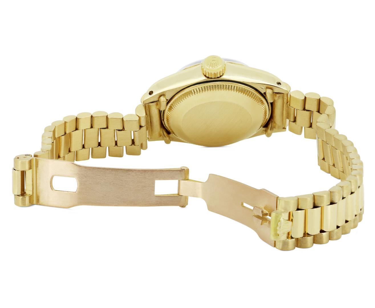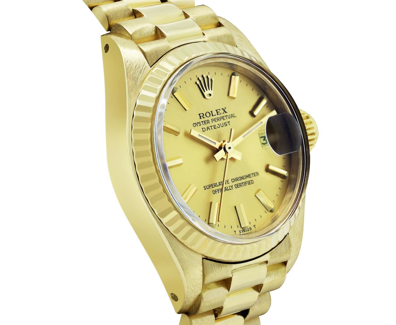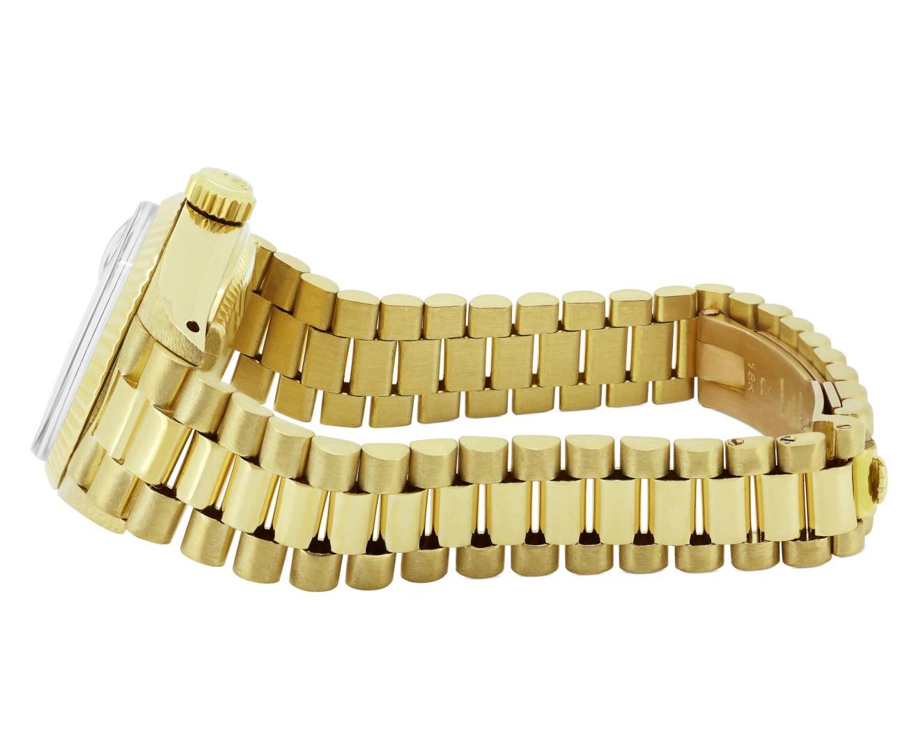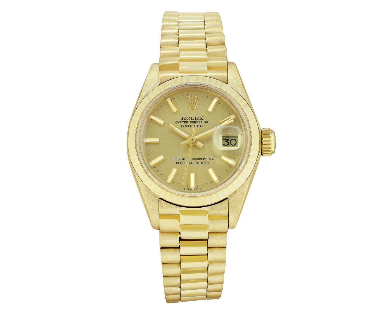 One Ladies Pre Owned Quickset Rolex 18K Yellow Gold President Polished, Serviced And Electronically Tested, Rolex 18K Yellow Gold Case: 26mm, Rolex 18K Yellow Gold Crown, Rolex Bezel: 18K Rolex Yellow Gold Fluted Bezel, Crystal: Sapphire With Cyclops Lens. Hands: Luminescent Hands. Rolex Movement: Rolex Automatic Movement Self Winding 2135. Rolex Dial: Factory Rolex Champagne Index Dial. Model: Quickset President. Condition: G-6 Extra Fine, Rolex Bracelet: 18K Yellow Gold President Band, Bright And Satin Polish. 6.0 Inch Length, Standard President Hidden Clasp, With Rolex Logo. This Watch Has Been Serviced Time Tested And Is In Excellent Condition It Is Free Of All Scratches And Dents. This Watch Comes With A Rolex Box.