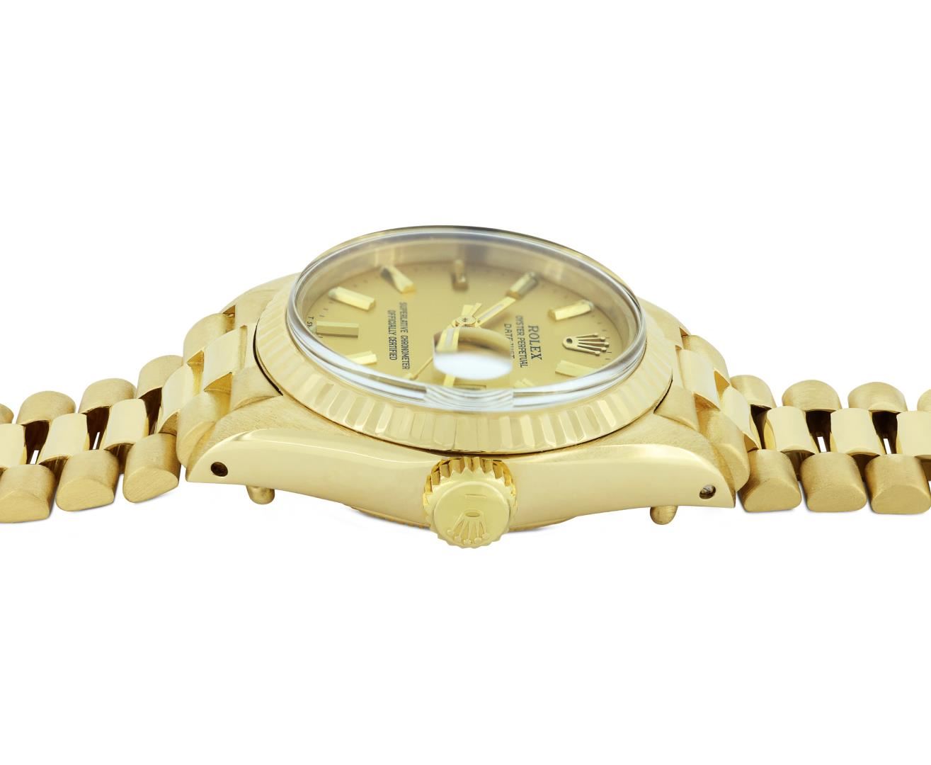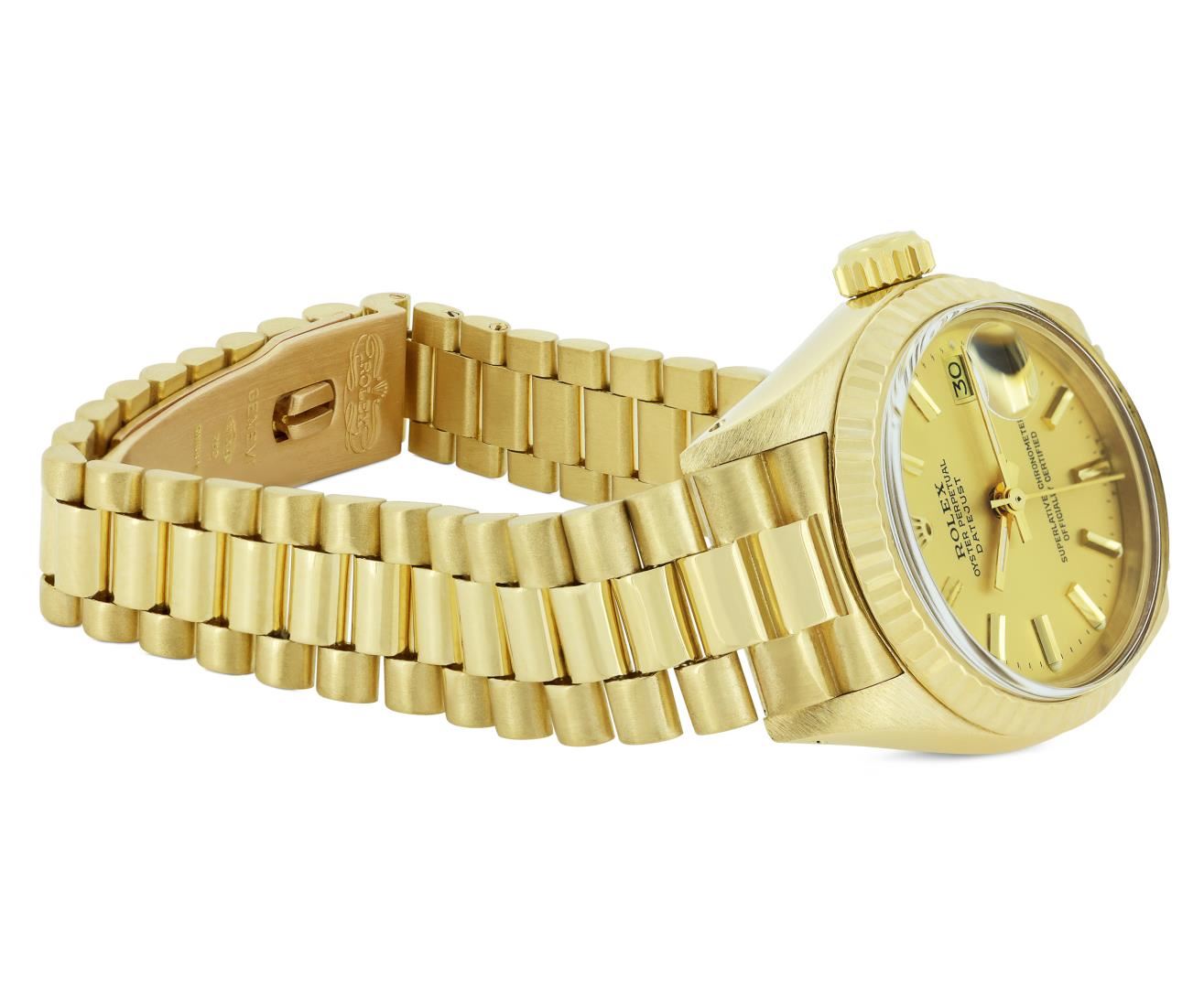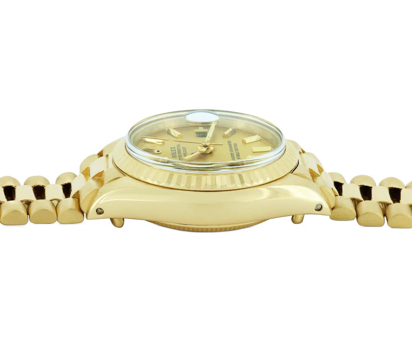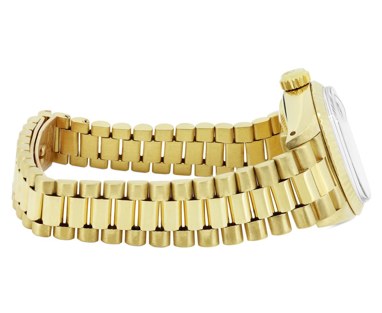 One Ladies Pre Owned Quickset Rolex 18K Yellow Gold President Polished, Serviced And Electronically Tested, Rolex 18K Yellow Gold Case: 26mm, Rolex 18K Yellow Gold Crown, Rolex Bezel: 18K Rolex Yellow Gold Fluted Bezel, Crystal: Sapphire With Cyclops Lens. Hands: Luminescent Hands. Rolex Movement: Rolex Automatic Movement Self Winding 2135. Rolex Dial: Factory Rolex Champagne Index Dial. Model: Quickset President. Condition: G-6 Extra Fine, Rolex Bracelet: 18K Yellow Gold President Band, Bright And Satin Polish. 6.0 Inch Length, Standard President Hidden Clasp, With Rolex Logo. This Watch Has Been Serviced Time Tested And Is In Excellent Condition It Is Free Of All Scratches And Dents. This Watch Comes With A Rolex Box.