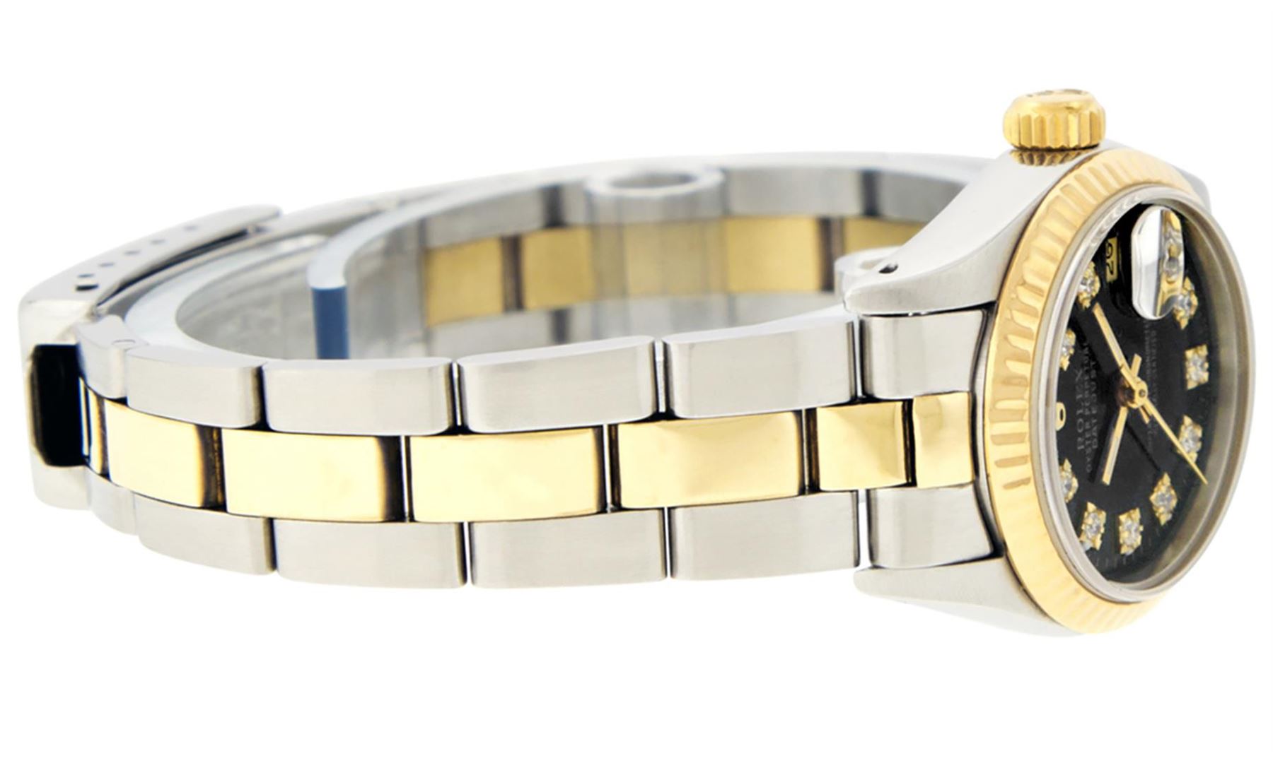 One Ladies 14K Two Tone Rolex Datejust Polished, Serviced & Electronically Tested, 14K Yellow Gold & Stainless Steel Case: 26mm, 14K Yellow Gold Crown, Bezel: 14K Yellow Gold Fluted Bezel. Custom Crystal: New Acrylic Cyclops Lens. Custom Hands: New Luminescent Hands. Movement: Automatic Winding Movement Caliber 2030. Custom Dial: Black With Diamond Hour Markers, Diamond Count: 10 Single Cut Diamonds, Color: G to H, Clarity: VS. Date Window: 3 O'Clock Position Date Display, Model: Datejust. Condition: G-6 Extra Fine. Bracelet: Two Tone 14K Yellow Gold & Stainless Steel Oyster Band. Bright Polish. 6.0 Inch Length, Adjustable. Standard Clasp, With Rolex Logo. This Watch Has Been Serviced Time Tested And Is In Excellent Condition It Is Free Of All Scratches And Dents.