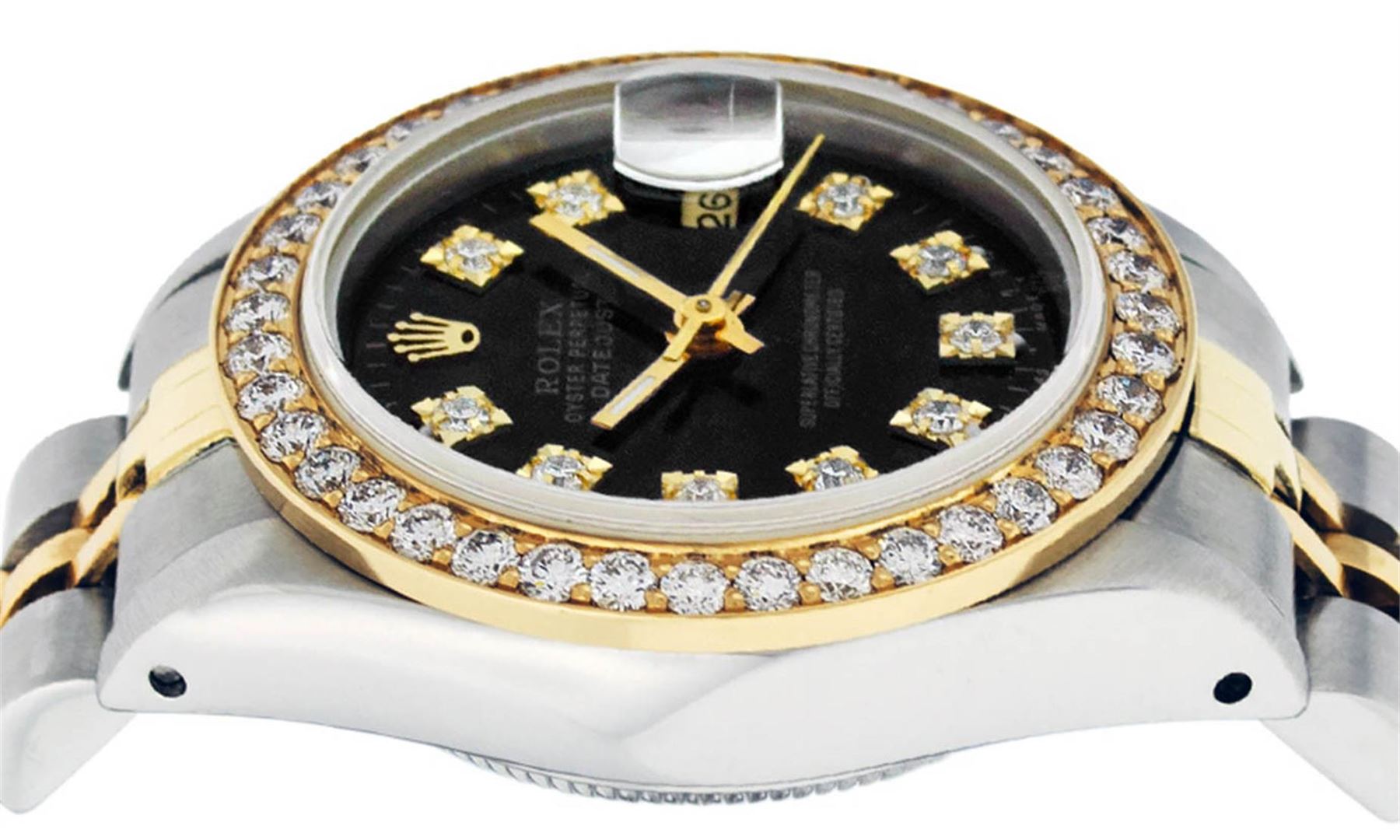 One Ladies 14K Two Tone Rolex Datejust Polished, Serviced & Electronically Tested, 14K Yellow Gold & Stainless Steel Case: 26mm, 14K Yellow Gold Crown, Custom Bezel: New 18K 1ctw Yellow Gold Beadset Diamond Bezel, Diamond Count: 44 Diamonds, Total Weight 1.00 Carat, Clarity: Si-VS, Color: G to H. Custom Crystal: New Synthetic Sapphire Cyclops Lens. Custom Hands: New Luminescent Hands. Movement: Automatic Winding Movement Caliber 2030. Custom Dial: Mother Of Pearl String Diamond Dial, Diamond Count: 43 Single Cut Diamonds in Dial, G To H In Color, VS Clarity. Date Window: 3 O'Clock Position Date Display, Model: Datejust, Condition: G-6 Extra Fine. Bracelet: Two Tone 14K Yellow Gold & Stainless Steel Jubilee. Bright Polish. 6.0 Inch Length, Adjustable. Standard Clasp, With Rolex Logo. This Watch Has Been Serviced Time Tested And Is In Excellent Condition It Is Free Of All Scratches And Dents.