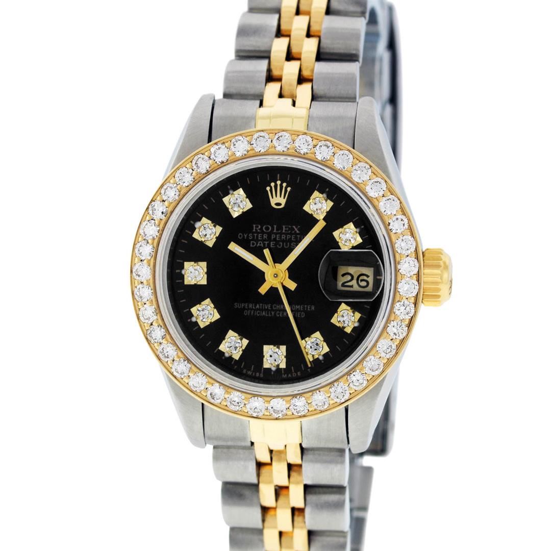 One Ladies 14K Two Tone Rolex Datejust Polished, Serviced & Electronically Tested, 14K Yellow Gold & Stainless Steel Case: 26mm, 14K Yellow Gold Crown, Custom Bezel: New 18K 1ctw Yellow Gold Beadset Diamond Bezel, Diamond Count: 44 Diamonds, Total Weight 1.00 Carat, Clarity: Si-VS, Color: G to H. Custom Crystal: New Synthetic Sapphire Cyclops Lens. Custom Hands: New Luminescent Hands. Movement: Automatic Winding Movement Caliber 2030. Custom Dial: Mother Of Pearl String Diamond Dial, Diamond Count: 43 Single Cut Diamonds in Dial, G To H In Color, VS Clarity. Date Window: 3 O'Clock Position Date Display, Model: Datejust, Condition: G-6 Extra Fine. Bracelet: Two Tone 14K Yellow Gold & Stainless Steel Jubilee. Bright Polish. 6.0 Inch Length, Adjustable. Standard Clasp, With Rolex Logo. This Watch Has Been Serviced Time Tested And Is In Excellent Condition It Is Free Of All Scratches And Dents.