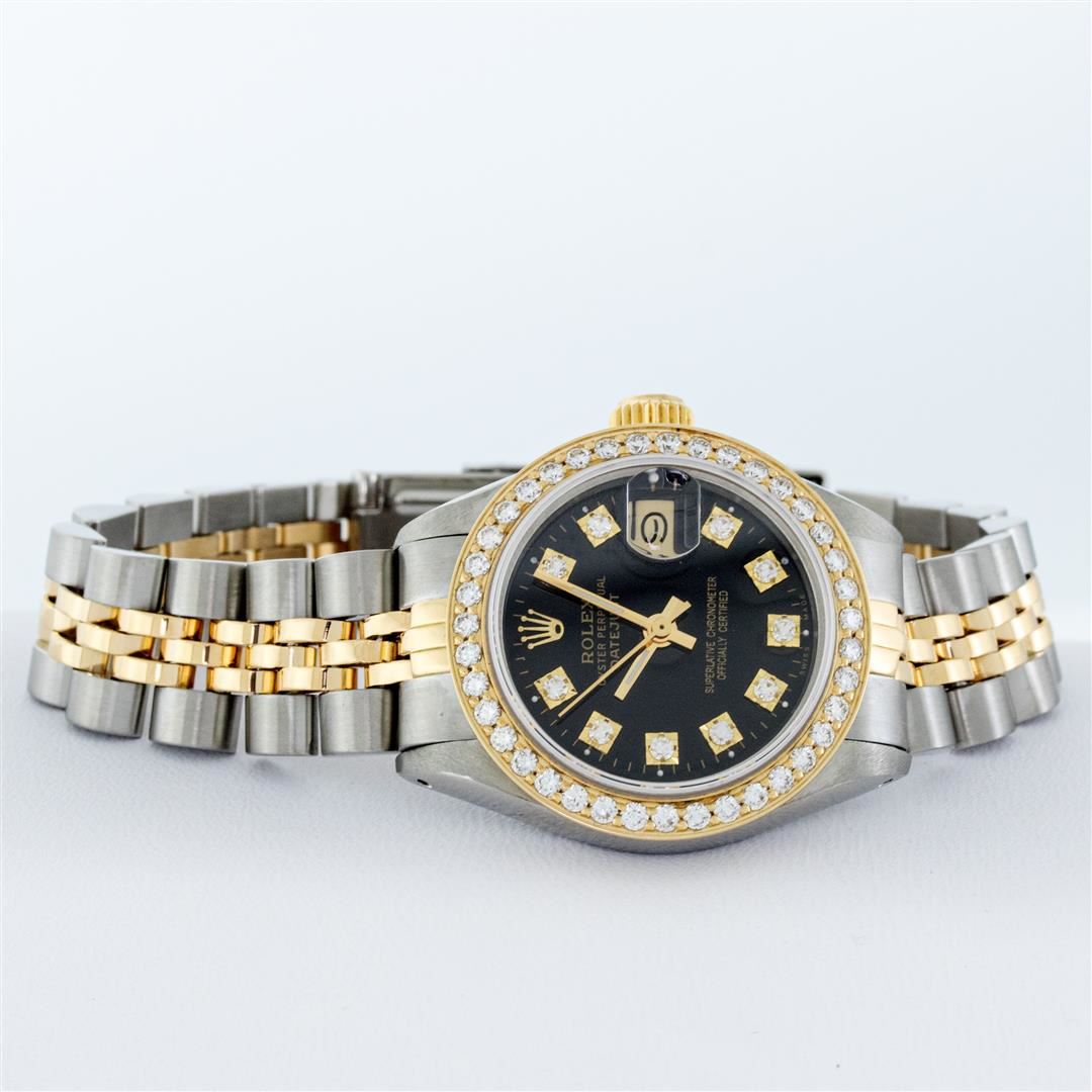 One Ladies 14K Two Tone Rolex Datejust Polished, Serviced & Electronically Tested, 14K Yellow Gold & Stainless Steel Case: 26mm, 14K Yellow Gold Crown, Custom Bezel: New 18K 1ctw Yellow Gold Beadset Diamond Bezel, Diamond Count: 44 Diamonds, Total Weight 1.00 Carat, Clarity: Si-VS, Color: G to H. Custom Crystal: New Synthetic Sapphire Cyclops Lens. Custom Hands: New Luminescent Hands. Movement: Automatic Winding Movement Caliber 2030. Custom Dial: Mother Of Pearl String Diamond Dial, Diamond Count: 43 Single Cut Diamonds in Dial, G To H In Color, VS Clarity. Date Window: 3 O'Clock Position Date Display, Model: Datejust, Condition: G-6 Extra Fine. Bracelet: Two Tone 14K Yellow Gold & Stainless Steel Jubilee. Bright Polish. 6.0 Inch Length, Adjustable. Standard Clasp, With Rolex Logo. This Watch Has Been Serviced Time Tested And Is In Excellent Condition It Is Free Of All Scratches And Dents.