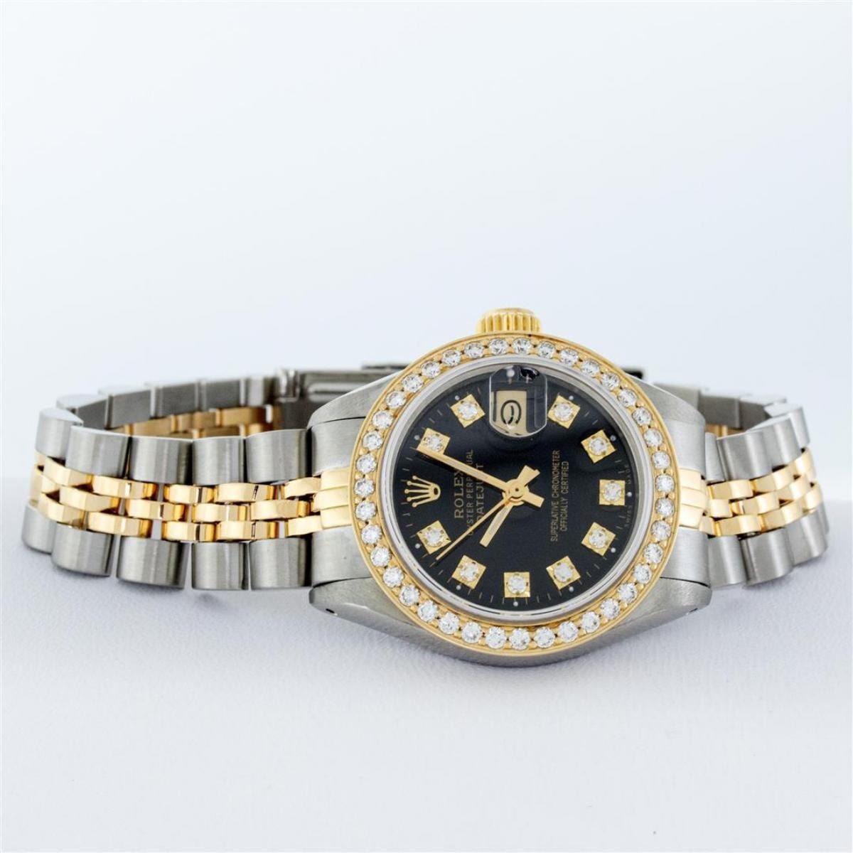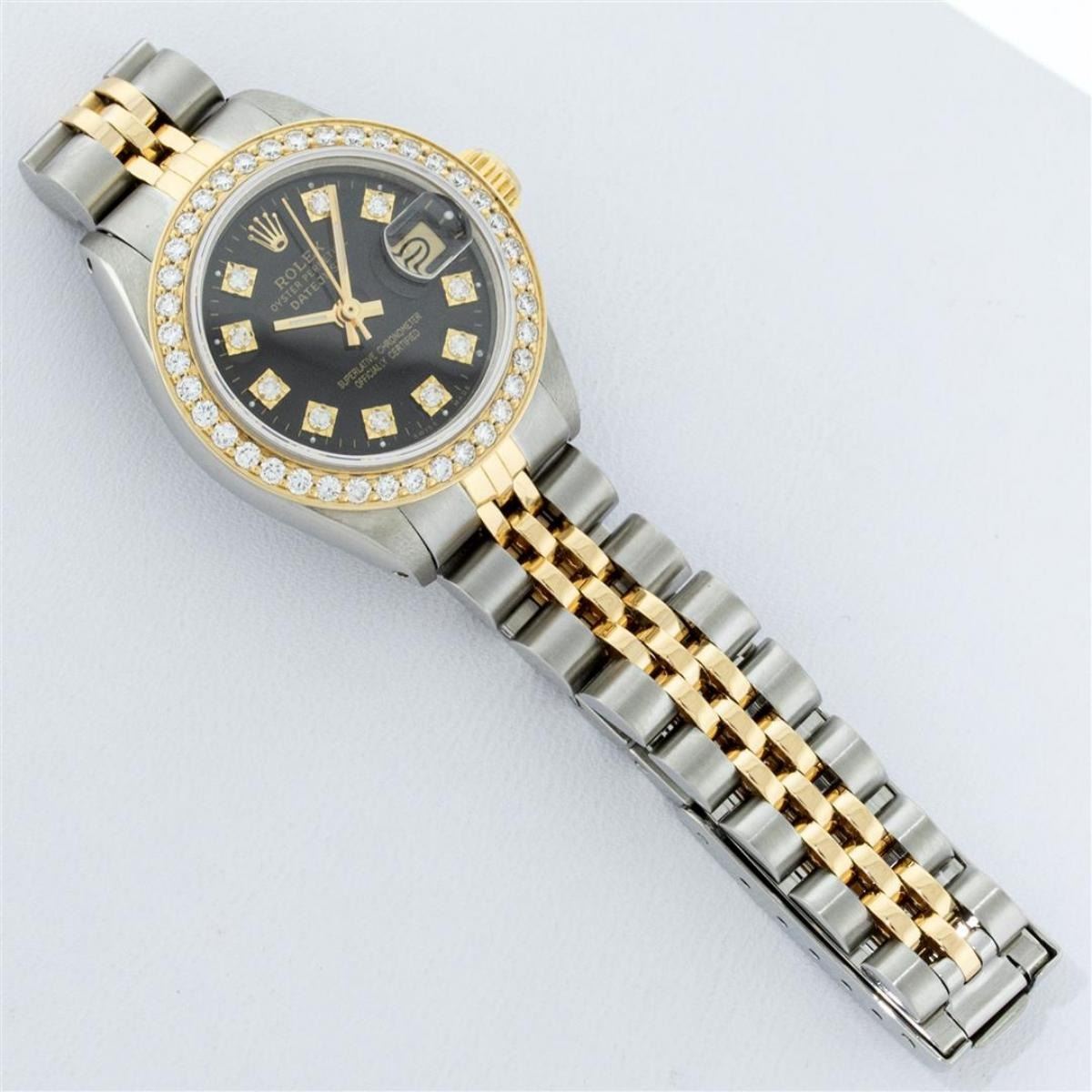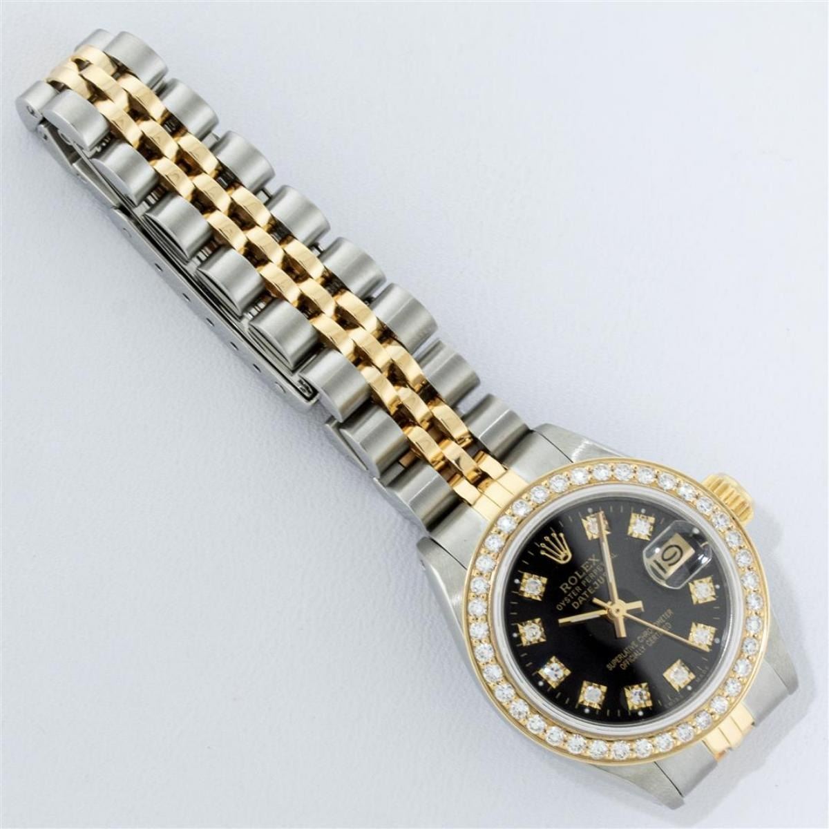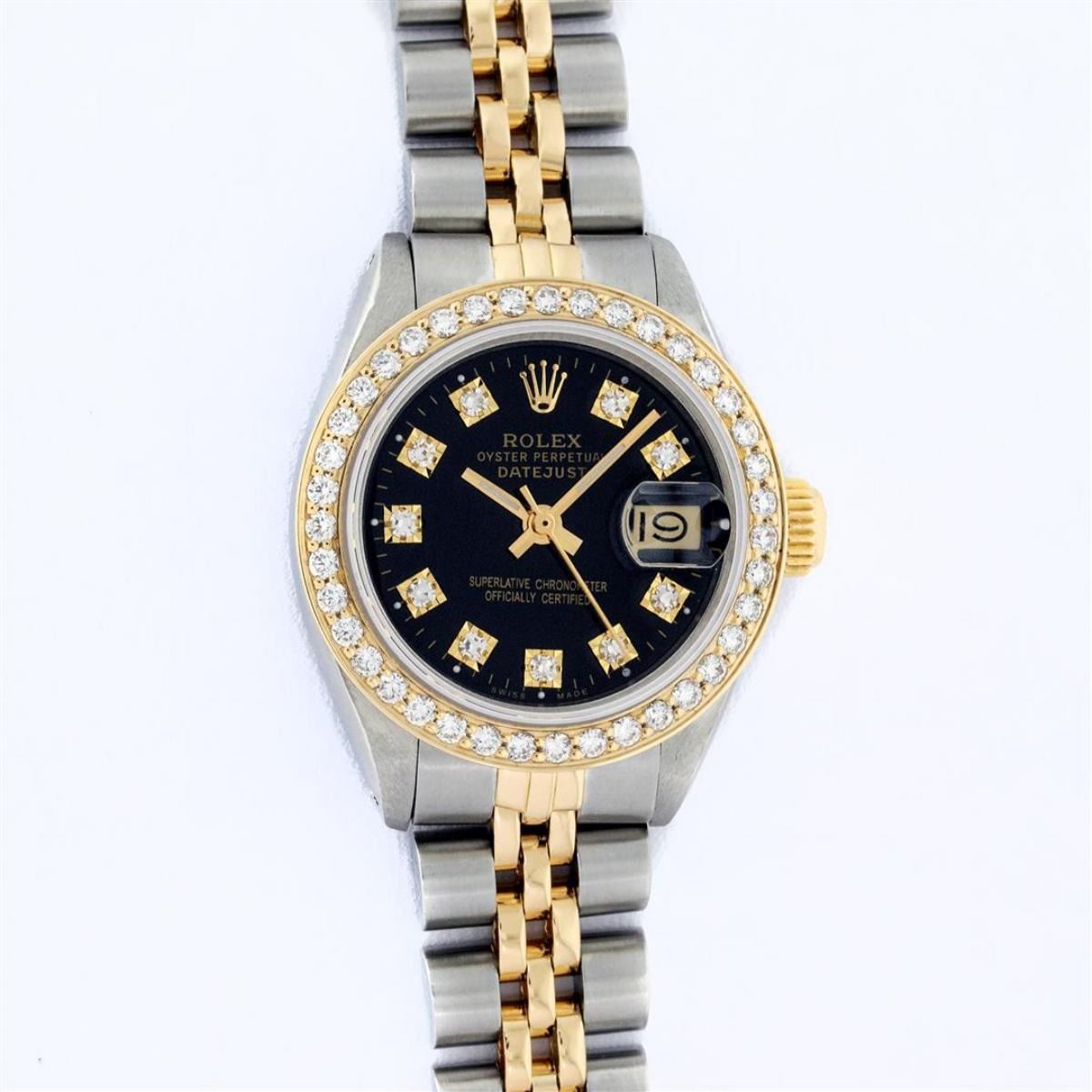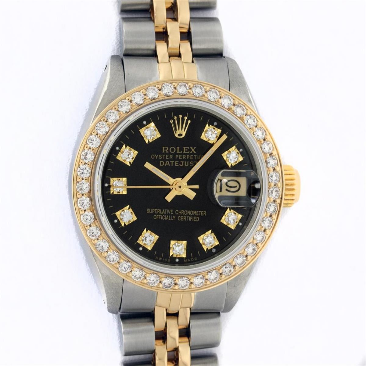 One Ladies 14K Two Tone Rolex Datejust Polished, Serviced & Electronically Tested, 14K Yellow Gold & Stainless Steel Case: 26mm, 14K Yellow Gold Crown, Custom Bezel: New 18K 1ctw Yellow Gold Beadset Diamond Bezel, Diamond Count: 44 Diamonds, Total Weight 1.00 Carat, Clarity: Si-VS, Color: G to H. Custom Crystal: New Synthetic Sapphire Cyclops Lens. Custom Hands: New Luminescent Hands. Movement: Automatic Winding Movement Caliber 2030. Custom Dial: Mother Of Pearl String Diamond Dial, Diamond Count: 43 Single Cut Diamonds in Dial, G To H In Color, VS Clarity. Date Window: 3 O'Clock Position Date Display, Model: Datejust, Condition: G-6 Extra Fine. Bracelet: Two Tone 14K Yellow Gold & Stainless Steel Jubilee. Bright Polish. 6.0 Inch Length, Adjustable. Standard Clasp, With Rolex Logo. This Watch Has Been Serviced Time Tested And Is In Excellent Condition It Is Free Of All Scratches And Dents.