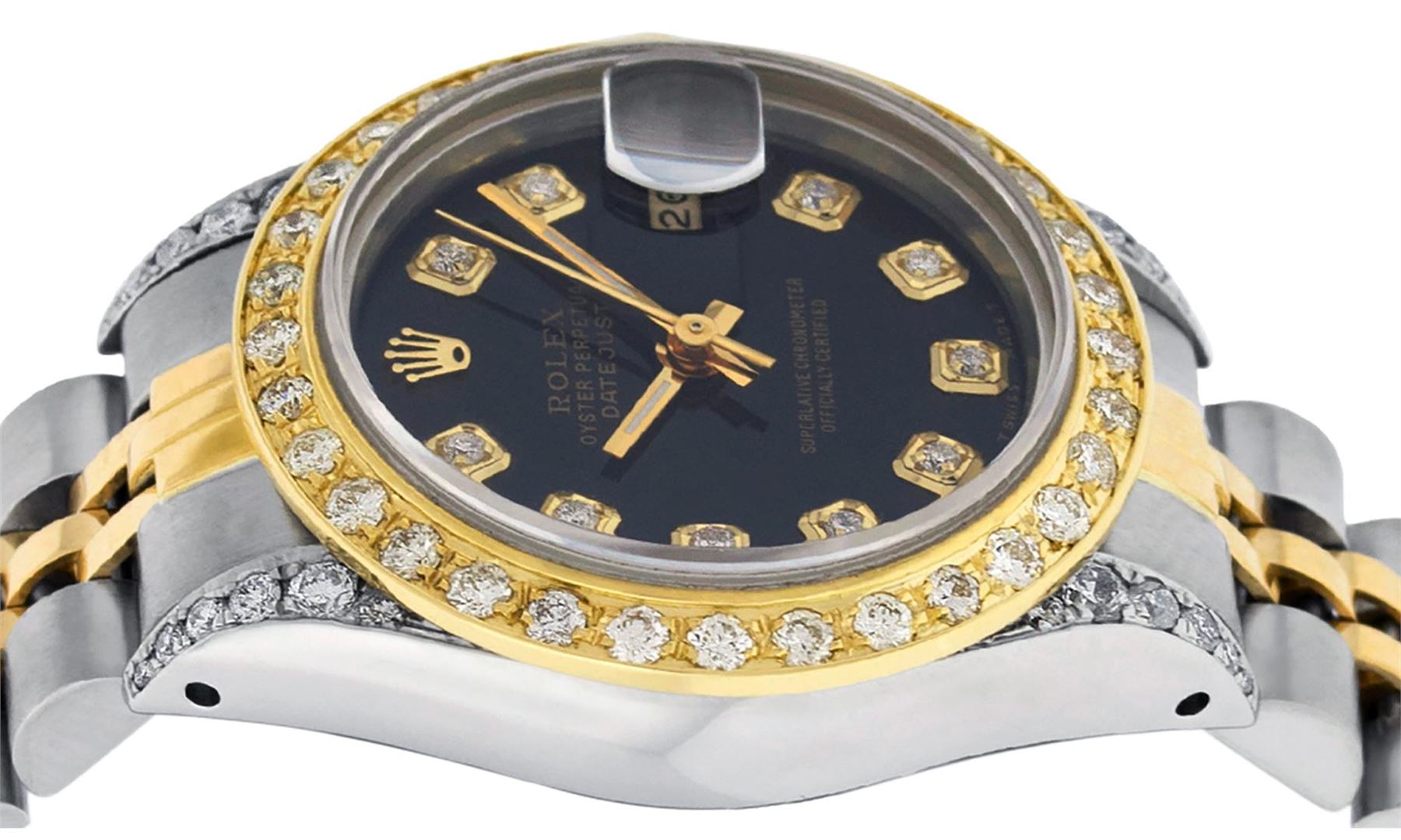 One Ladies 14K Two Tone Rolex Datejust Polished, Serviced & Electronically Tested, 14K Yellow Gold & Stainless Steel Case: 26mm, 14K Yellow Gold Crown, Diamond Lugs: 24 Diamonds On Lugs, Clarity: SI-VS, Color: G to H, Clarity SI-VS. Custom Bezel: New 18K Yellow Gold Beadset Diamond Bezel, Diamond Count: 32 Diamonds, Total Weight .70 Carat, Clarity: SI-VS, Color: G to H. Custom Crystal: New Synthetic Sapphire Cyclops Lens. Custom Hands: New Luminescent Hands. Movement: Automatic Winding Movement Caliber 2030. Custom Dial: Black With Diamond Hour Markers, Diamond Count: 10 Diamonds, Clarity: SI-VS, Color: G to H. Date Window: 3 O'Clock Position Date Display, Model: Datejust. Condition: G-6 Extra Fine. Bracelet: Two Tone 14K Yellow Gold & Stainless Steel Jubilee. Bright Polish. 6.0 Inch Length, Adjustable. Standard Clasp, With Rolex Logo. This Watch Has Been Serviced Time Tested And Is In Excellent Condition It Is Free Of All Scratches And Dents.
