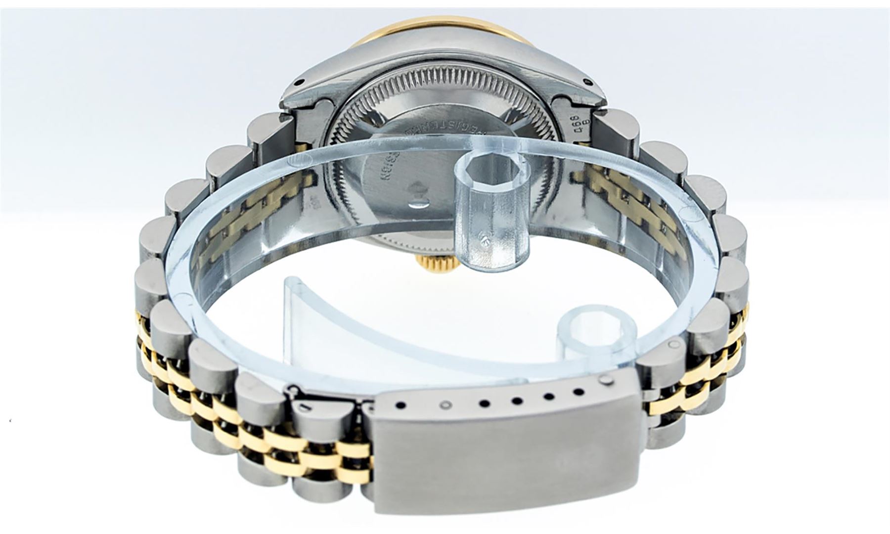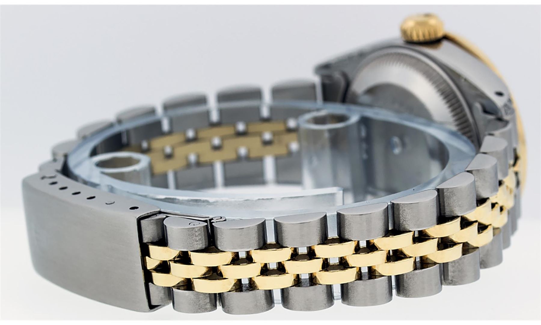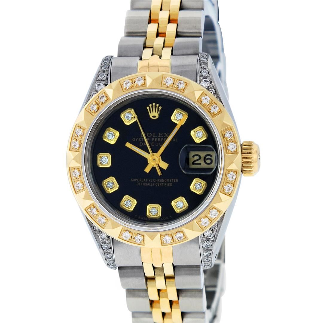 One Ladies 14K Two Tone Rolex Datejust Polished, Serviced & Electronically Tested, 14K Yellow Gold & Stainless Steel Case: 26mm, 14K Yellow Gold Crown, Diamond Lugs: 24 Diamonds On Lugs, Clarity: SI-VS, Color: G to H, Clarity SI-VS. Custom Bezel: New 18K Yellow Gold Pyramid Diamond Bezel, Diamond Count: 24 Diamonds, Total Weight .50 Carat, Clarity: SI-VS, Color: G to H. Custom Crystal: New Synthetic Sapphire Cyclops Lens. Custom Hands: New Luminescent Hands. Movement: Automatic Winding Movement Caliber 2030. Custom Dial: Black With Diamond Hour Markers, Diamond Count: 10 Diamonds In Dial, Clarity: SI-VS, Color: G to H. Date Window: 3 O'Clock Position Date Display, Model: Datejust. Condition: G-6 Extra Fine. Bracelet: Two Tone 14K Yellow Gold & Stainless Steel Jubilee. Bright Polish. 6.0 Inch Length, Adjustable. Standard Clasp, With Rolex Logo. This Watch Has Been Serviced Time Tested And Is In Excellent Condition It Is Free Of All Scratches And Dents.