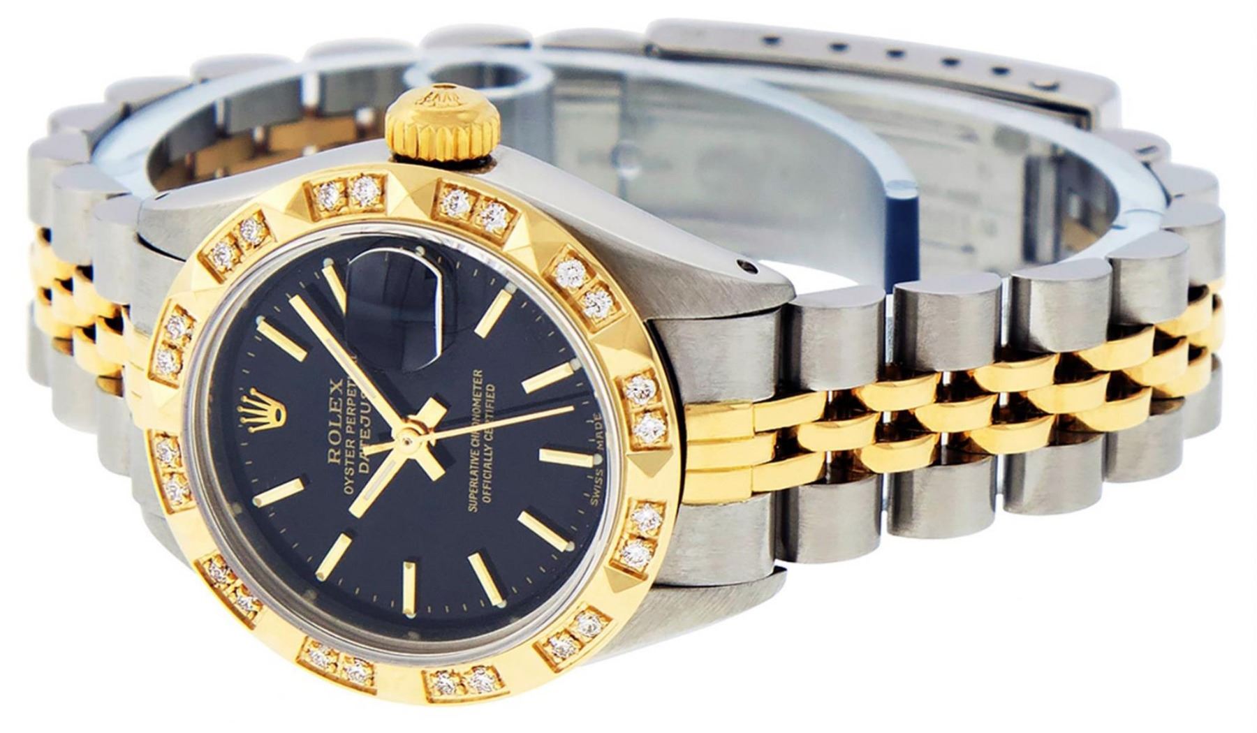One Ladies 14K Two Tone Rolex Datejust Polished, Serviced & Electronically Tested, 14K Yellow Gold & Stainless Steel Case: 26mm, 14K Yellow Gold Crown, Custom Bezel: New 18K Yellow Gold Pyramid Diamond Bezel, Diamond Count: 24 Diamonds In Bezel. Total Weight .50 Carat, Clarity: SI-VS, Color: G to H. Custom Crystal: New Synthetic Sapphire Cyclops Lens. Custom Hands: New Luminescent Hands. Movement: Automatic Winding Movement Caliber 2030. Custom Dial: Black Index With Dash Track & Lumi Dots. Date Window: 3 O'Clock Position Date Display, Model: Datejust. Condition: G-6 Extra Fine. Bracelet: Two Tone 14K Yellow Gold & Stainless Steel Jubilee. Bright Polish. 6.0 Inch Length, Adjustable. Standard Clasp, With Rolex Logo. This Watch Has Been Serviced Time Tested And Is In Excellent Condition It Is Free Of All Scratches And Dents.