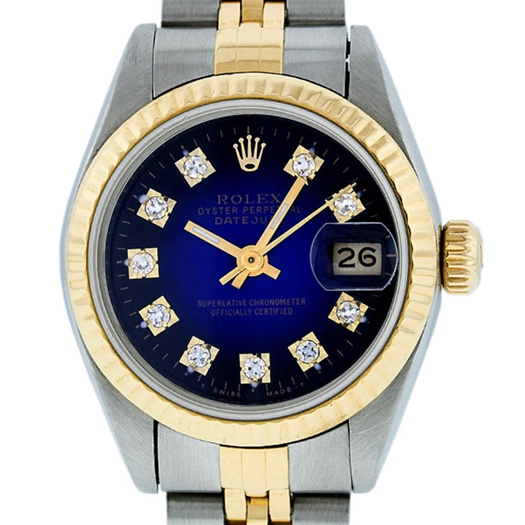 One Ladies 14K Two Tone Rolex Datejust Polished, Serviced & Electronically Tested, 14K Yellow Gold & Stainless Steel Case: 26mm, 14K Yellow Gold Crown, Bezel: 14K Yellow Gold Fluted Bezel. Custom Crystal: New Acrylic Cyclops Lens. Custom Hands: New Luminescent Hands. Movement: Automatic Winding Movement Caliber 2030. Custom Dial: Blue Vignette With Diamond Hour Markers And Dash Track, Diamond Count: 10 Diamonds, Color: G to H, Clarity: VS2-SI1. Date Window: 3 O'Clock Position Date Display, Model: Datejust. Condition: G-6 Extra Fine. Bracelet: Two Tone 14K Yellow Gold & Stainless Steel Jubilee. Bright Polish. 6.0 Inch Length, Adjustable. Standard Clasp, With Rolex Logo. This Watch Has Been Serviced Time Tested And Is In Excellent Condition It Is Free Of All Scratches And Dents.