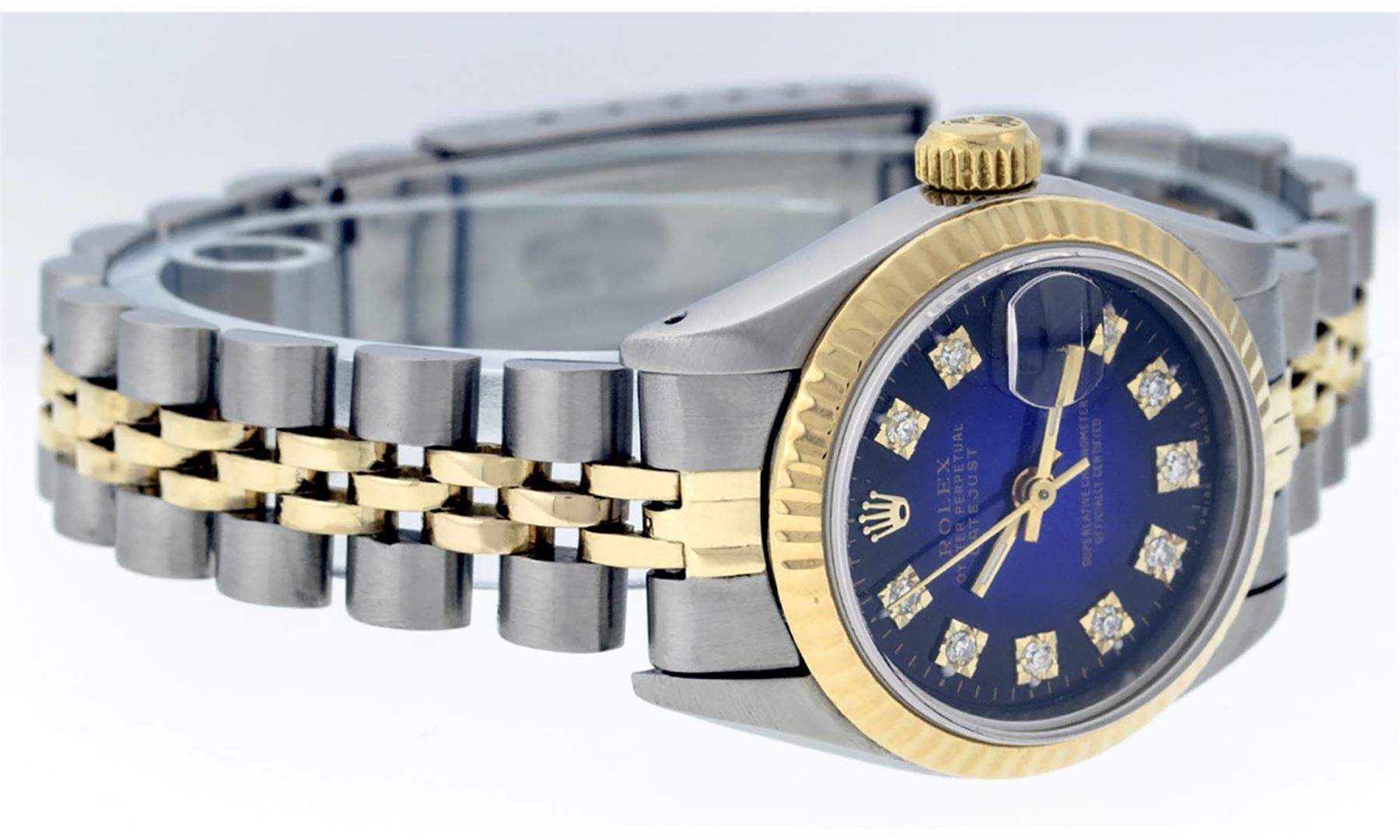 One Ladies 14K Two Tone Rolex Datejust Polished, Serviced & Electronically Tested, 14K Yellow Gold & Stainless Steel Case: 26mm, 14K Yellow Gold Crown, Bezel: 14K Yellow Gold Fluted Bezel. Custom Crystal: New Acrylic Cyclops Lens. Custom Hands: New Luminescent Hands. Movement: Automatic Winding Movement Caliber 2030. Custom Dial: Blue Vignette With Diamond Hour Markers And Dash Track, Diamond Count: 10 Diamonds, Color: G to H, Clarity: VS2-SI1. Date Window: 3 O'Clock Position Date Display, Model: Datejust. Condition: G-6 Extra Fine. Bracelet: Two Tone 14K Yellow Gold & Stainless Steel Jubilee. Bright Polish. 6.0 Inch Length, Adjustable. Standard Clasp, With Rolex Logo. This Watch Has Been Serviced Time Tested And Is In Excellent Condition It Is Free Of All Scratches And Dents.