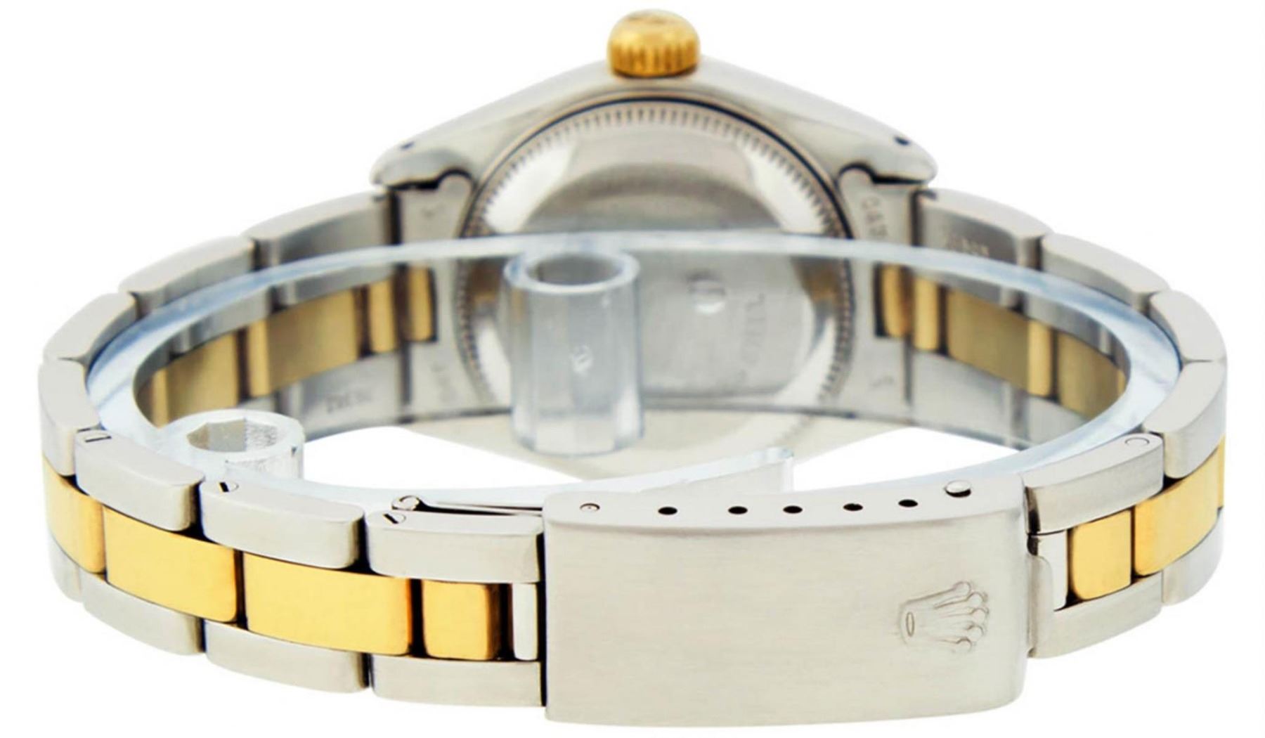 One Ladies 14K Two Tone Rolex Datejust Polished, Serviced & Electronically Tested, 14K Yellow Gold & Stainless Steel Case: 26mm, 14K Yellow Gold Crown, Bezel: 14K Yellow Gold Fluted Bezel. Custom Crystal: New Acrylic Cyclops Lens. Custom Hands: New Luminescent Hands. Movement: Automatic Winding Movement Caliber 2030. Custom Dial: Blue Vignette With Diamond Hour Markers, Diamond Count: 10 Single Cut Diamonds, Color: G to H, Clarity: VS. Date Window: 3 O'Clock Position Date Display, Model: Datejust. Condition: G-6 Extra Fine. Bracelet: Two Tone 14K Yellow Gold & Stainless Steel Jubilee. Bright Polish. 6.0 Inch Length, Adjustable. Standard Clasp, With Rolex Logo. This Watch Has Been Serviced Time Tested And Is In Excellent Condition It Is Free Of All Scratches And Dents.