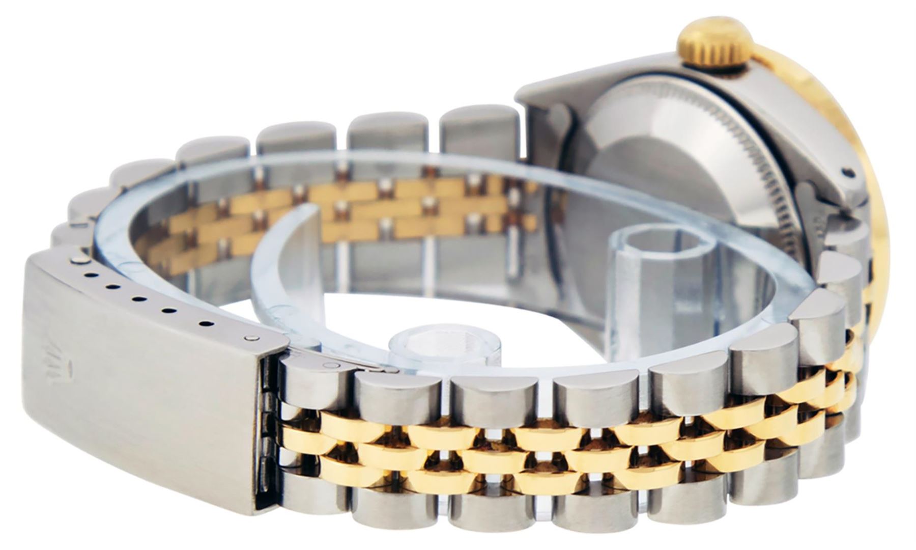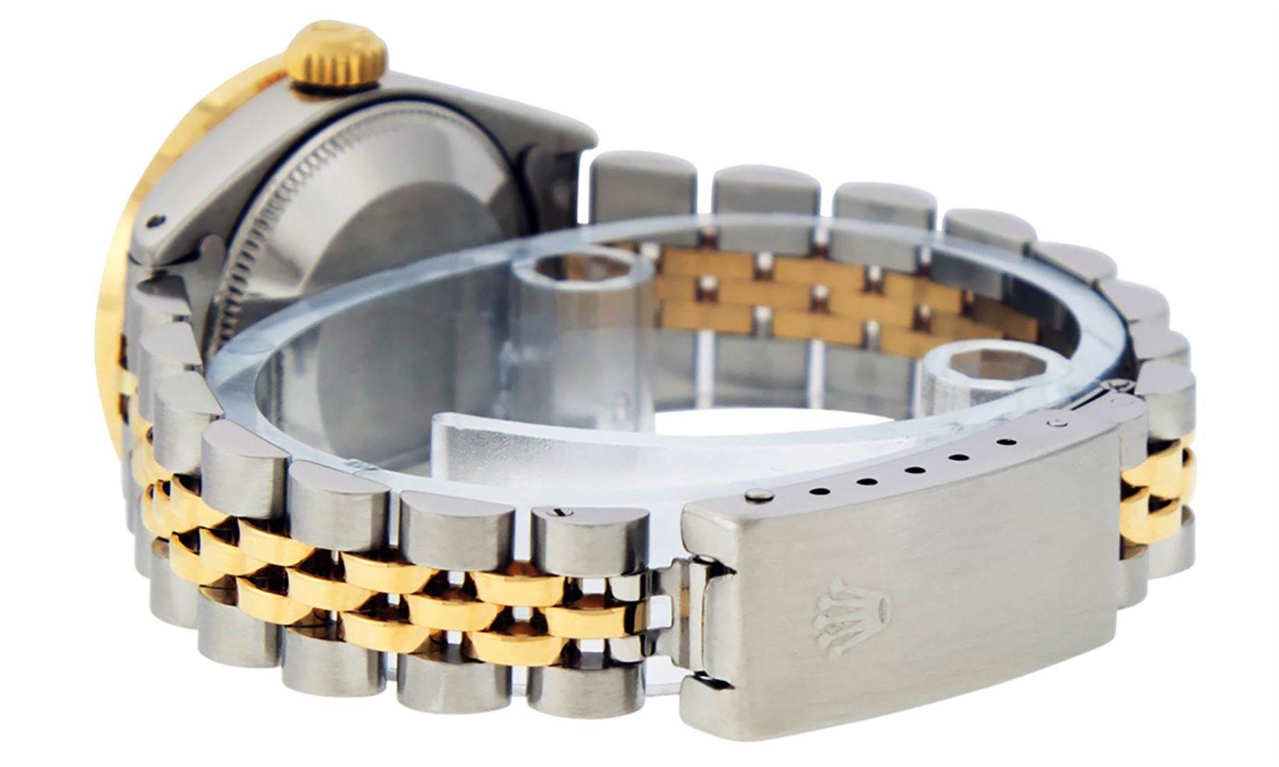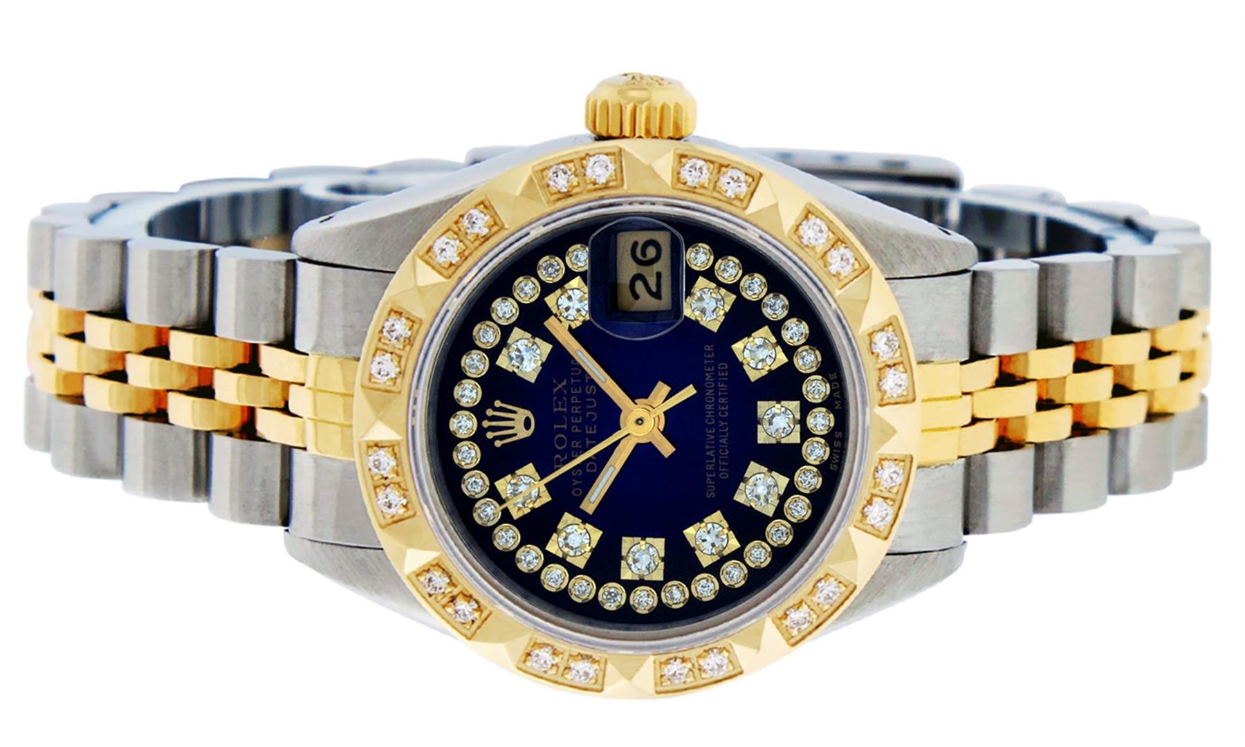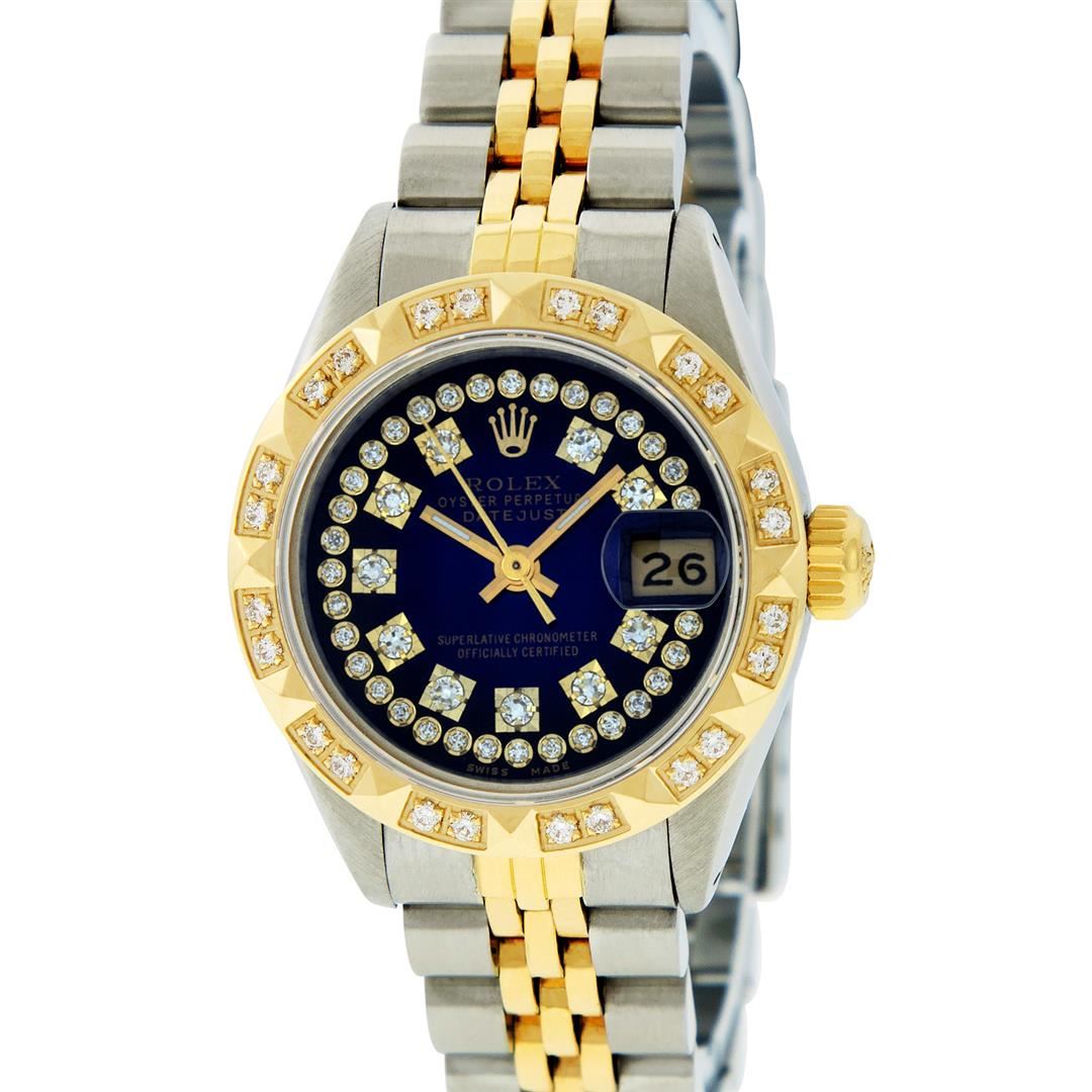 One Ladies 14 Two Tone Rolex Datejust Polished, Serviced & Electronically Tested, 14K Yellow Gold & Stainless Steel Case: 26mm, 14K Yellow Gold Crown, Custom Bezel: New 18K Yellow Gold Pyramid Diamond Bezel, Diamond Count: 24 Diamonds In Bezel, Total Weight .50 Carat, Clarity: SI-VS, Color: G to H. Custom Crystal: New Scratch Resistant Synthetic Sapphire Cyclops Lens. Custom Hands: New Luminescent Hands. Movement: Automatic Winding Movement Caliber 2030. Custom Dial: Blue Vignette String With Single Cut Diamond Hour Markers. 43 Diamonds In Dial, Clarity: SI-VS, Color: G to H. Date Window: 3 O'Clock Position Date Display, Model: Datejust. Condition: G-6 Extra Fine. Bracelet: Two Tone 14K Yellow Gold & Stainless Steel Jubilee Band. Bright Polish. 6.0 Inch Length, Adjustable. Standard Clasp, With Rolex Logo. This Watch Has Been Serviced Time Tested And Is In Excellent Condition It Is Free Of All Scratches And Dents.