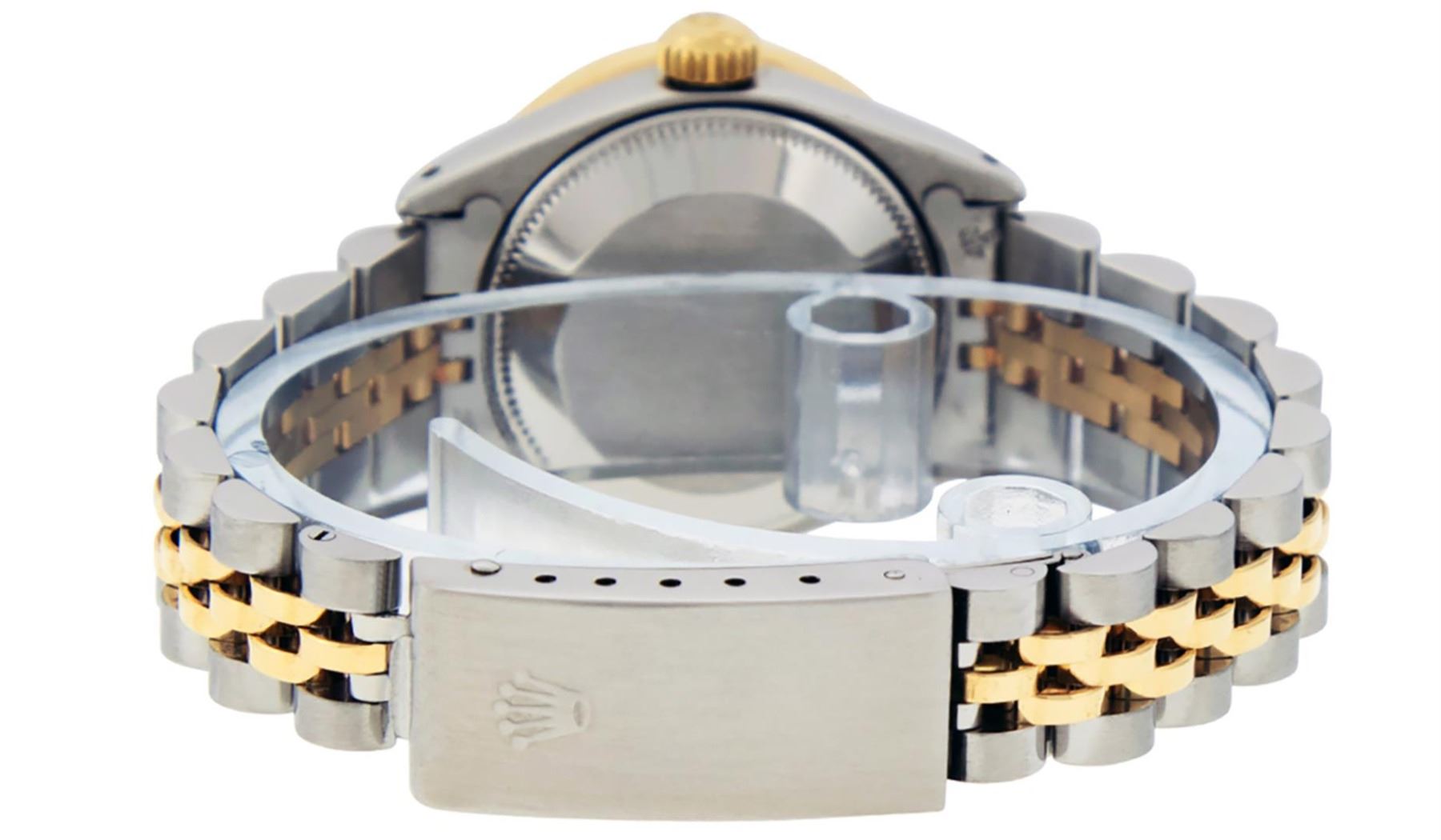 One Ladies 14 Two Tone Rolex Datejust Polished, Serviced & Electronically Tested, 14K Yellow Gold & Stainless Steel Case: 26mm, 14K Yellow Gold Crown, Custom Bezel: New 18K Yellow Gold Pyramid Diamond Bezel, Diamond Count: 24 Diamonds In Bezel, Total Weight .50 Carat, Clarity: SI-VS, Color: G to H. Custom Crystal: New Scratch Resistant Synthetic Sapphire Cyclops Lens. Custom Hands: New Luminescent Hands. Movement: Automatic Winding Movement Caliber 2030. Custom Dial: Blue Vignette String With Single Cut Diamond Hour Markers. 43 Diamonds In Dial, Clarity: SI-VS, Color: G to H. Date Window: 3 O'Clock Position Date Display, Model: Datejust. Condition: G-6 Extra Fine. Bracelet: Two Tone 14K Yellow Gold & Stainless Steel Jubilee Band. Bright Polish. 6.0 Inch Length, Adjustable. Standard Clasp, With Rolex Logo. This Watch Has Been Serviced Time Tested And Is In Excellent Condition It Is Free Of All Scratches And Dents.