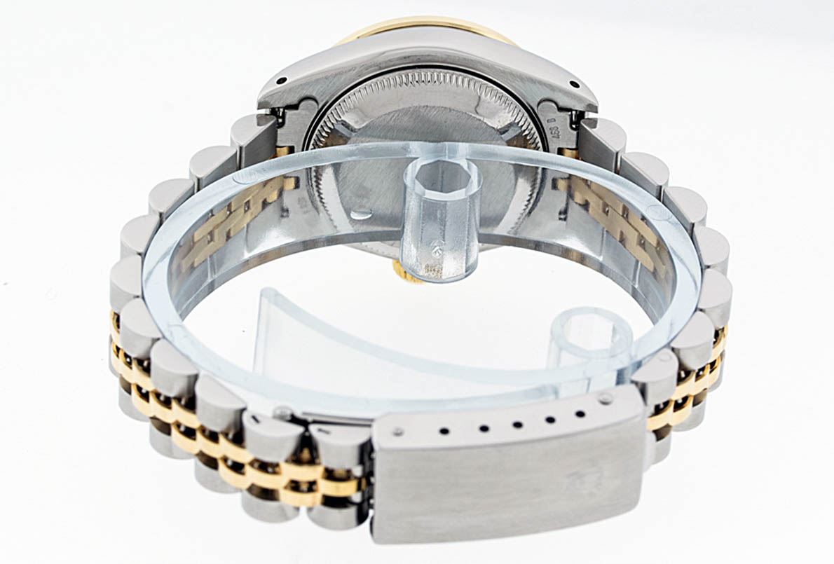 One Ladies 14K Two Tone Rolex Datejust Polished, Serviced & Electronically Tested, 14K Yellow Gold & Stainless Steel Case: 26mm, 14K Yellow Gold Crown, Custom Bezel: New 18K 1ctw Yellow Gold Beadset Diamond Bezel, Diamond Count: 42 Diamonds, Total Weight 1.00 Carat, Clarity: SI-VS, Color: G to H. Custom Crystal: New Synthetic Sapphire Cyclops Lens. Custom Hands: New Luminescent Hands. Movement: Automatic Winding Movement Caliber 2030. Custom Dial: Blue Vignette VS Diamond Dial, Diamond Count: 10 Single Cut Diamonds in Dial, G To H In Color, VS Clarity. Date Window: 3 O'Clock Position Date Display, Model: Datejust, Condition: G-6 Extra Fine. Bracelet: Two Tone 14K Yellow Gold & Stainless Steel Jubilee. Bright Polish. 6.0 Inch Length, Adjustable. Standard Clasp, With Rolex Logo. This Watch Has Been Serviced Time Tested And Is In Excellent Condition It Is Free Of All Scratches And Dents.