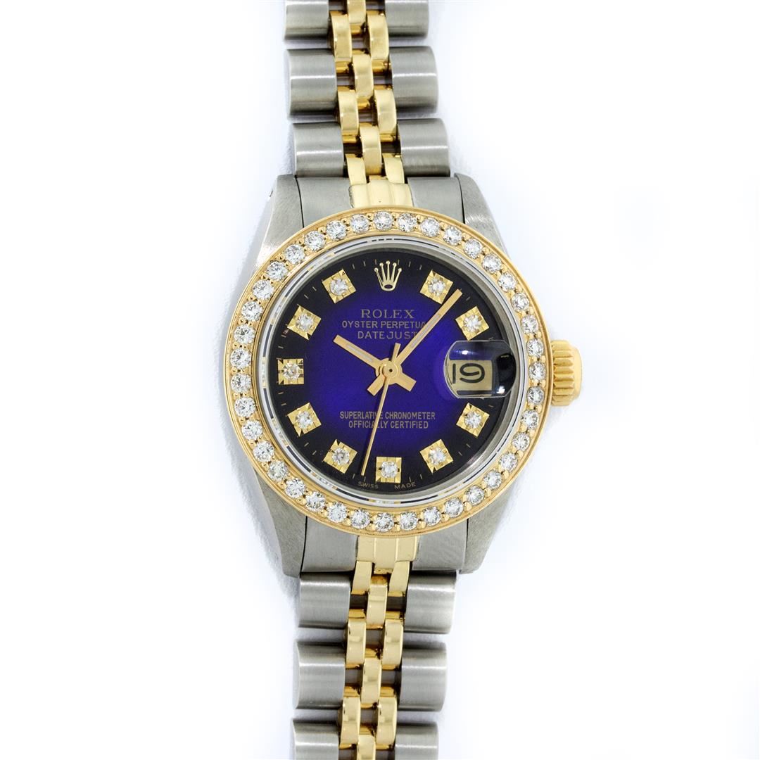 One Ladies 14K Two Tone Rolex Datejust Polished, Serviced & Electronically Tested, 14K Yellow Gold & Stainless Steel Case: 26mm, 14K Yellow Gold Crown, Custom Bezel: New 18K 1ctw Yellow Gold Beadset Diamond Bezel, Diamond Count: 42 Diamonds, Total Weight 1.00 Carat, Clarity: SI-VS, Color: G to H. Custom Crystal: New Synthetic Sapphire Cyclops Lens. Custom Hands: New Luminescent Hands. Movement: Automatic Winding Movement Caliber 2030. Custom Dial: Blue Vignette VS Diamond Dial, Diamond Count: 10 Single Cut Diamonds in Dial, G To H In Color, VS Clarity. Date Window: 3 O'Clock Position Date Display, Model: Datejust, Condition: G-6 Extra Fine. Bracelet: Two Tone 14K Yellow Gold & Stainless Steel Jubilee. Bright Polish. 6.0 Inch Length, Adjustable. Standard Clasp, With Rolex Logo. This Watch Has Been Serviced Time Tested And Is In Excellent Condition It Is Free Of All Scratches And Dents.