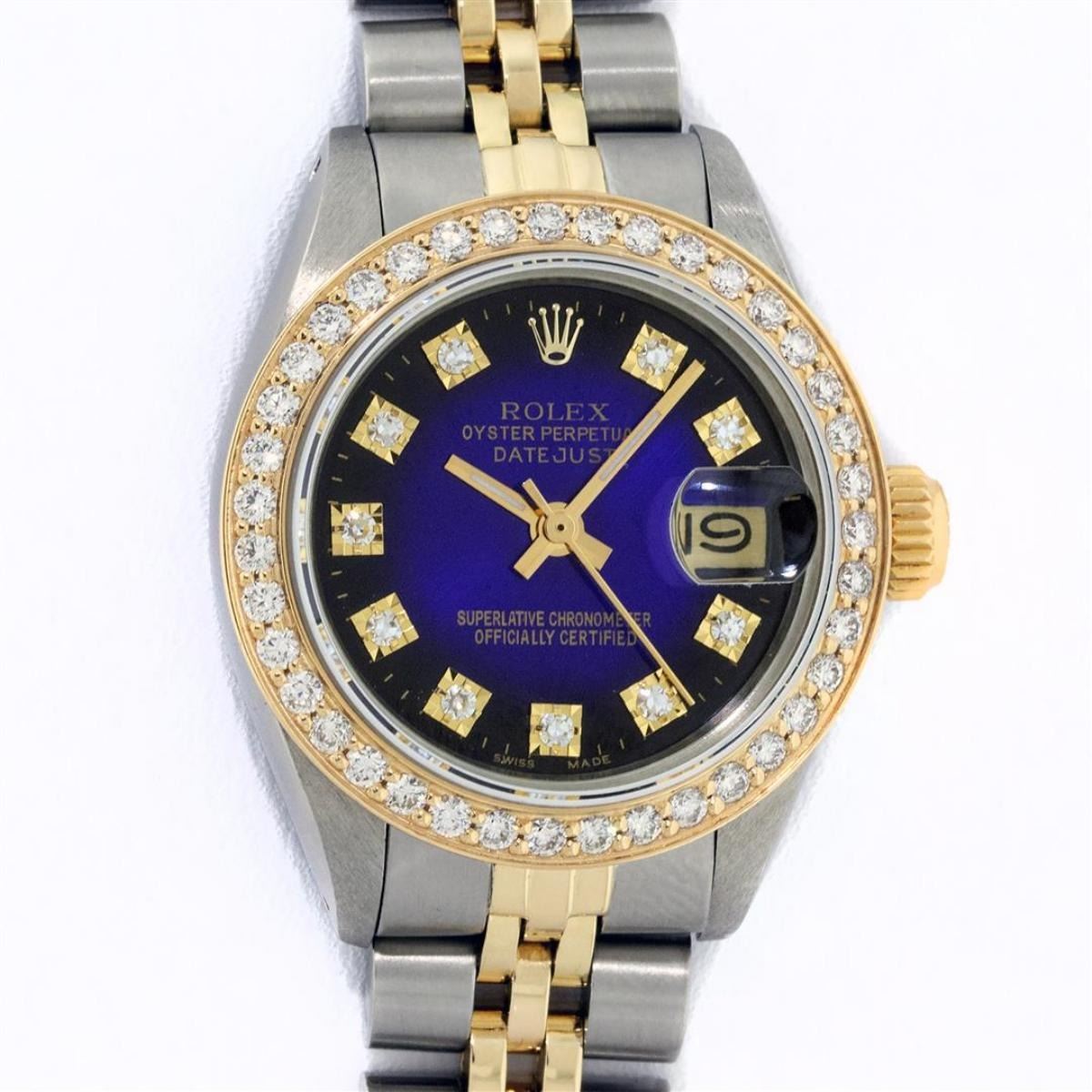 One Ladies 14K Two Tone Rolex Datejust Polished, Serviced & Electronically Tested, 14K Yellow Gold & Stainless Steel Case: 26mm, 14K Yellow Gold Crown, Custom Bezel: New 18K 1ctw Yellow Gold Beadset Diamond Bezel, Diamond Count: 42 Diamonds, Total Weight 1.00 Carat, Clarity: SI-VS, Color: G to H. Custom Crystal: New Synthetic Sapphire Cyclops Lens. Custom Hands: New Luminescent Hands. Movement: Automatic Winding Movement Caliber 2030. Custom Dial: Blue Vignette VS Diamond Dial, Diamond Count: 10 Single Cut Diamonds in Dial, G To H In Color, VS Clarity. Date Window: 3 O'Clock Position Date Display, Model: Datejust, Condition: G-6 Extra Fine. Bracelet: Two Tone 14K Yellow Gold & Stainless Steel Jubilee. Bright Polish. 6.0 Inch Length, Adjustable. Standard Clasp, With Rolex Logo. This Watch Has Been Serviced Time Tested And Is In Excellent Condition It Is Free Of All Scratches And Dents.