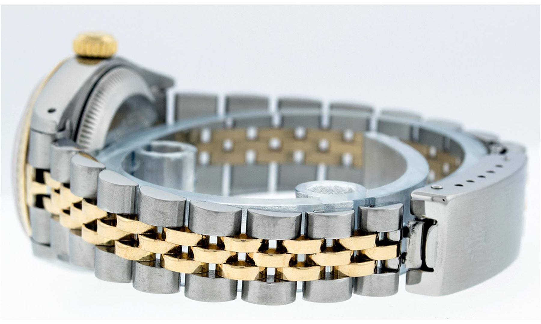 One Ladies 14K Two Tone Rolex Datejust Polished, Serviced & Electronically Tested, 14K Yellow Gold & Stainless Steel Case: 26mm, 14K Yellow Gold Crown, Bezel: 14K Yellow Gold Fluted Bezel. Custom Crystal: New Acrylic Cyclops Lens. Custom Hands: New Luminescent Hands. Movement: Automatic Winding Movement Caliber 2030. Custom Dial: Champagne With Diamond Hour Markers, Diamond Count: 10 Diamonds In Dial, Color: G to H, Clarity: VS2-SI1. Date Window: 3 O'Clock Position Date Display, Model: Datejust. Condition: G-6 Extra Fine. Bracelet: Two Tone 14K Yellow Gold & Stainless Steel Jubilee. Bright Polish. 6.0 Inch Length, Adjustable. Standard Clasp, With Rolex Logo. This Watch Has Been Serviced Time Tested And Is In Excellent Condition It Is Free Of All Scratches And Dents.