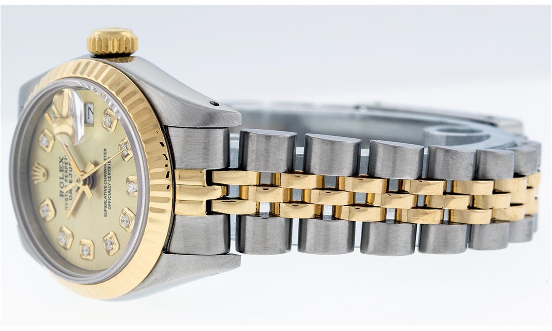 One Ladies 14K Two Tone Rolex Datejust Polished, Serviced & Electronically Tested, 14K Yellow Gold & Stainless Steel Case: 26mm, 14K Yellow Gold Crown, Bezel: 14K Yellow Gold Fluted Bezel. Custom Crystal: New Acrylic Cyclops Lens. Custom Hands: New Luminescent Hands. Movement: Automatic Winding Movement Caliber 2030. Custom Dial: Champagne With Diamond Hour Markers, Diamond Count: 10 Diamonds In Dial, Color: G to H, Clarity: VS2-SI1. Date Window: 3 O'Clock Position Date Display, Model: Datejust. Condition: G-6 Extra Fine. Bracelet: Two Tone 14K Yellow Gold & Stainless Steel Jubilee. Bright Polish. 6.0 Inch Length, Adjustable. Standard Clasp, With Rolex Logo. This Watch Has Been Serviced Time Tested And Is In Excellent Condition It Is Free Of All Scratches And Dents.