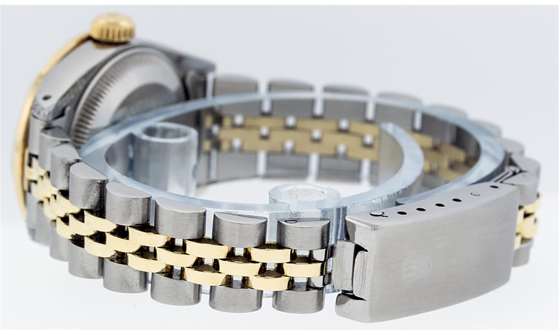 One Ladies 14K Two Tone Rolex Datejust Polished, Serviced & Electronically Tested, 14K Yellow Gold & Stainless Steel Case: 26mm, 14K Yellow Gold Crown, Diamond Lugs: 24 Diamonds On Lugs, Clarity: SI-VS, Color: G to H. Custom Bezel: New 18K Yellow Gold Beadset Diamond Bezel, Diamond Count: 32 Diamonds In Dial, Total Weight .50 Carat, Clarity: SI-VS, Color: G to H. Custom Crystal: New Synthetic Sapphire Cyclops Lens. Custom Hands: New Luminescent Hands. Movement: Automatic Winding Movement Caliber 2030. Custom Dial: Champagne With String Single Cut Diamond Hour Markers, Diamond Count: 43 Diamonds In Dial, Clarity: SI-VS, Color: G to H. Date Window: 3 O'Clock Position Date Display, Model: Datejust. Condition: G-6 Extra Fine. Bracelet: Two Tone 14K Yellow Gold & Stainless Steel Jubilee Band. Bright Polish. 6.0 Inch Length, Adjustable. Standard Clasp, With Rolex Logo. This Watch Has Been Serviced Time Tested And Is In Excellent Condition It Is Free Of All Scratches And Dents.