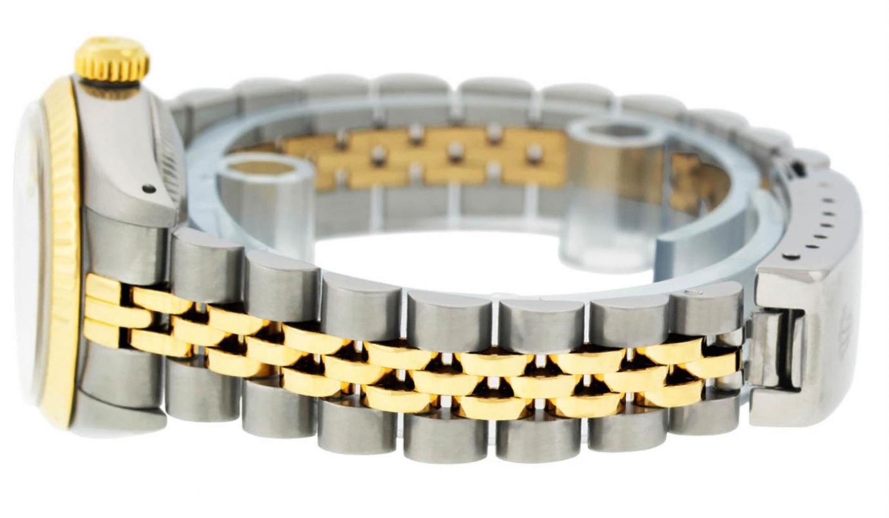 One Ladies 14K Two Tone Rolex Datejust Polished, Serviced & Electronically Tested, 14K Yellow Gold & Stainless Steel Case: 26mm, 14K Yellow Gold Crown, Bezel: 14K Yellow Gold Fluted Bezel. Custom Crystal: Acrylic Cyclops Lens. Custom Hands: New Luminescent Hands. Movement: Automatic Winding Movement Caliber 2030. Dial: Champagne Index With Luminecent Dots. Date Window: 3 O'Clock Position Date Display, Model: Datejust. Condition: G-6 Extra Fine. Bracelet: Two Tone 14K Yellow Gold & Stainless Steel Jubilee. Bright Polish. 6.0 Inch Length, Adjustable. Standard Clasp, With Rolex Logo. This Watch Has Been Serviced Time Tested And Is In Excellent Condition It Is Free Of All Scratches And Dents.