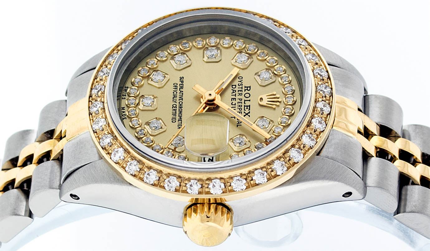 One Ladies 14K Two Tone Rolex Datejust Polished, Serviced & Electronically Tested, 14K Yellow Gold & Stainless Steel Case: 26mm, 14K Yellow Gold Crown, Custom Bezel: New 18K Yellow Gold Beadset Diamond Bezel, Diamond Count: 32 Diamonds Total Weight .70 Carat, Clarity: SI-VS, Color: G to H. Custom Crystal: New Synthetic Sapphire Cyclops Lens. Custom Hands: New Luminescent Hands. Movement: Automatic Winding Movement Caliber 2030. Custom Dial: Champagne String Diamond Dial, Diamond Count: 43 Diamonds, Clarity: SI-VS, Color: G to H. Date Window: 3 O'Clock Position Date Display, Model: Datejust. Condition: G-6 Extra Fine. Bracelet:Two Tone 14K Yellow Gold & Stainless Steel Jubilee. Bright Polish. 6.0 Inch Length, Adjustable. Standard Clasp, With Rolex Logo. This Watch Has Been Serviced Time Tested And Is In Excellent Condition It Is Free Of All Scratches And Dents.