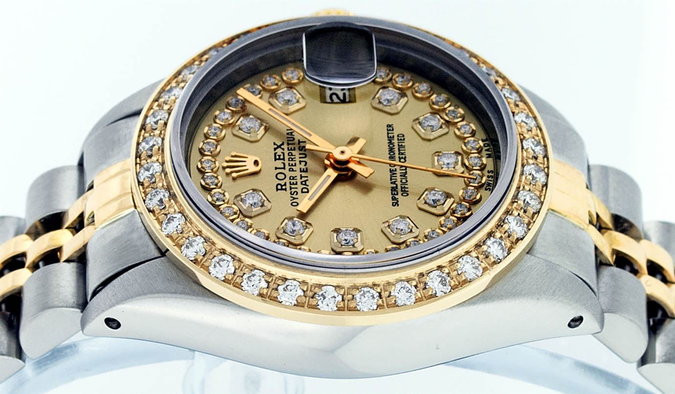 One Ladies 14K Two Tone Rolex Datejust Polished, Serviced & Electronically Tested, 14K Yellow Gold & Stainless Steel Case: 26mm, 14K Yellow Gold Crown, Custom Bezel: New 18K Yellow Gold Beadset Diamond Bezel, Diamond Count: 32 Diamonds Total Weight .70 Carat, Clarity: SI-VS, Color: G to H. Custom Crystal: New Synthetic Sapphire Cyclops Lens. Custom Hands: New Luminescent Hands. Movement: Automatic Winding Movement Caliber 2030. Custom Dial: Champagne String Diamond Dial, Diamond Count: 43 Diamonds, Clarity: SI-VS, Color: G to H. Date Window: 3 O'Clock Position Date Display, Model: Datejust. Condition: G-6 Extra Fine. Bracelet:Two Tone 14K Yellow Gold & Stainless Steel Jubilee. Bright Polish. 6.0 Inch Length, Adjustable. Standard Clasp, With Rolex Logo. This Watch Has Been Serviced Time Tested And Is In Excellent Condition It Is Free Of All Scratches And Dents.