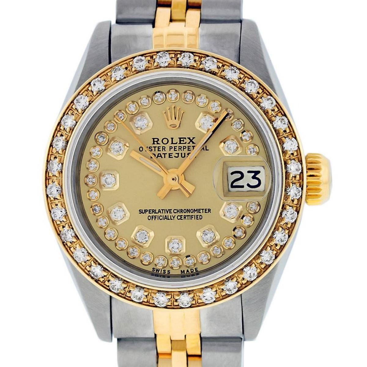 One Ladies 14K Two Tone Rolex Datejust Polished, Serviced & Electronically Tested, 14K Yellow Gold & Stainless Steel Case: 26mm, 14K Yellow Gold Crown, Custom Bezel: New 18K Yellow Gold Beadset Diamond Bezel, Diamond Count: 32 Diamonds Total Weight .70 Carat, Clarity: SI-VS, Color: G to H. Custom Crystal: New Synthetic Sapphire Cyclops Lens. Custom Hands: New Luminescent Hands. Movement: Automatic Winding Movement Caliber 2030. Custom Dial: Champagne String Diamond Dial, Diamond Count: 43 Diamonds, Clarity: SI-VS, Color: G to H. Date Window: 3 O'Clock Position Date Display, Model: Datejust. Condition: G-6 Extra Fine. Bracelet:Two Tone 14K Yellow Gold & Stainless Steel Jubilee. Bright Polish. 6.0 Inch Length, Adjustable. Standard Clasp, With Rolex Logo. This Watch Has Been Serviced Time Tested And Is In Excellent Condition It Is Free Of All Scratches And Dents.