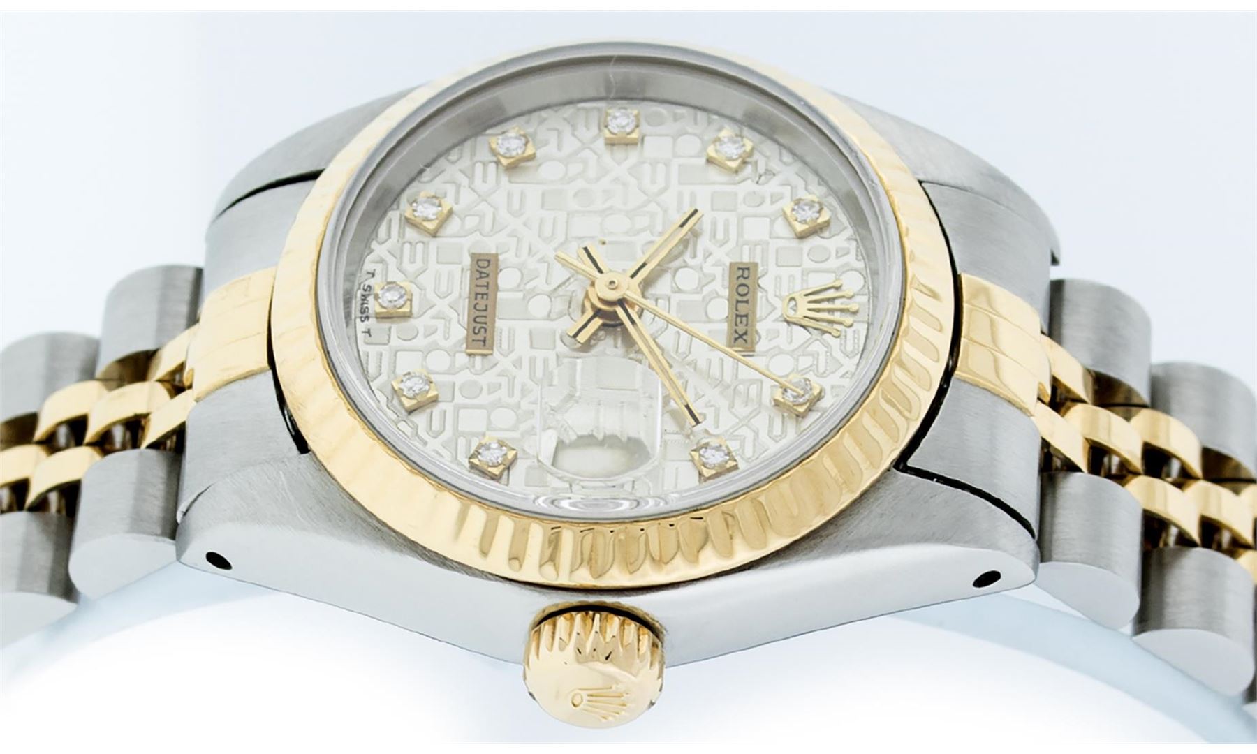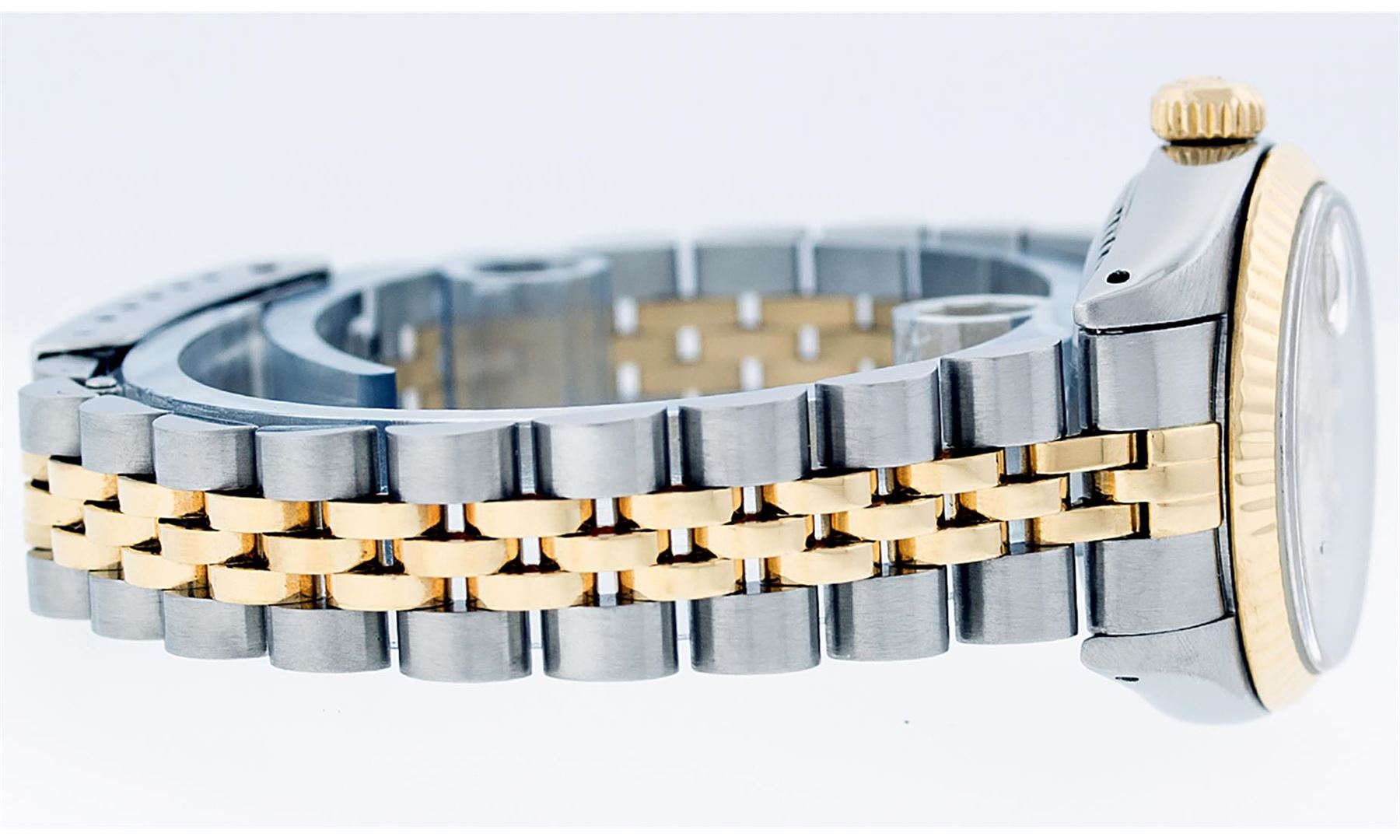 One Ladies 14K Two Tone Rolex Datejust Polished, Serviced & Electronically Tested, 14K Yellow Gold & Stainless Steel Case: 26mm, 14K Yellow Gold Crown, Bezel: 14K Yellow Gold Fluted Bezel. Custom Crystal: New Acrylic Cyclops Lens. Custom Hands: New Luminescent Hands. Movement: Automatic Winding Movement Caliber 2030. Custom Dial: Cream Jubilee With Single Cut Diamond Hour Markers, Diamond Count: 10 Diamonds In Dial, Color: G to H, Clarity: VS2. Date Window: 3 O'Clock Position Date Display, Model: Datejust. Condition: G-6 Extra Fine. Bracelet: Two Tone 14K Yellow Gold & Stainless Steel Jubilee Band. Bright Polish. 6.0 Inch Length, Adjustable. Standard Clasp, With Rolex Logo. This Watch Has Been Serviced Time Tested And Is In Excellent Condition It Is Free Of All Scratches And Dents.