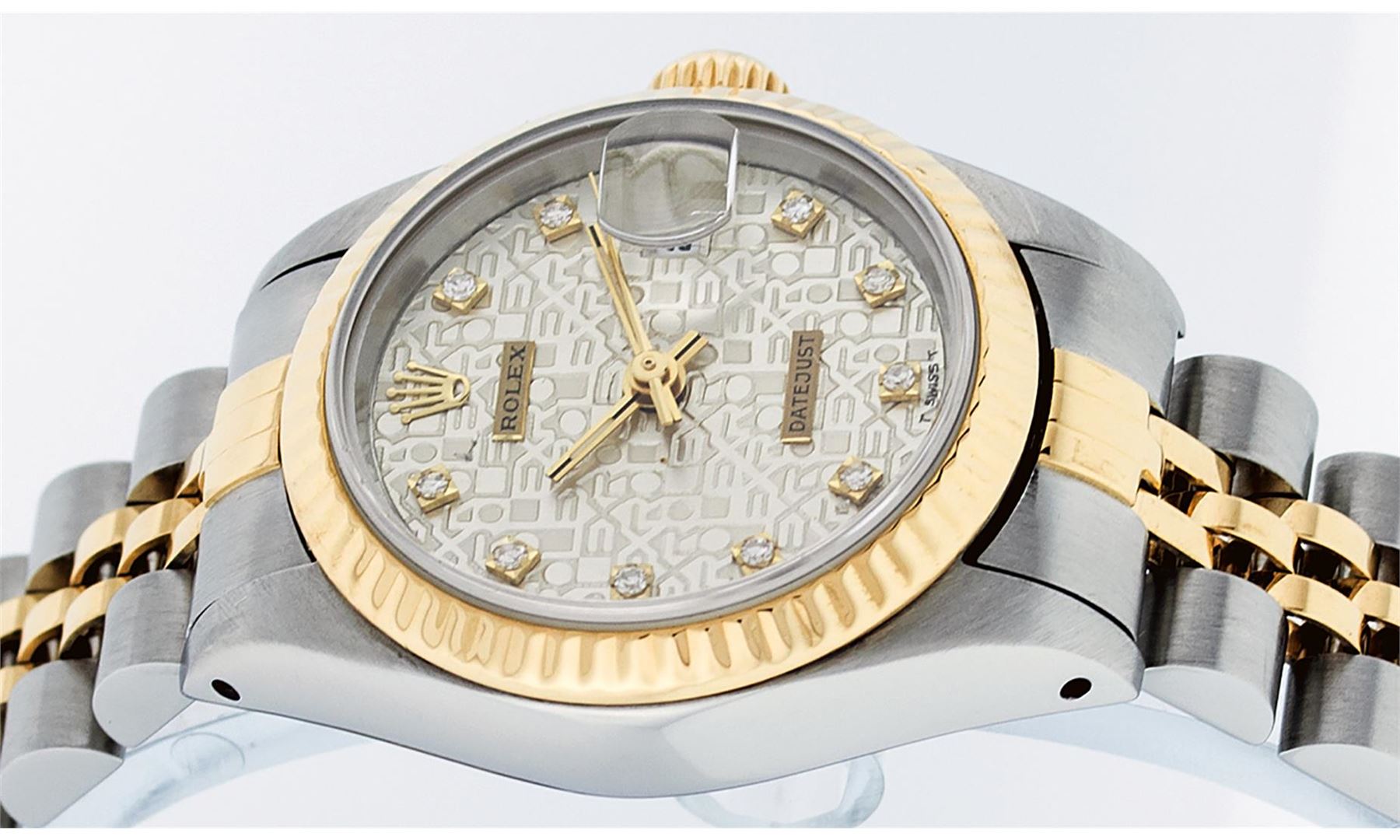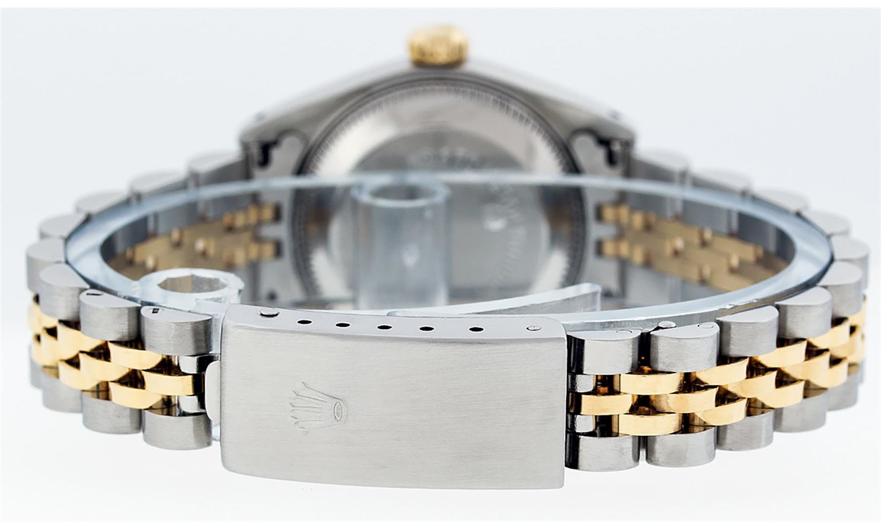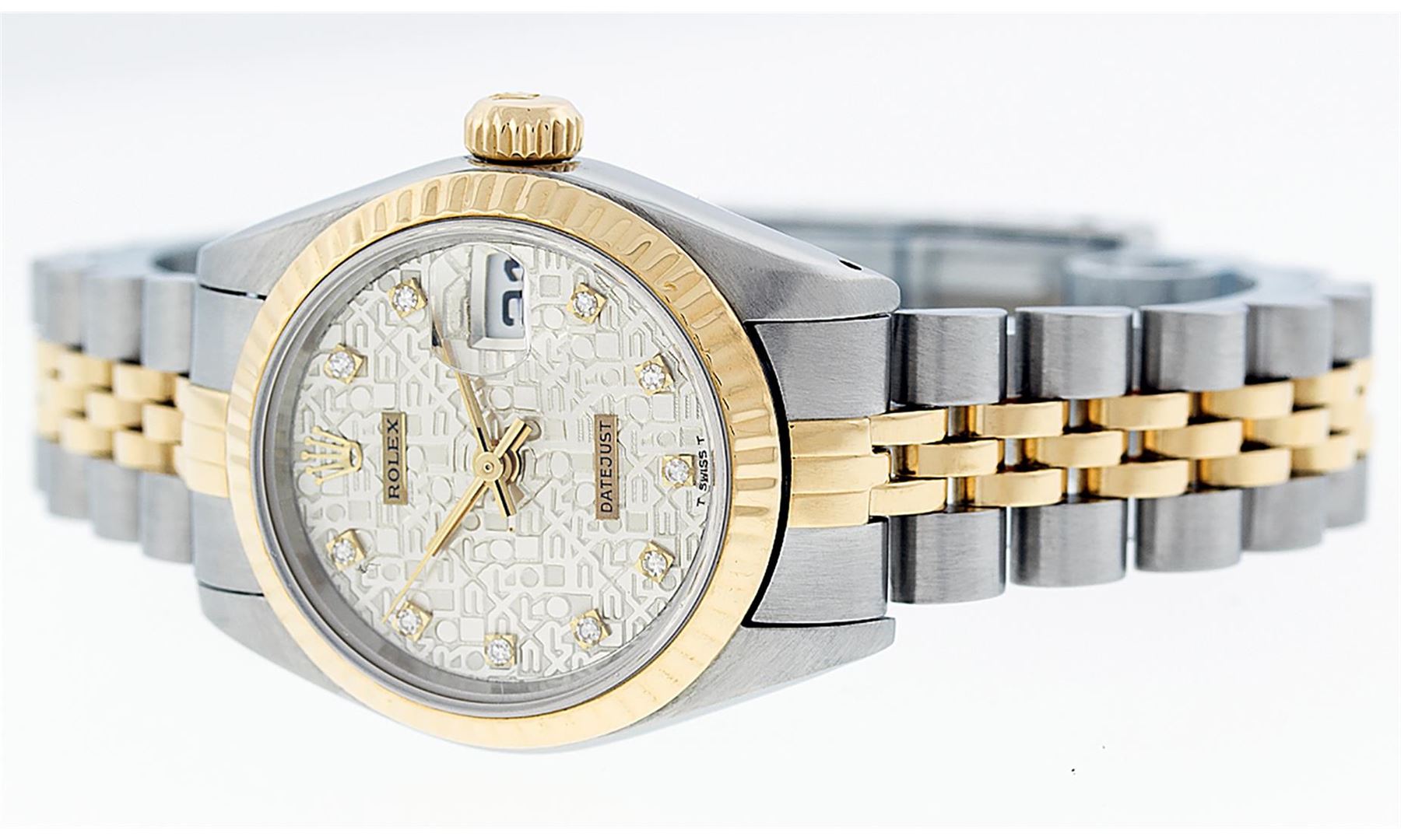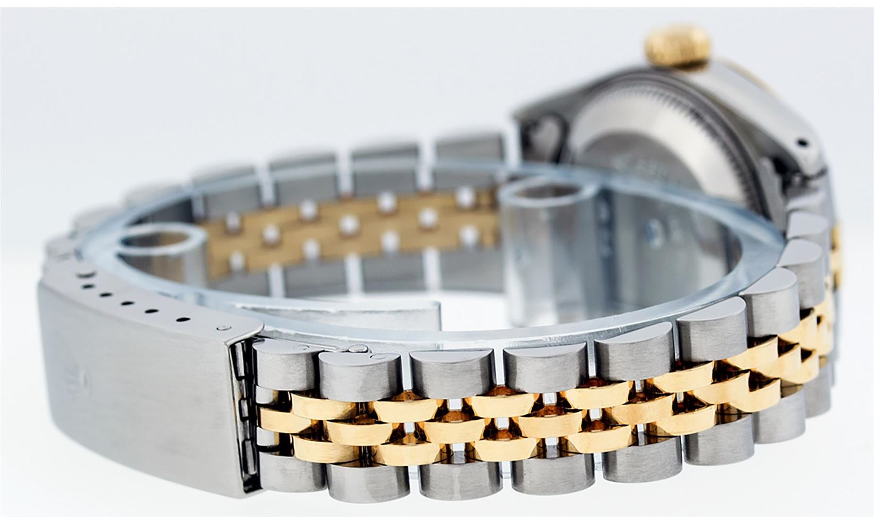 One Ladies 14K Two Tone Rolex Datejust Polished, Serviced & Electronically Tested, 14K Yellow Gold & Stainless Steel Case: 26mm, 14K Yellow Gold Crown, Bezel: 14K Yellow Gold Fluted Bezel. Custom Crystal: New Acrylic Cyclops Lens. Custom Hands: New Luminescent Hands. Movement: Automatic Winding Movement Caliber 2030. Custom Dial: Cream Jubilee With Single Cut Diamond Hour Markers, Diamond Count: 10 Diamonds In Dial, Color: G to H, Clarity: VS2. Date Window: 3 O'Clock Position Date Display, Model: Datejust. Condition: G-6 Extra Fine. Bracelet: Two Tone 14K Yellow Gold & Stainless Steel Jubilee Band. Bright Polish. 6.0 Inch Length, Adjustable. Standard Clasp, With Rolex Logo. This Watch Has Been Serviced Time Tested And Is In Excellent Condition It Is Free Of All Scratches And Dents.