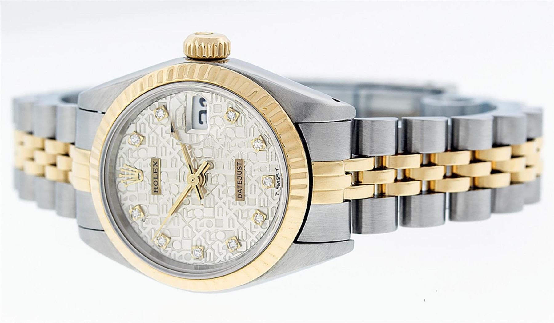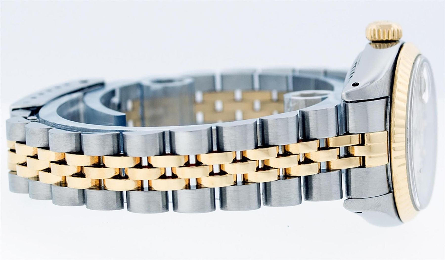 One Ladies 14K Two Tone Rolex Datejust Polished, Serviced & Electronically Tested, 14K Yellow Gold & Stainless Steel Case: 26mm, 14K Yellow Gold Crown, Bezel: 14K Yellow Gold Fluted Bezel. Custom Crystal: New Acrylic Cyclops Lens. Custom Hands: New Luminescent Hands. Movement: Automatic Winding Movement Caliber 2030. Custom Dial: Cream Jubilee With Single Cut Diamond Hour Markers, Diamond Count: 10 Diamonds In Dial, Color: G to H, Clarity: VS2. Date Window: 3 O'Clock Position Date Display, Model: Datejust. Condition: G-6 Extra Fine. Bracelet: Two Tone 14K Yellow Gold & Stainless Steel Jubilee Band. Bright Polish. 6.0 Inch Length, Adjustable. Standard Clasp, With Rolex Logo. This Watch Has Been Serviced Time Tested And Is In Excellent Condition It Is Free Of All Scratches And Dents.