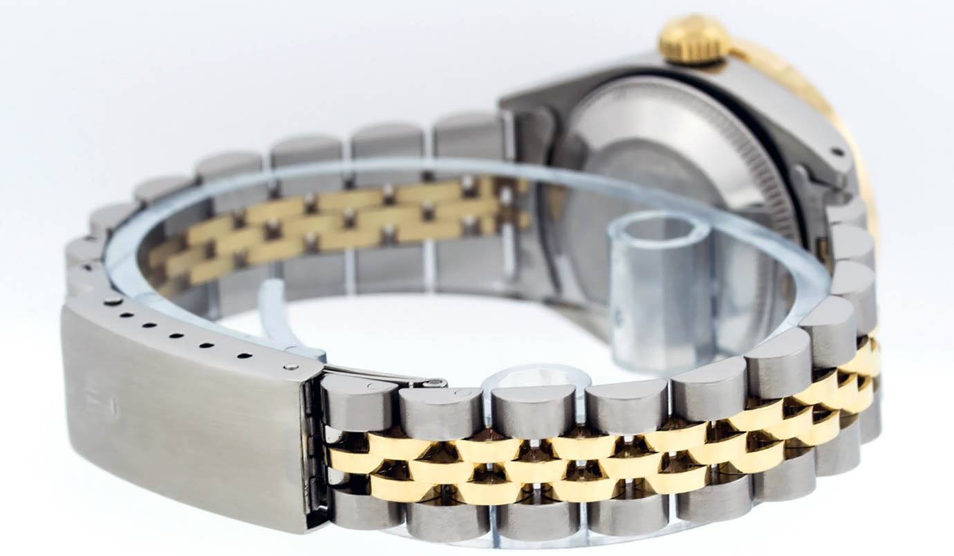 One Ladies 14K Two Tone Rolex Datejust Polished, Serviced & Electronically Tested, 14K Yellow Gold & Stainless Steel Case: 26mm, 14K Yellow Gold Crown, Custom Bezel: New 18K Yellow Gold Pyramid Diamond Bezel, Diamond Count: 24 Diamonds In Bezel. Total Weight .50 Carat, Clarity: SI-VS, Color: G to H. Custom Crystal: New Synthetic Sapphire Cyclops Lens. Custom Hands: New Luminescent Hands. Movement: Automatic Winding Movement Caliber 2030. Custom Dial: Slate Grey With Roman Hour Markers. Date Window: 3 O'Clock Position Date Display, Model: Datejust. Condition: G-6 Extra Fine The Watch Is In Very Good Condition Free Of All Scratches And Dents. . Bracelet: Two Tone 14K Yellow Gold & Stainless Steel Jubilee. Bright Polish. 6.0 Inch Length, Adjustable. Standard Clasp, With Rolex Logo. This Watch Has Been Serviced Time Tested And Is In Excellent Condition It Is Free Of All Scratches And Dents.