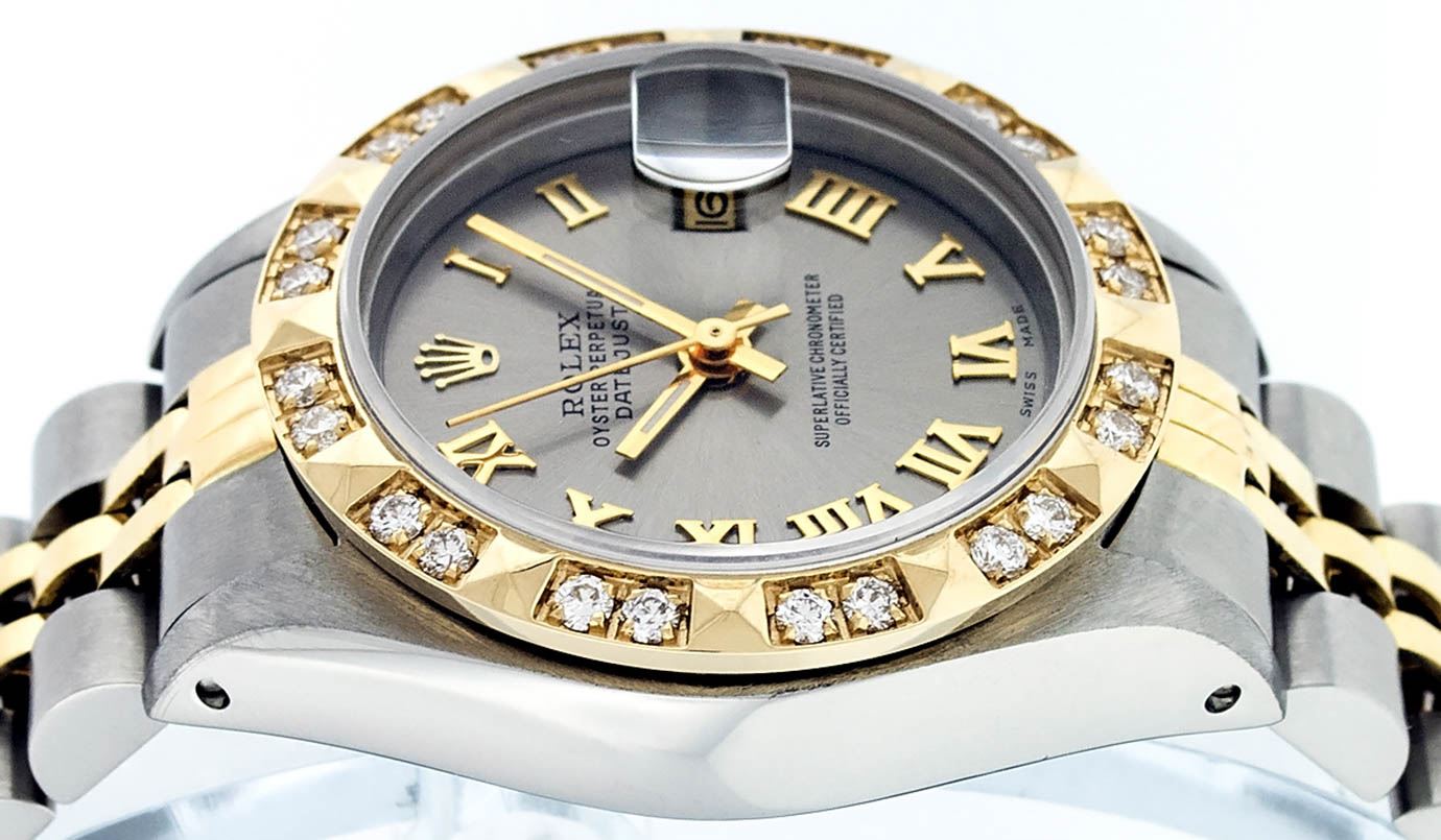 One Ladies 14K Two Tone Rolex Datejust Polished, Serviced & Electronically Tested, 14K Yellow Gold & Stainless Steel Case: 26mm, 14K Yellow Gold Crown, Custom Bezel: New 18K Yellow Gold Pyramid Diamond Bezel, Diamond Count: 24 Diamonds In Bezel. Total Weight .50 Carat, Clarity: SI-VS, Color: G to H. Custom Crystal: New Synthetic Sapphire Cyclops Lens. Custom Hands: New Luminescent Hands. Movement: Automatic Winding Movement Caliber 2030. Custom Dial: Slate Grey With Roman Hour Markers. Date Window: 3 O'Clock Position Date Display, Model: Datejust. Condition: G-6 Extra Fine The Watch Is In Very Good Condition Free Of All Scratches And Dents. . Bracelet: Two Tone 14K Yellow Gold & Stainless Steel Jubilee. Bright Polish. 6.0 Inch Length, Adjustable. Standard Clasp, With Rolex Logo. This Watch Has Been Serviced Time Tested And Is In Excellent Condition It Is Free Of All Scratches And Dents.